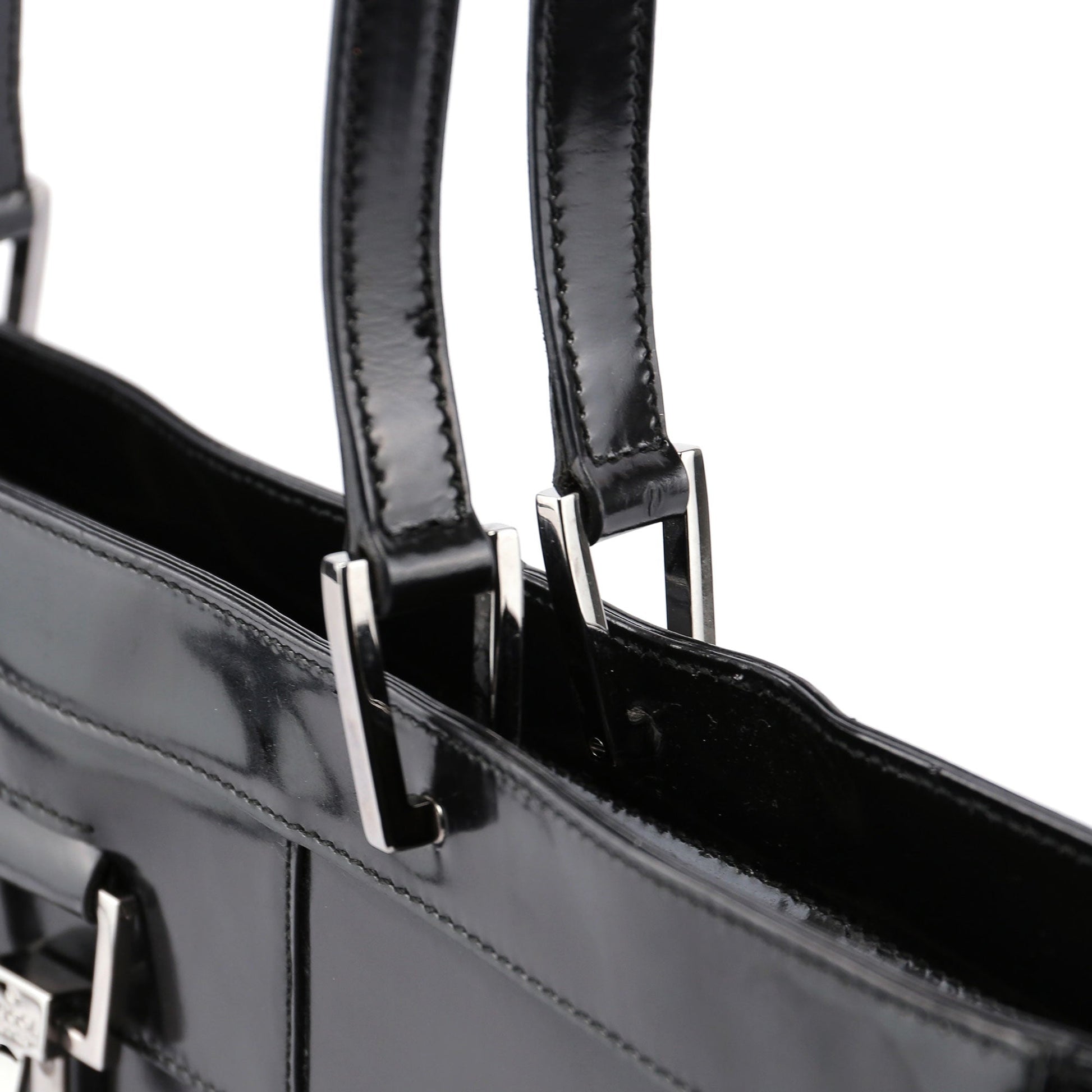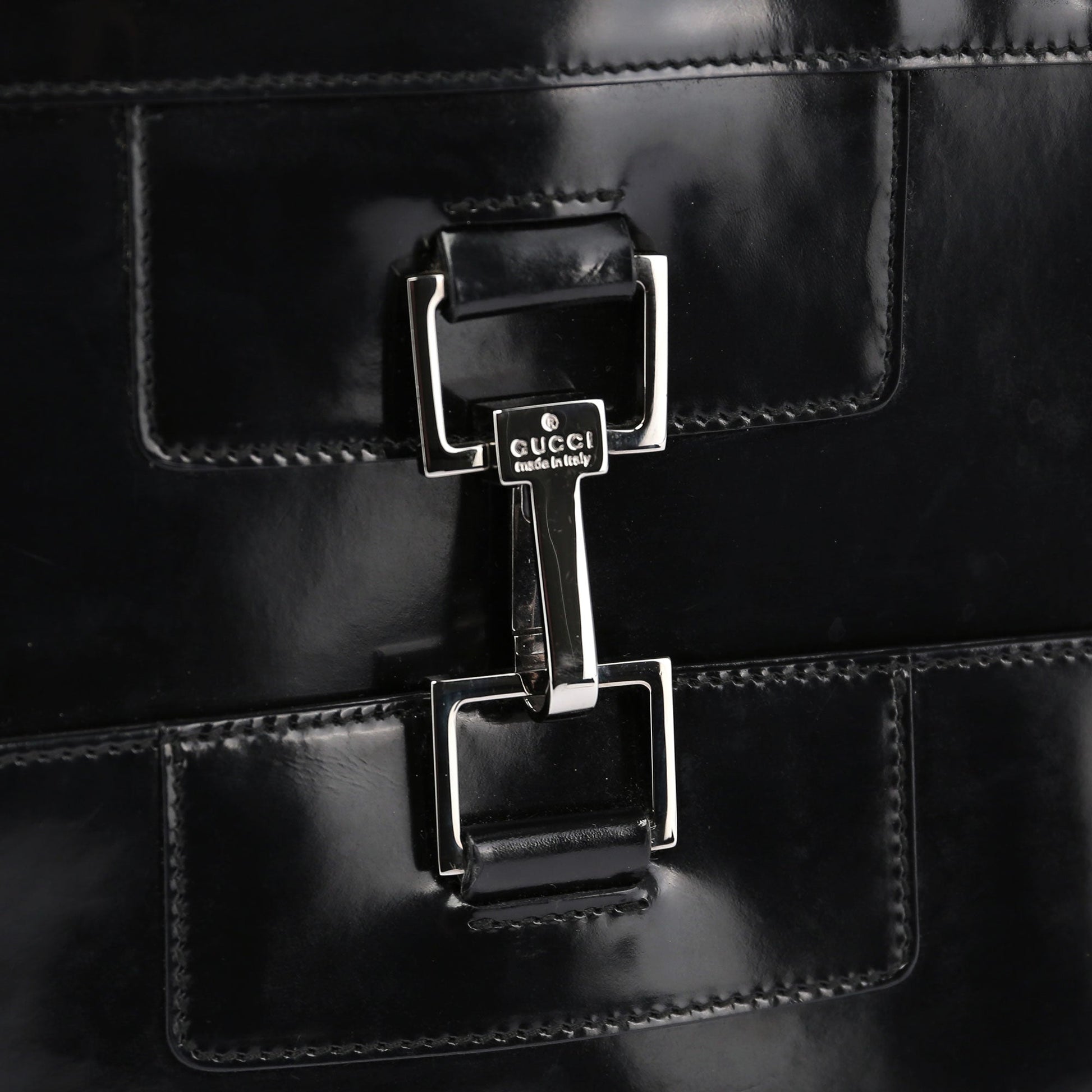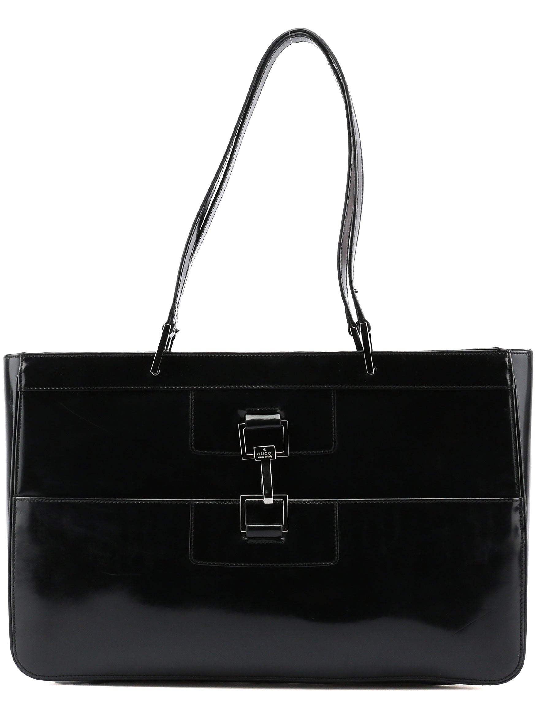 Designed by Tom Ford in the late 1990s, the Gucci Jackie tote epitomizes timeless elegance. Handcrafted in black patent leather, it features silver-tone hardware delicately engraved with the Gucci logo. The iconic Jackie clasp closure adds a touch of sophistication, while the satin-lined interior boasts a convenient zipper pocket for organization.