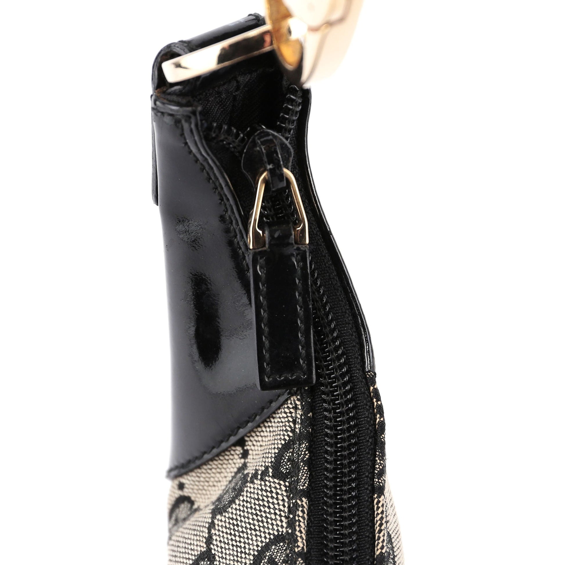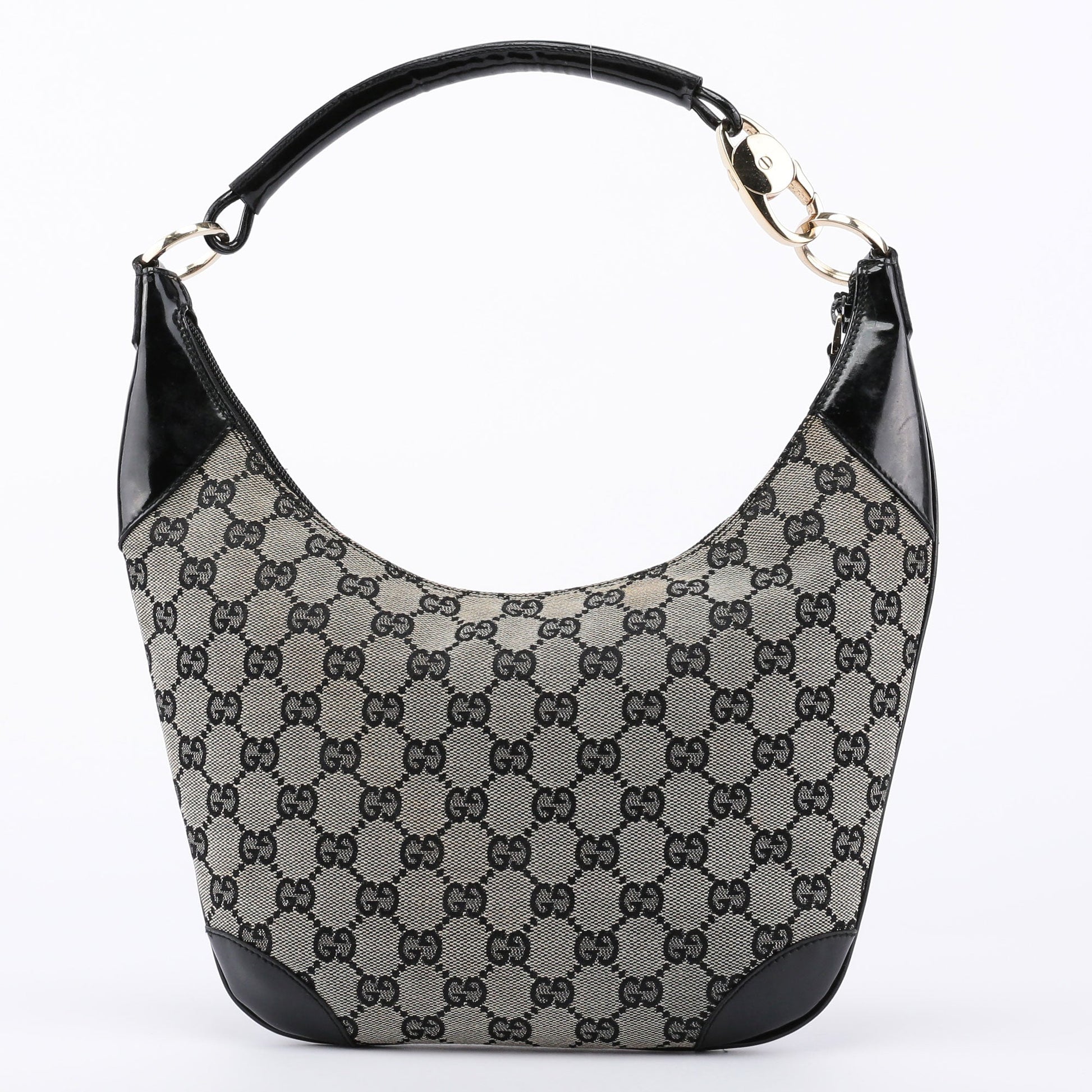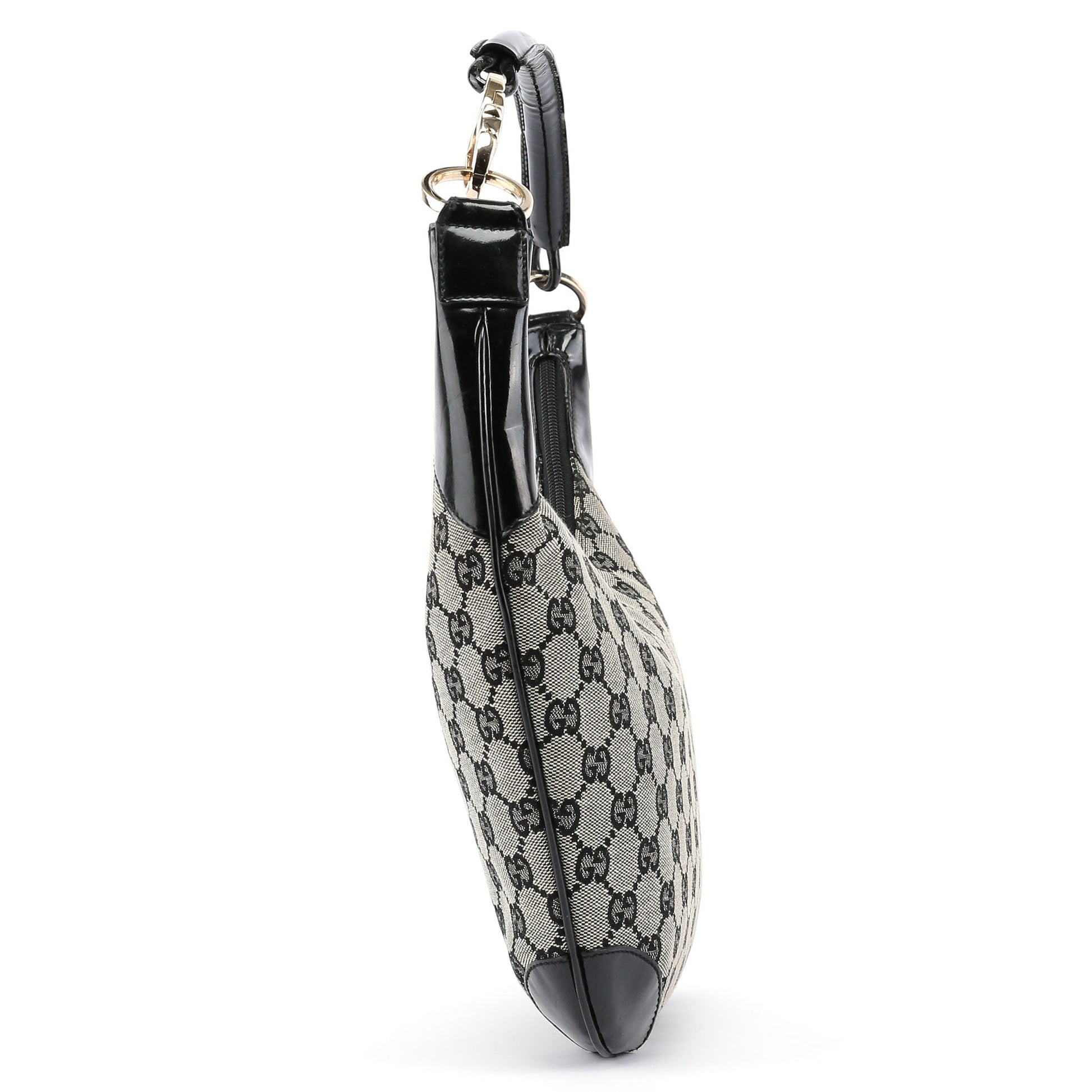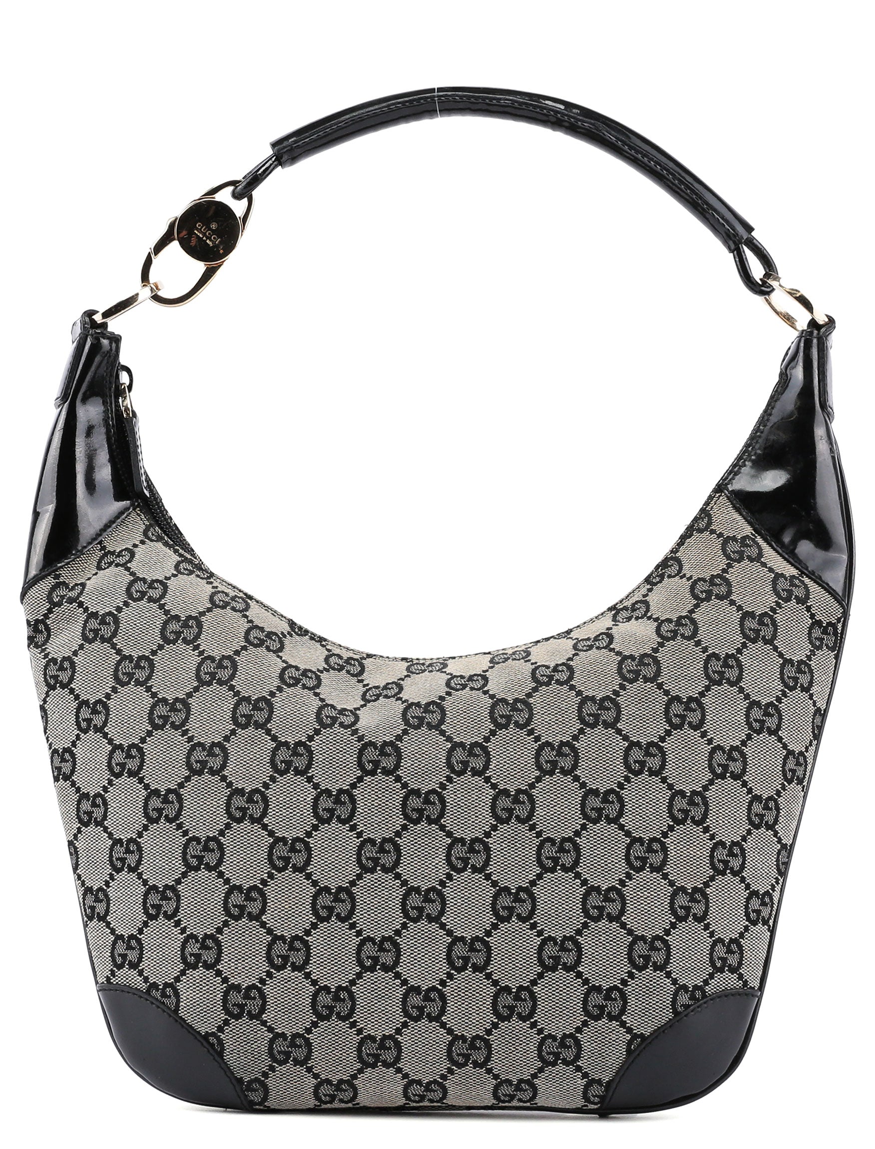 This Gucci GG shoulder bag, designed by Tom Ford in the late 1990s, combines grey GG monogram canvas with black patent leather trim and gold-tone Gucci-engraved hardware. It features a satin-lined interior with an interior zipper pocket and zipper closure.