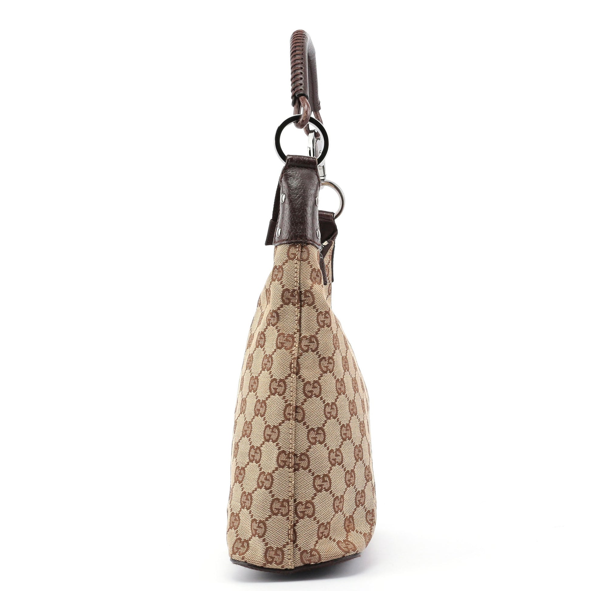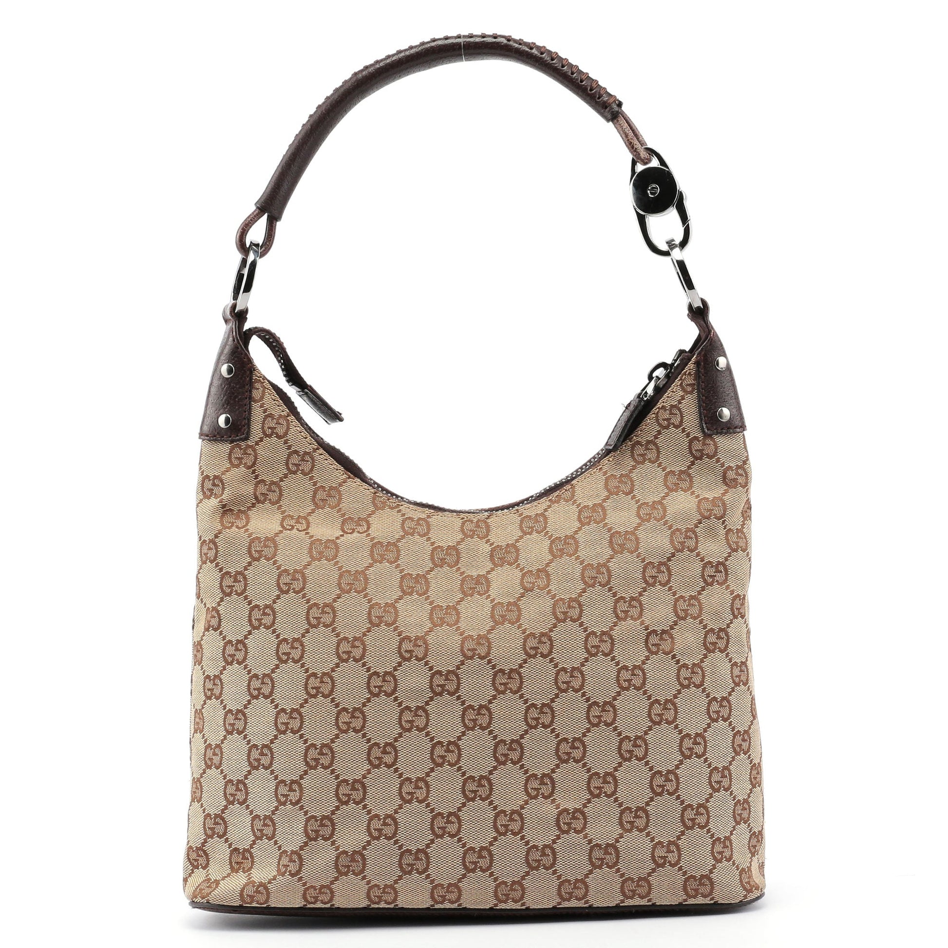 Designed by Tom Ford in the late '90s, this Gucci GG monogram bag is handcrafted from beige canvas with brown leather trim and silver-tone hardware engraved with the Gucci logo. It features a zipper closure, a cotton-lined interior, and an interior zipper pocket, showcasing timeless style and functional elegance.