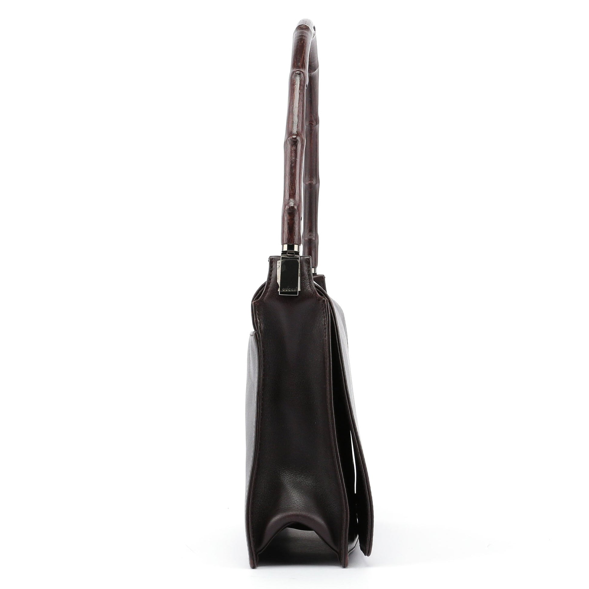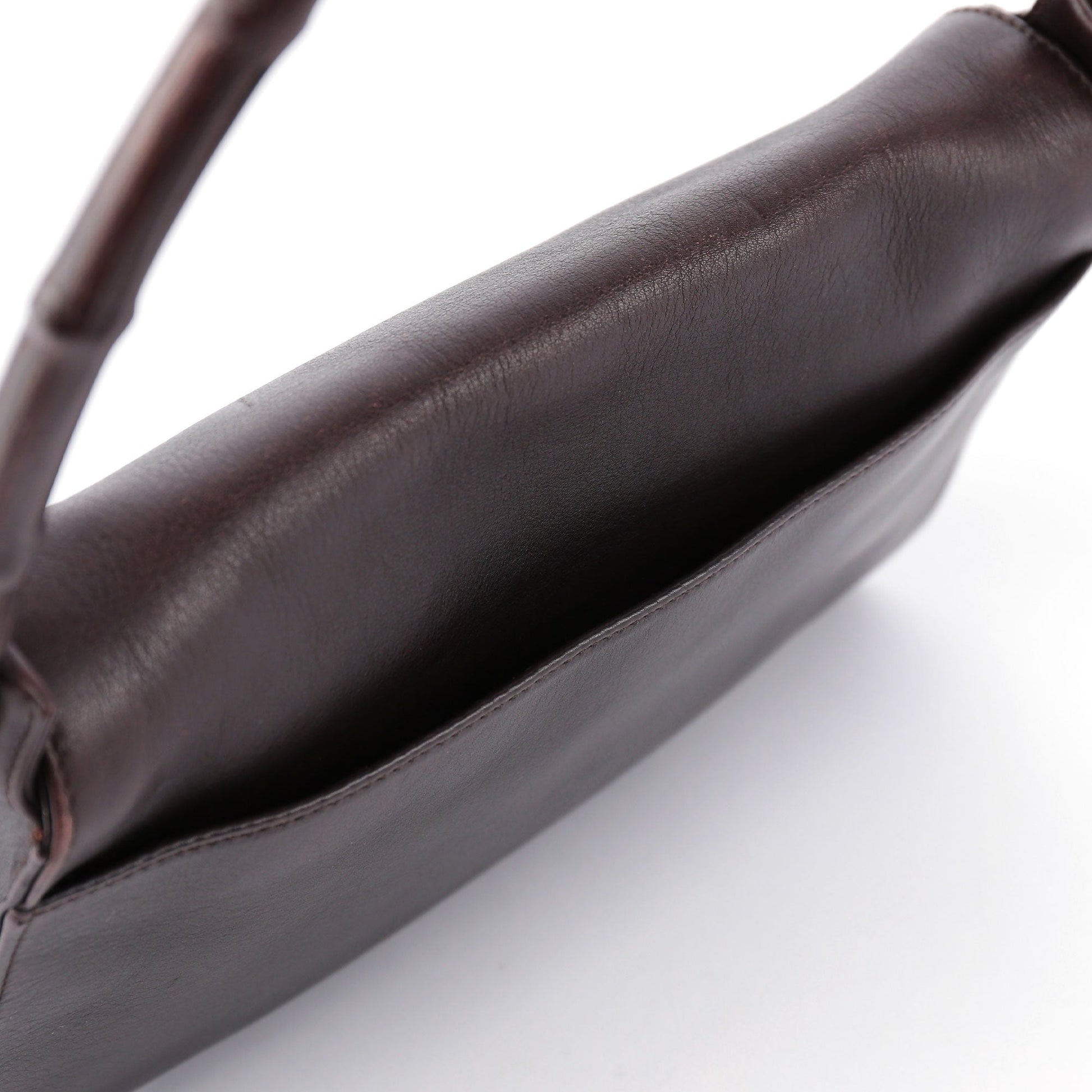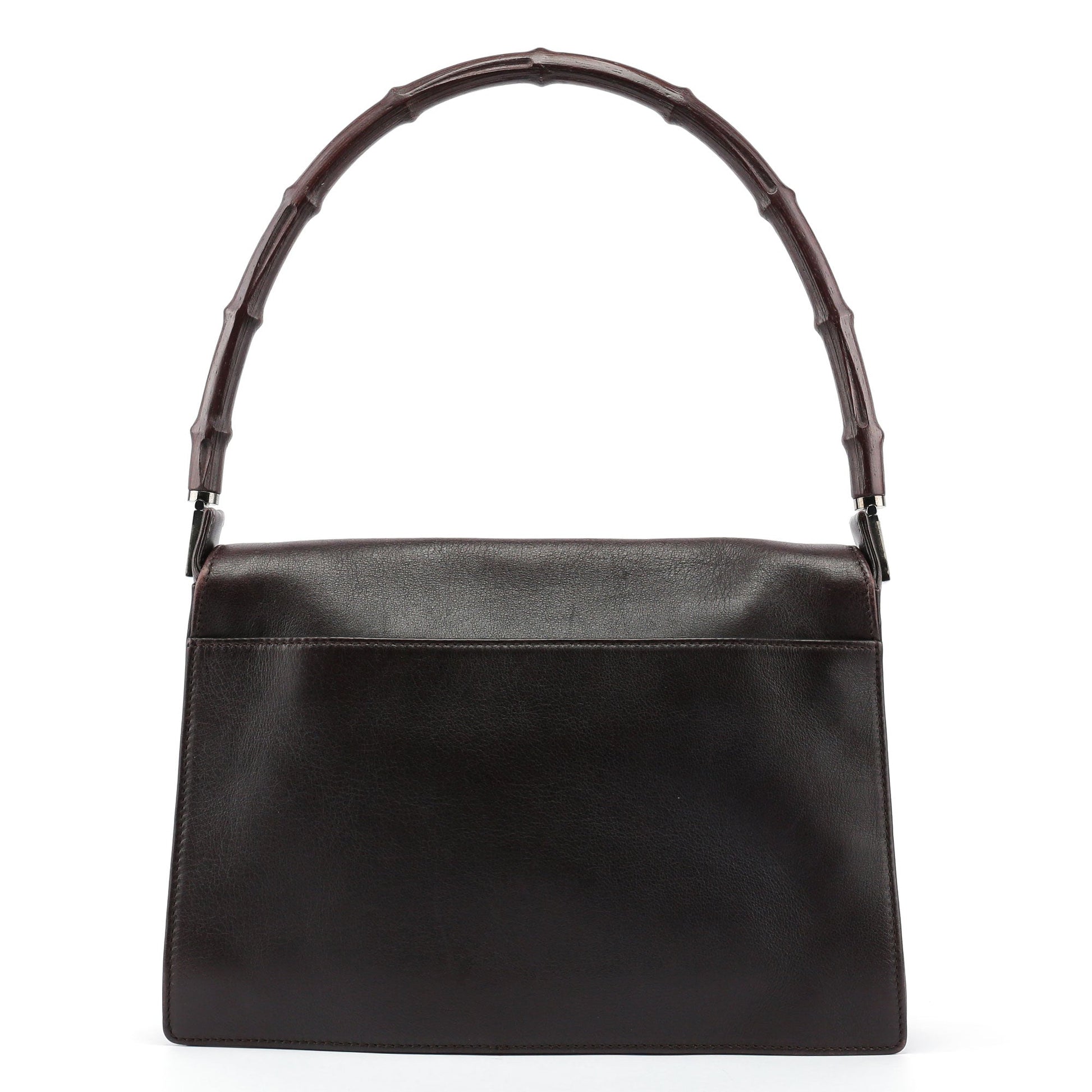 Designed by Tom Ford in the late 1990s, this Gucci Bamboo shoulder bag exudes timeless elegance. Handcrafted in rich brown calfskin leather, it features silver-tone hardware with Gucci logo engraving and the iconic bamboo handle. The magnetic flap closure opens to reveal a satin-lined interior with a convenient zipper pocket. The bag has an additional hidden slit pocket.