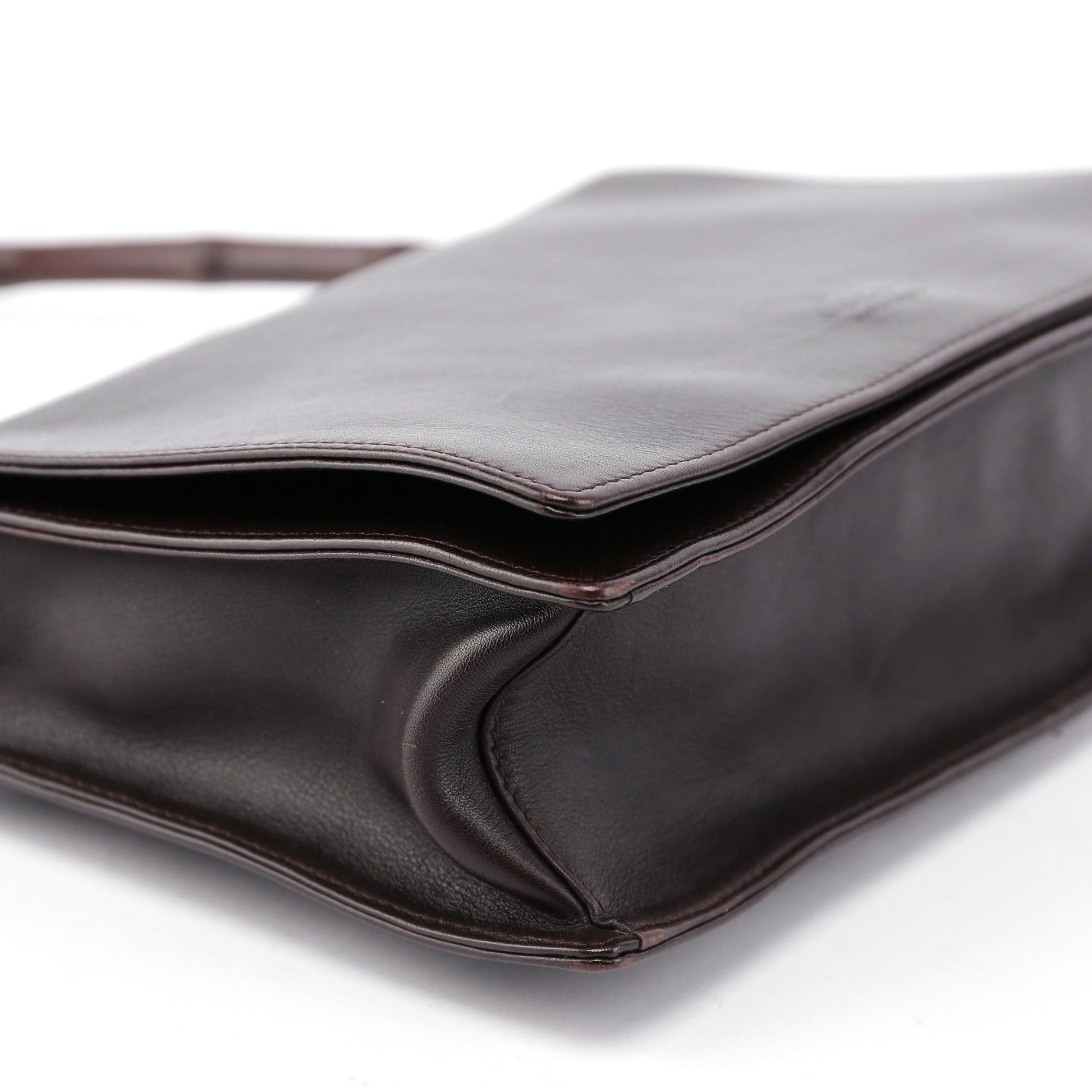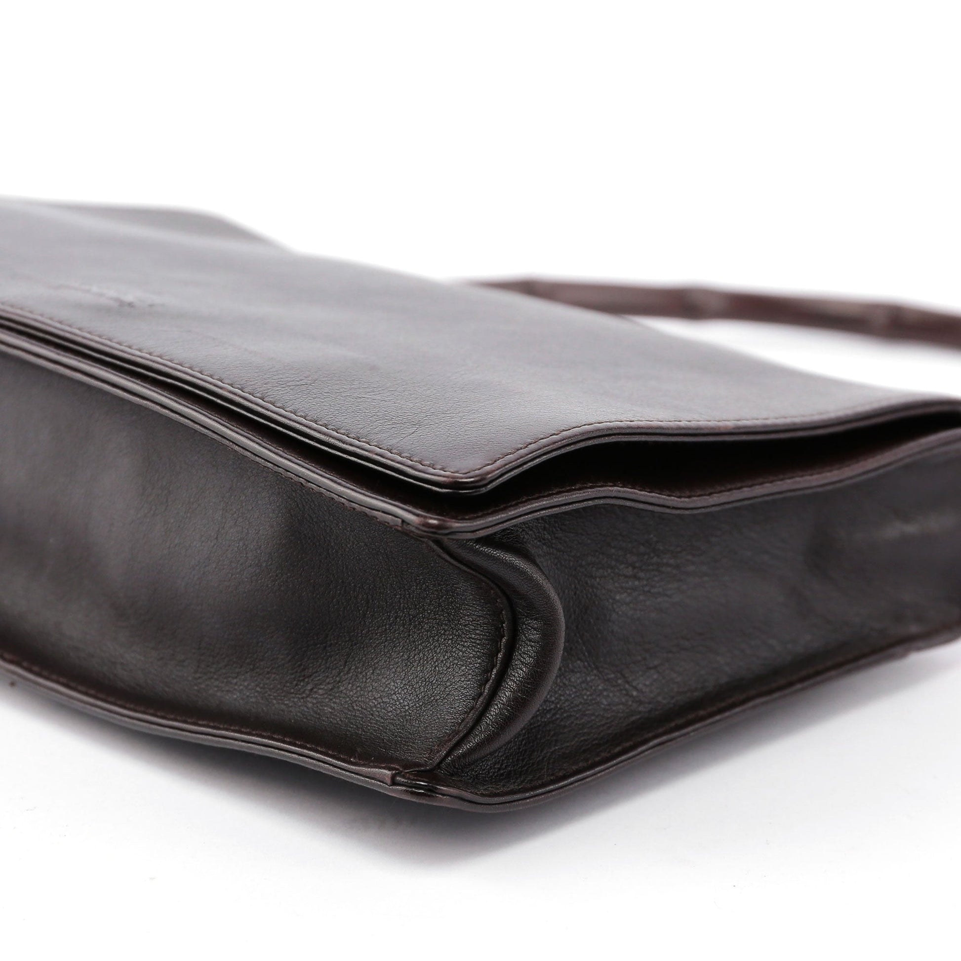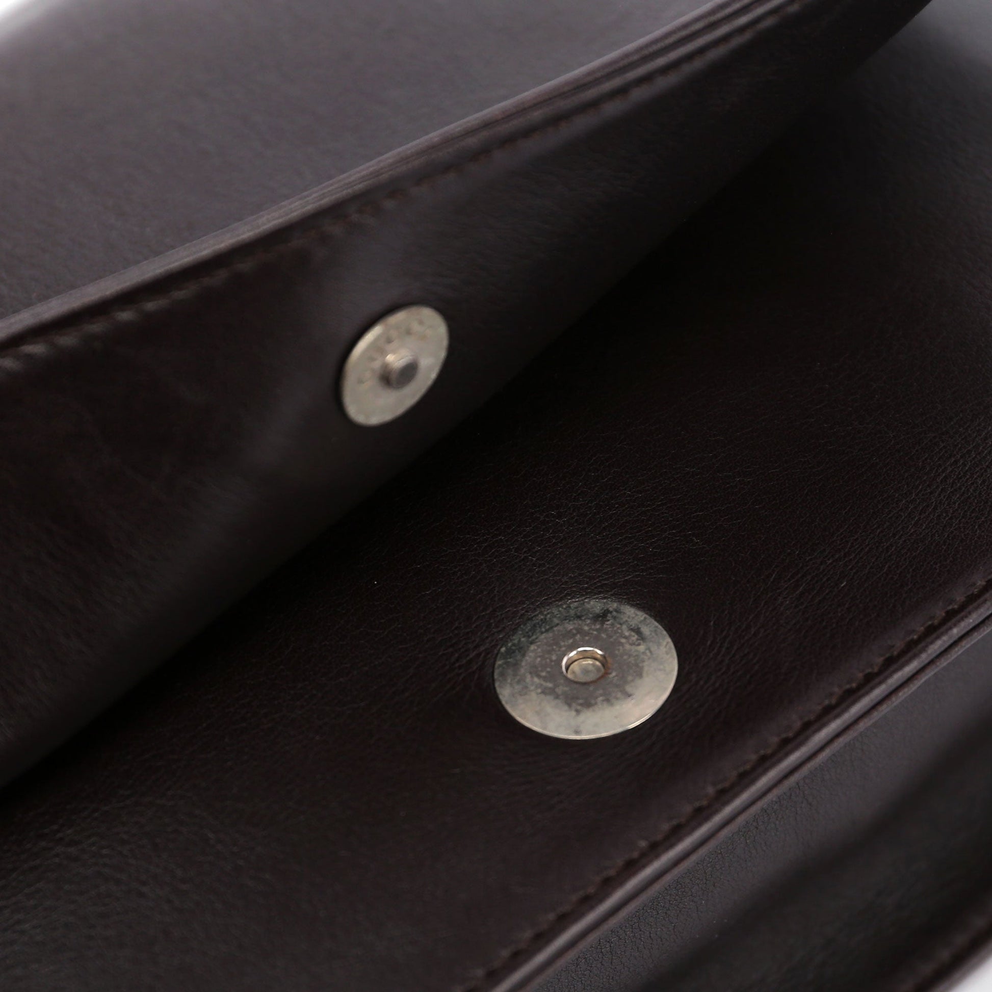 Designed by Tom Ford in the late 1990s, this Gucci Bamboo shoulder bag exudes timeless elegance. Handcrafted in rich brown calfskin leather, it features silver-tone hardware with Gucci logo engraving and the iconic bamboo handle. The magnetic flap closure opens to reveal a satin-lined interior with a convenient zipper pocket. The bag has an additional hidden slit pocket.