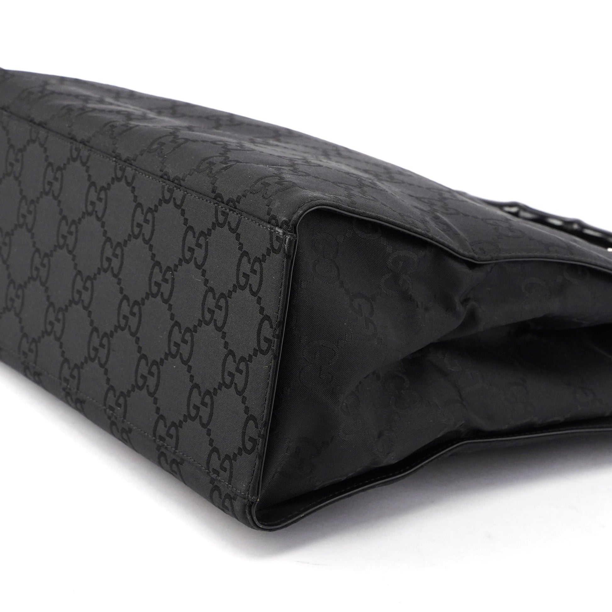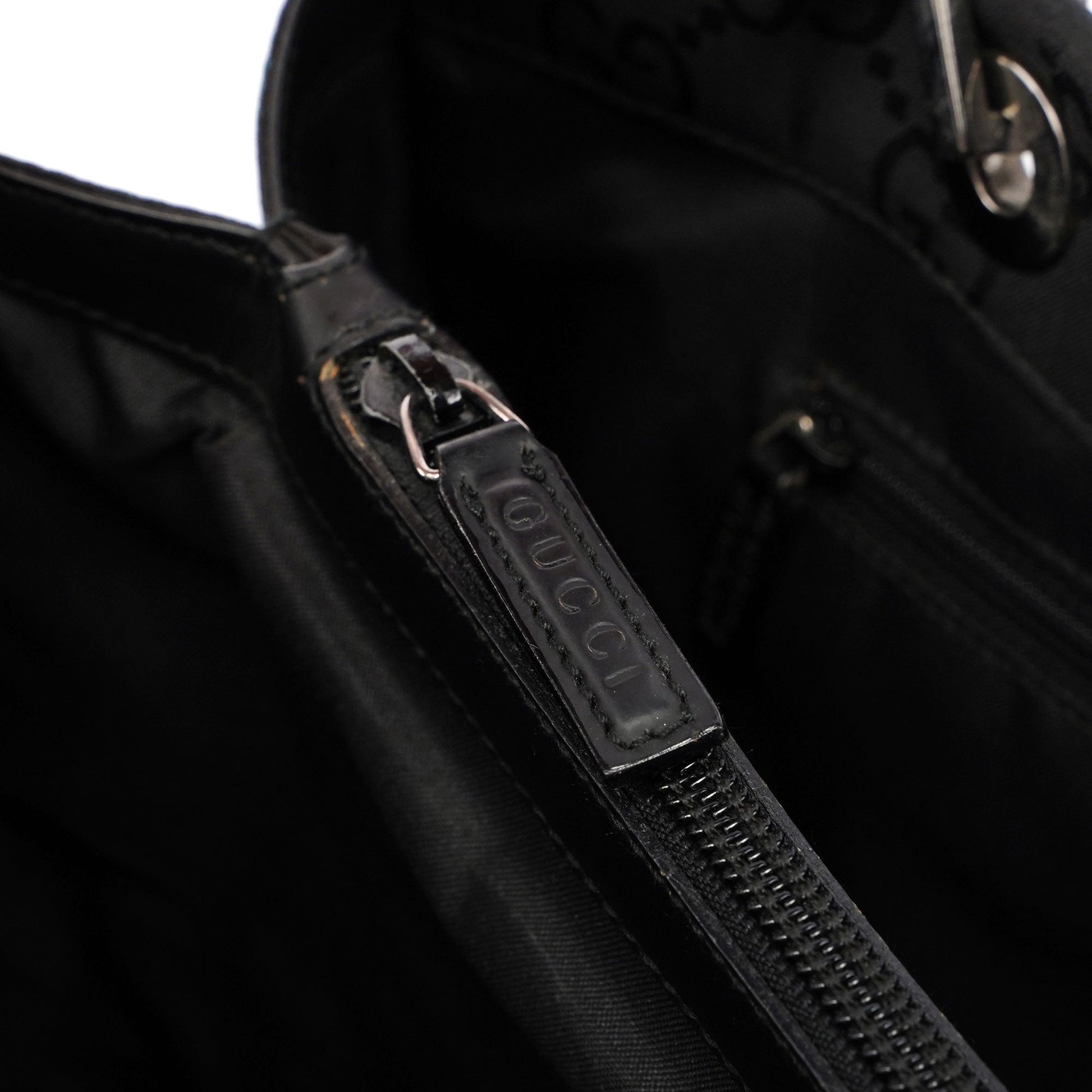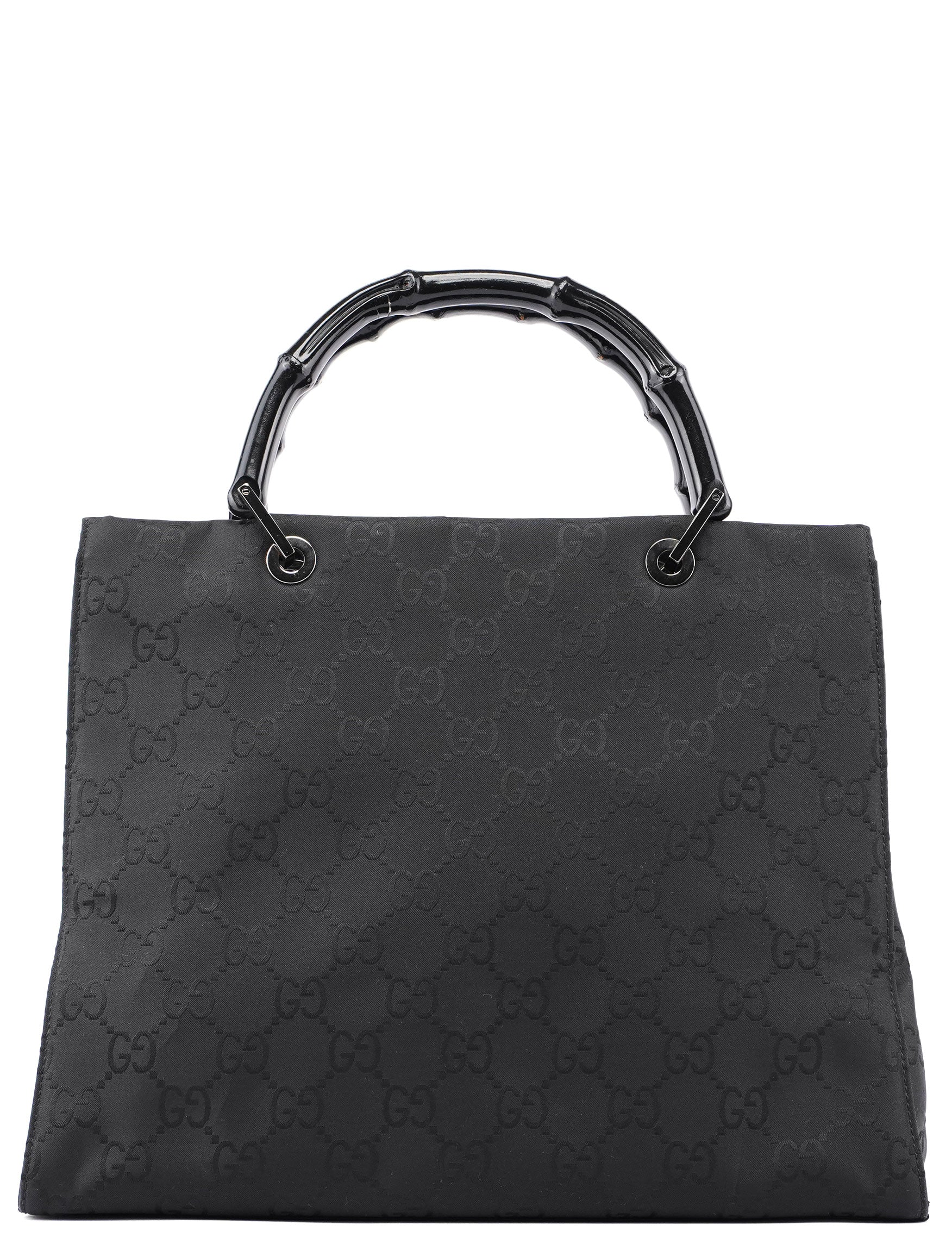 Designed by Tom Ford in the late 1990s, this Gucci Bamboo GG tote bag features two elegant black bamboo handles and silver-tone hardware. Crafted with the iconic GG monogram canvas, it offers three interior compartments lined with satin, including an interior zipper pocket for organized storage, blending luxurious design with practical functionality.