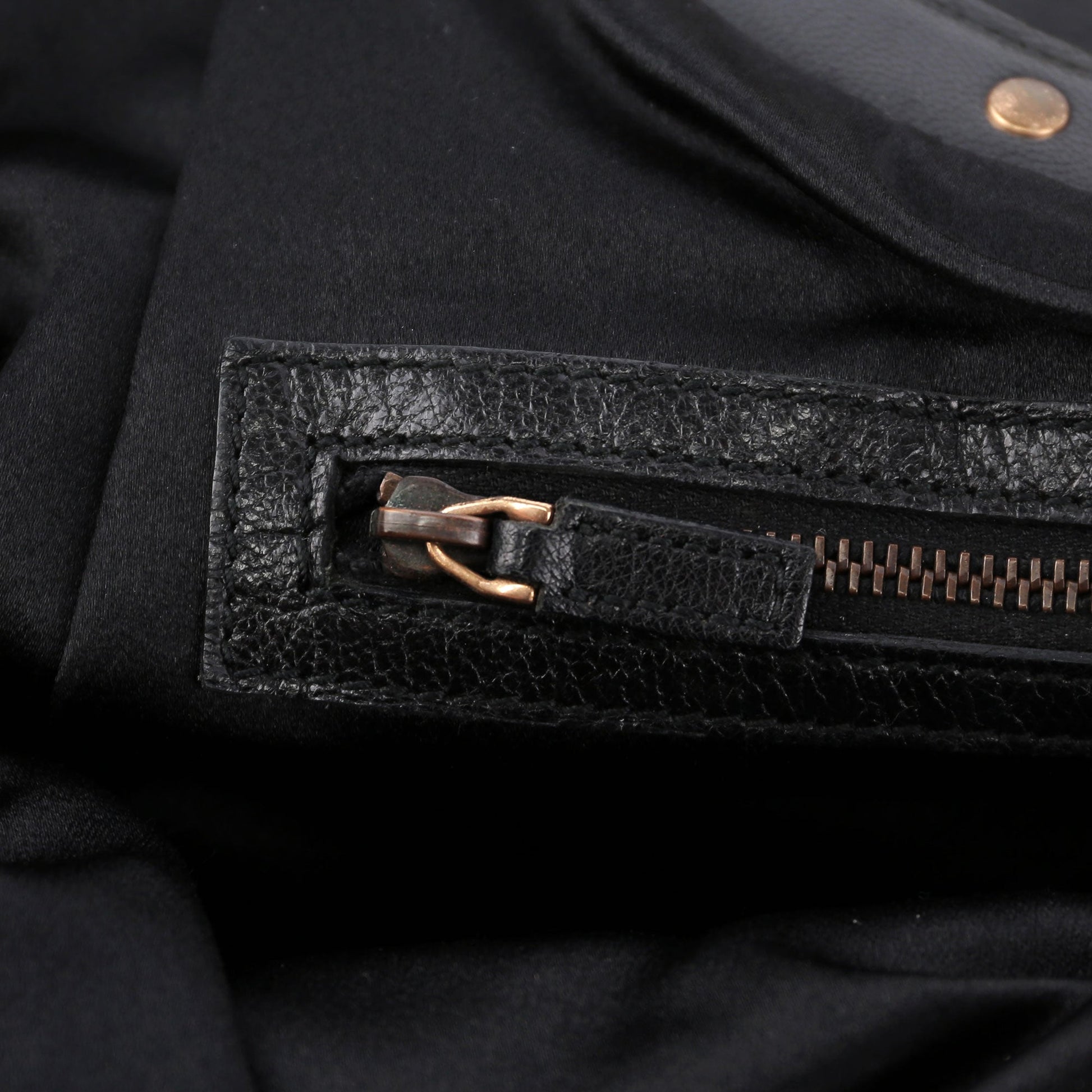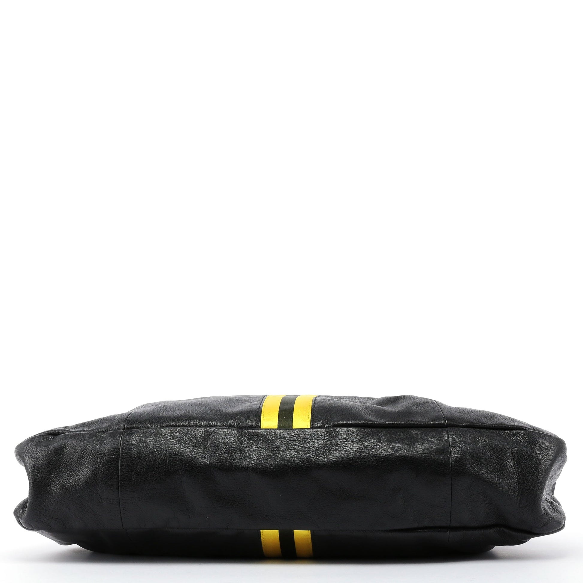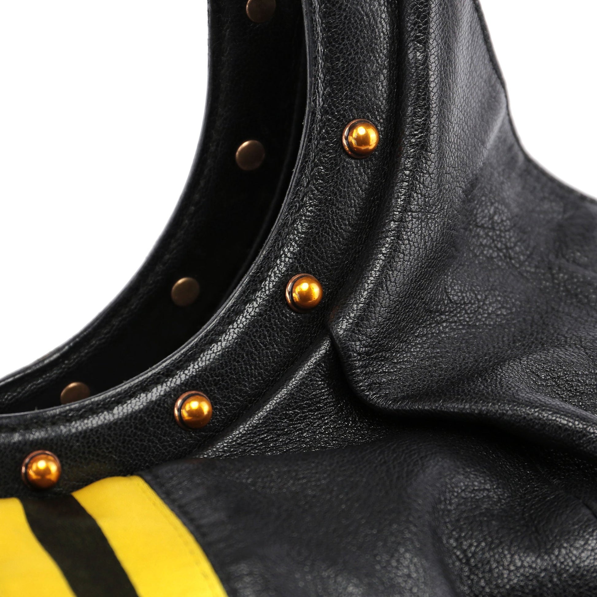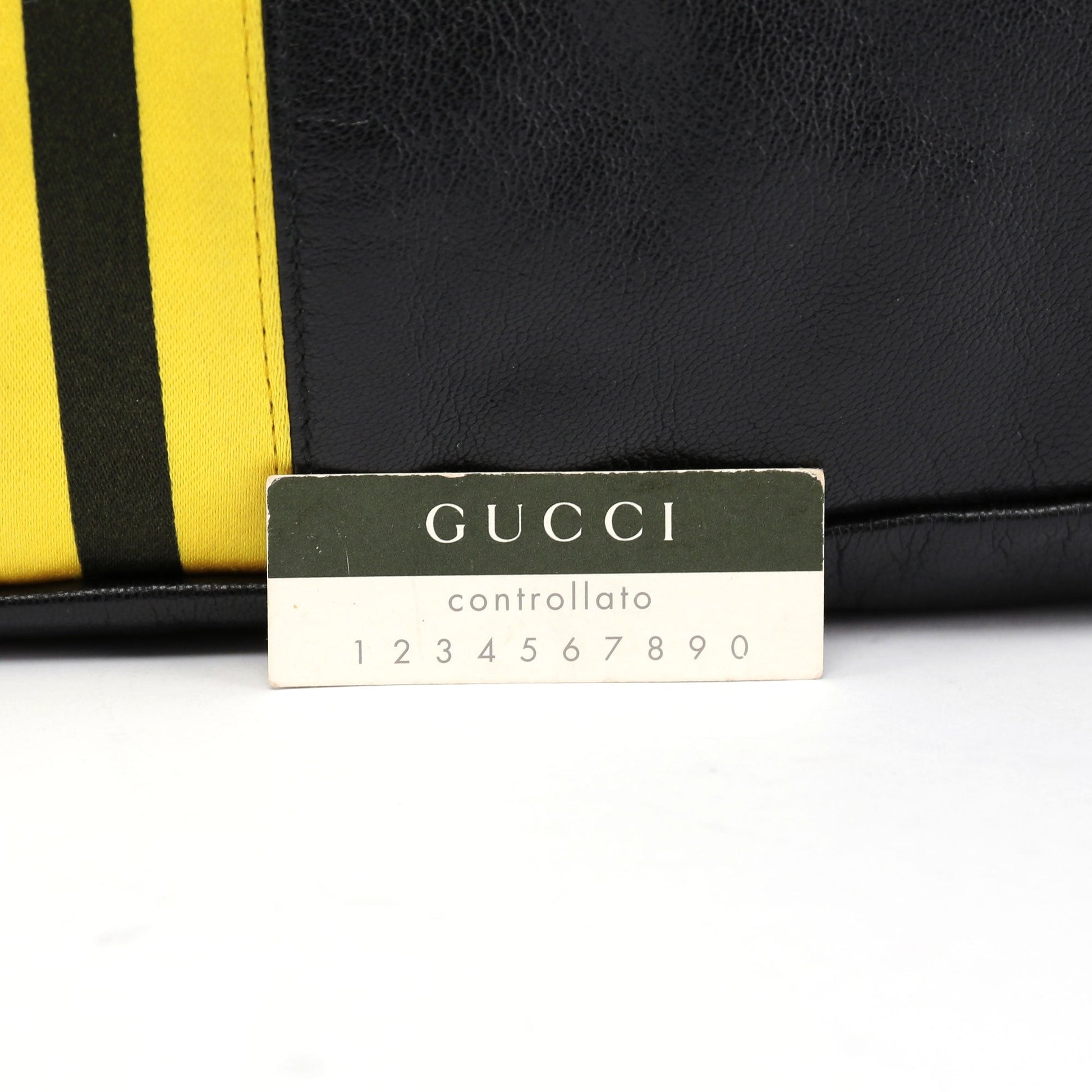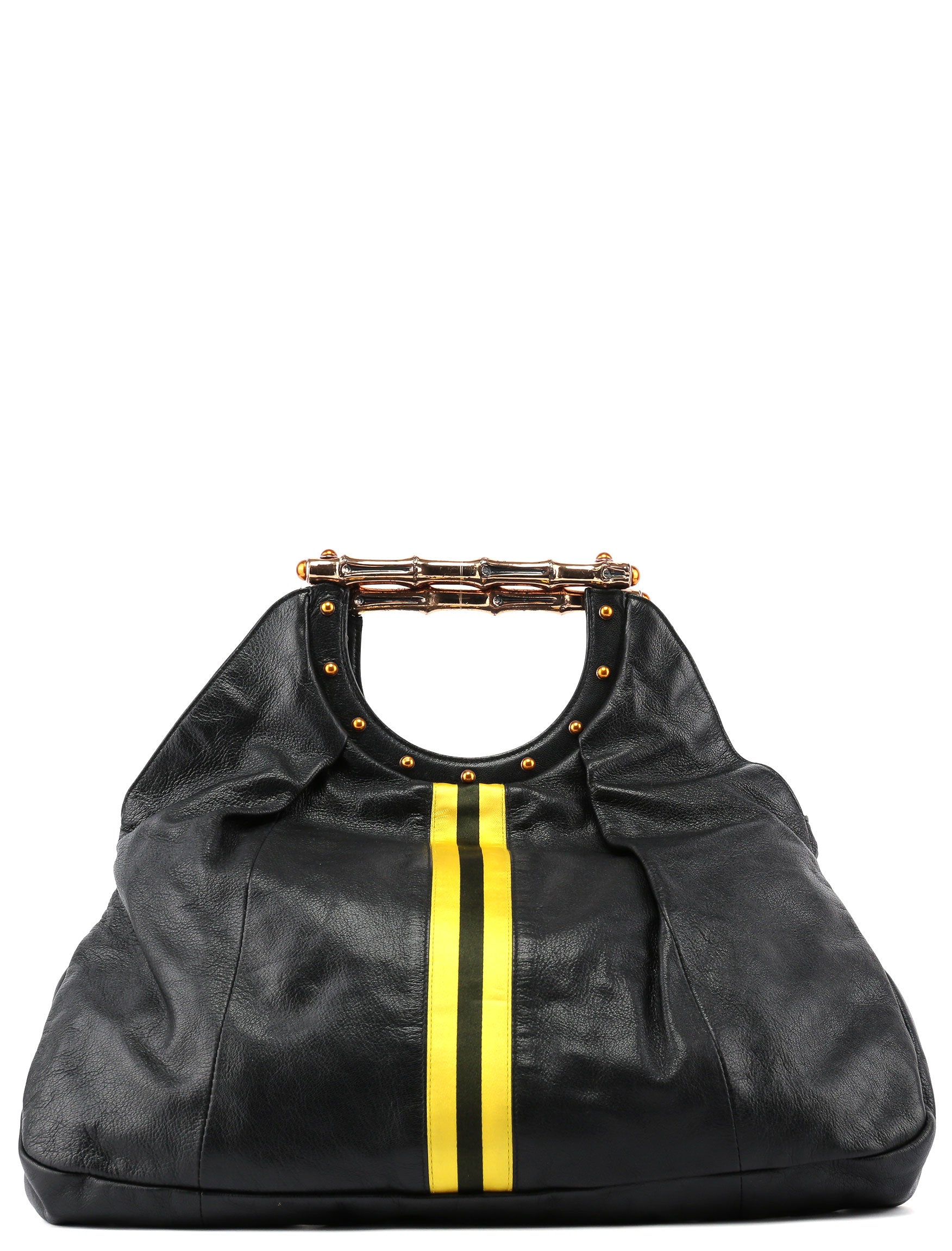 Crafted by Tom Ford in the late 1990s, this Gucci Bamboo top handle bag features black calfskin leather adorned with a bold yellow and black center band and accented with stud detailing. It boasts two bronze-tone bamboo-style metal handles and a satin-lined interior with a convenient zipper pocket.