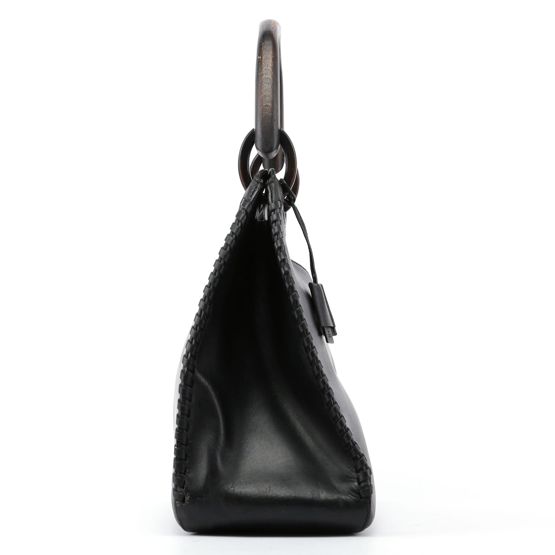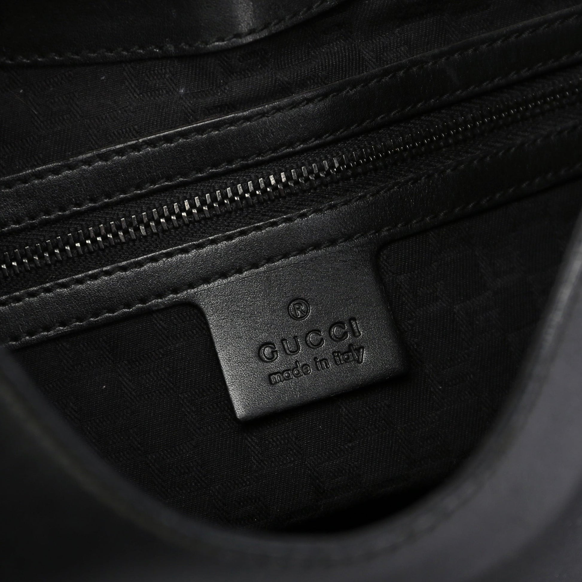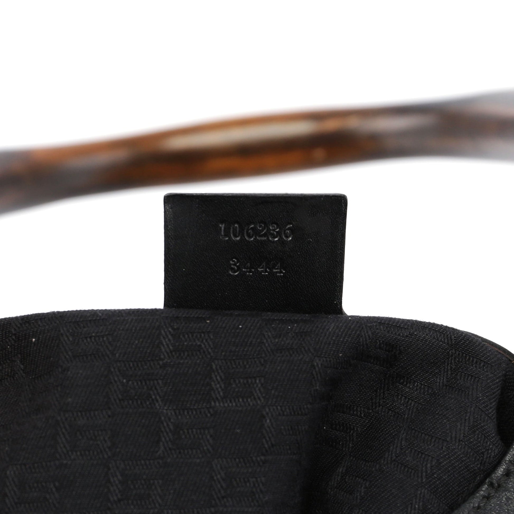 Designed by Tom Ford for the 2003 collection, this Gucci top handle bag is crafted in black calfskin leather and adorned with an anthracite logo bangle. Its interior is lined with square G monogram cotton and features an interior zipper pocket.