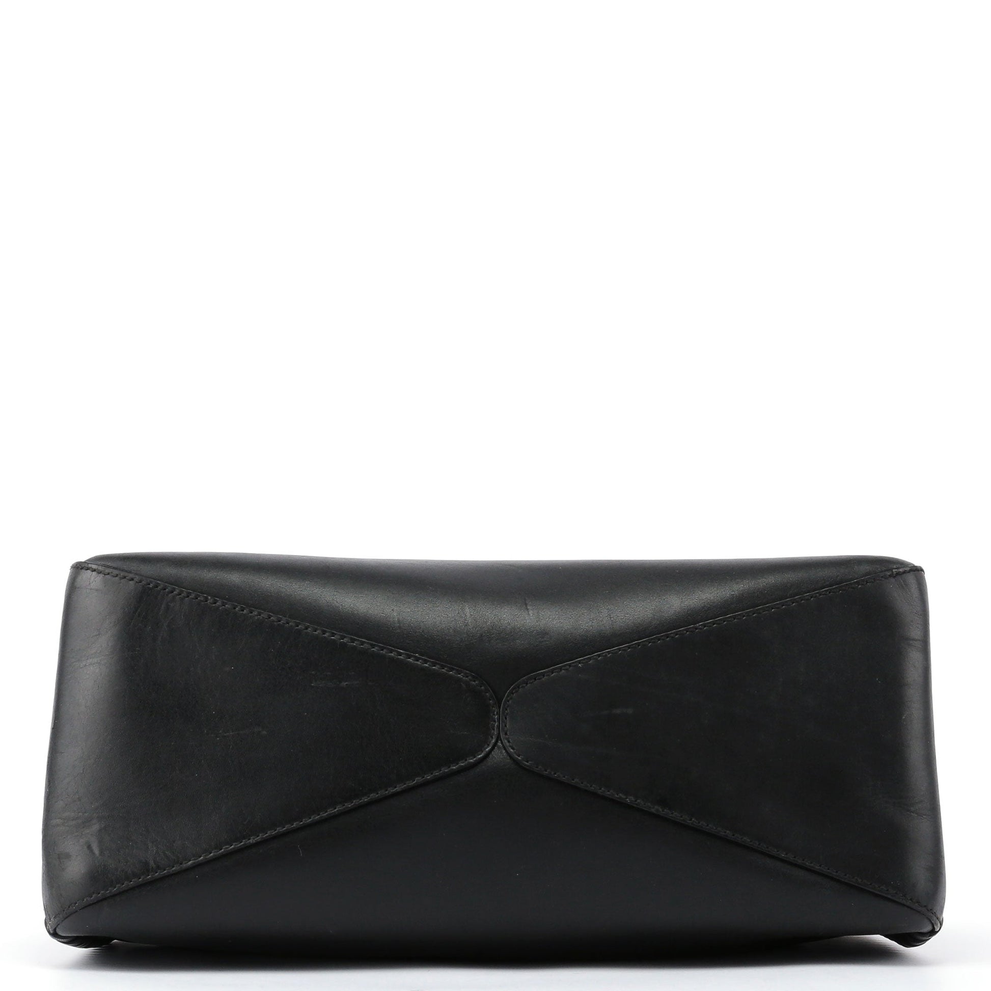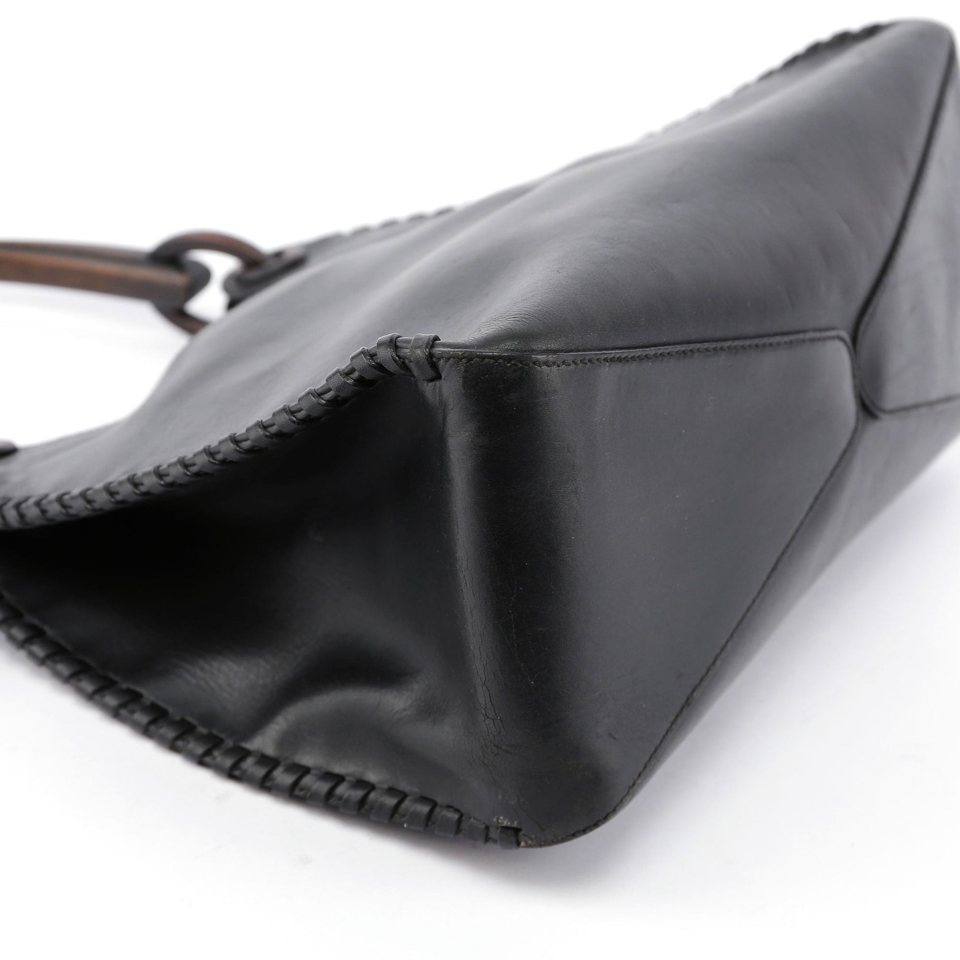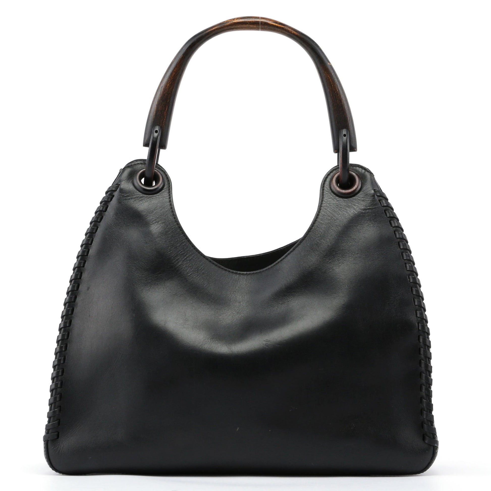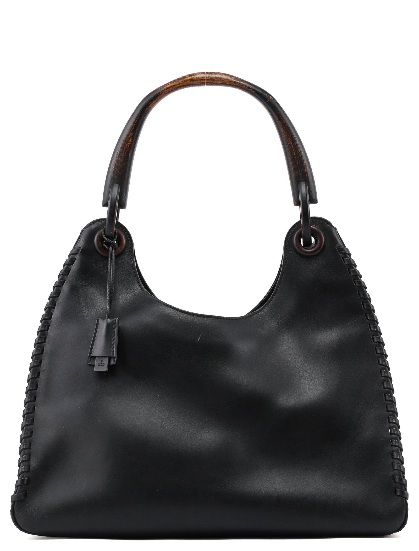 Designed by Tom Ford for the 2003 collection, this Gucci top handle bag is crafted in black calfskin leather and adorned with an anthracite logo bangle. Its interior is lined with square G monogram cotton and features an interior zipper pocket.
