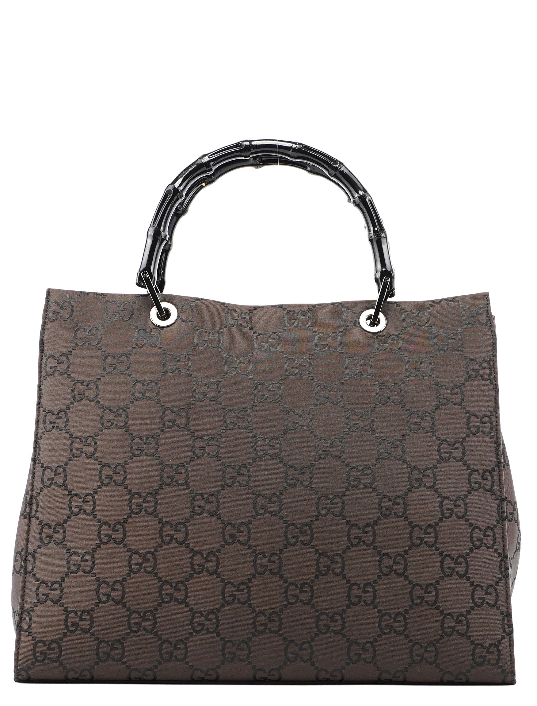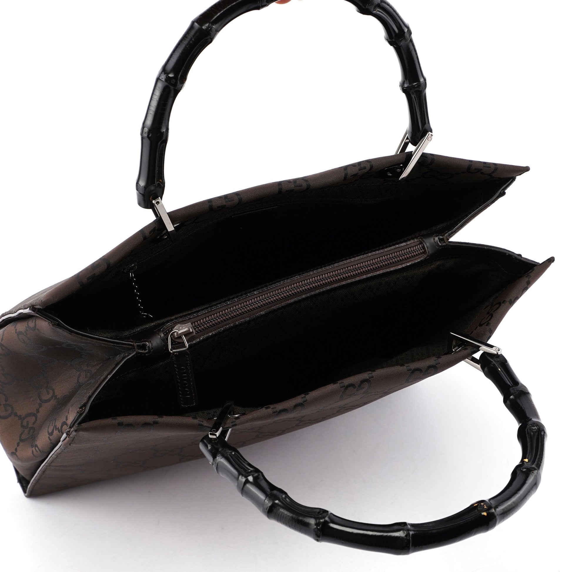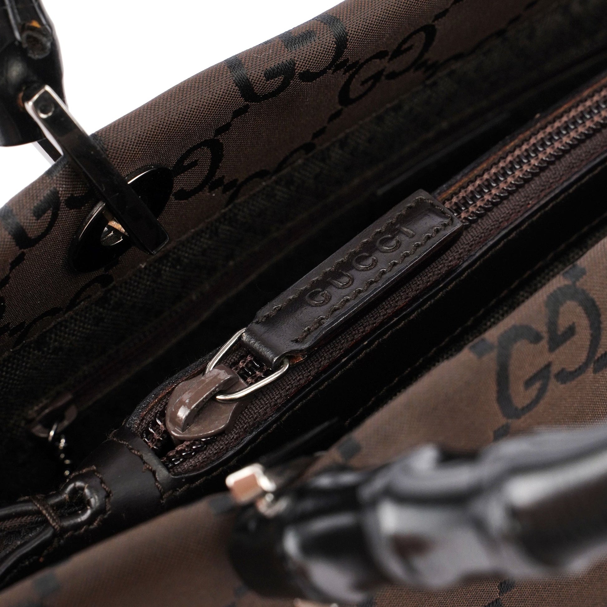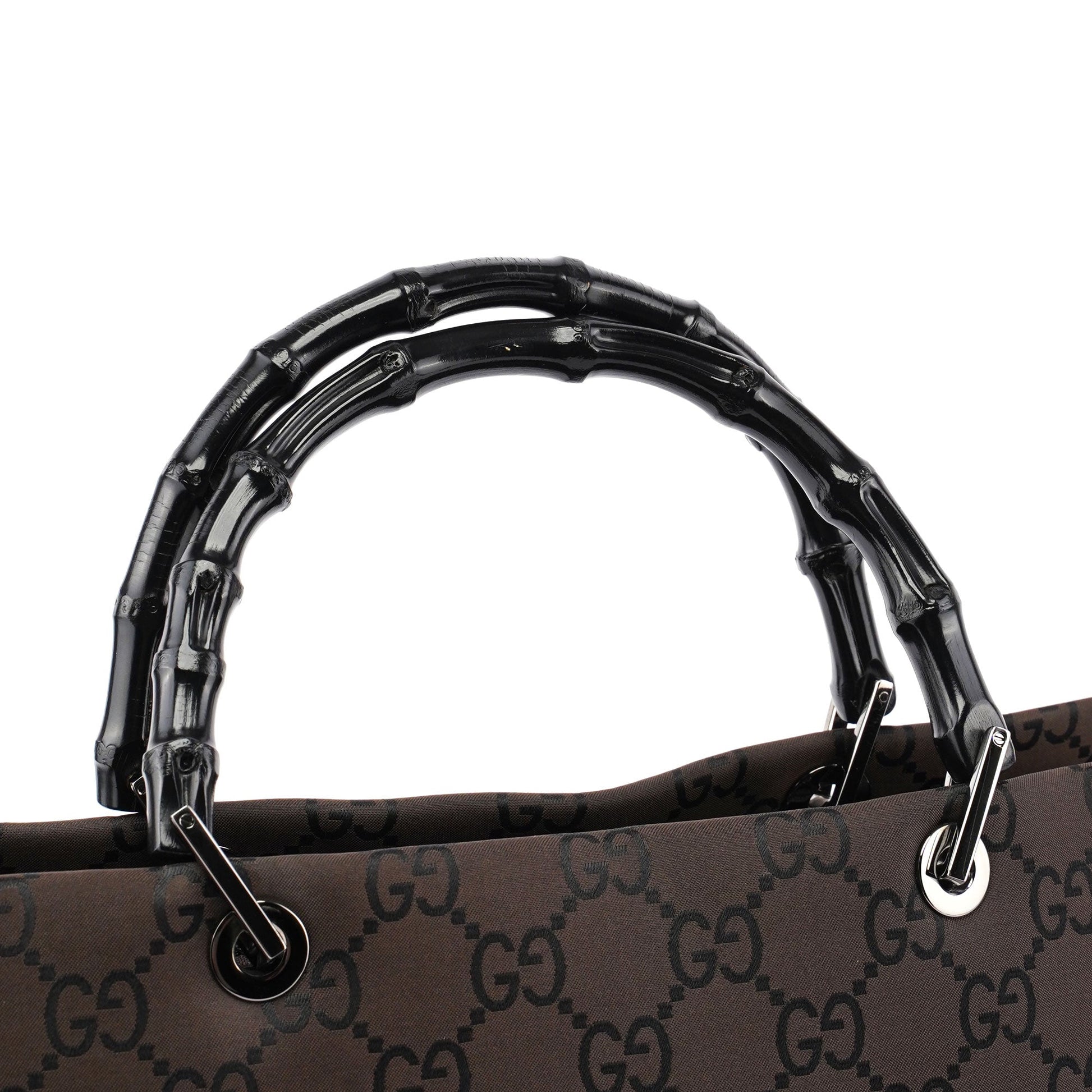 Designed by Tom Ford in the late 1990s, this Gucci Bamboo GG tote bag features two elegant black bamboo handles and silver-tone hardware. Crafted with the iconic GG monogram canvas, it offers three interior compartments lined with satin, including an interior zipper pocket for organized storage, blending luxurious design with practical functionality.
