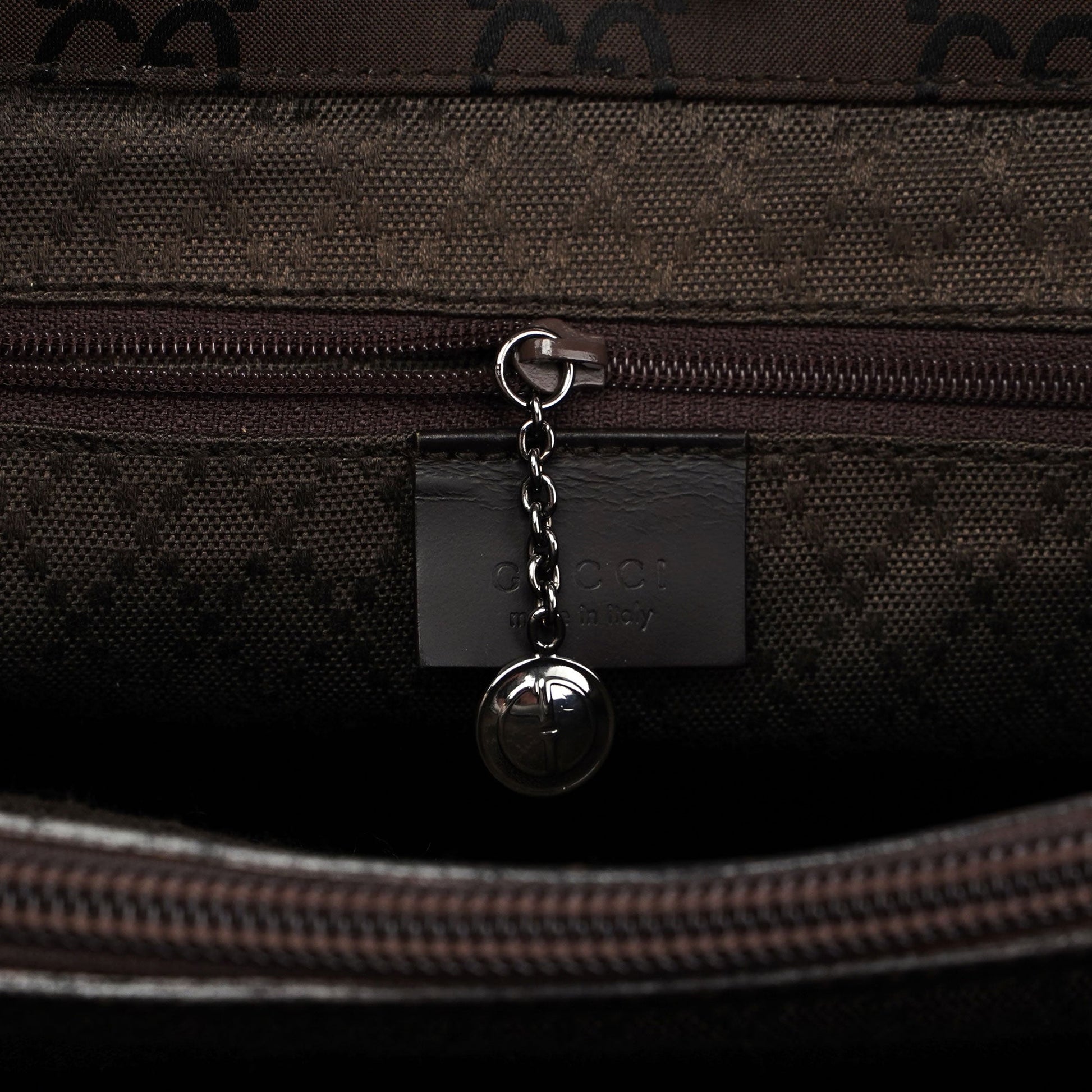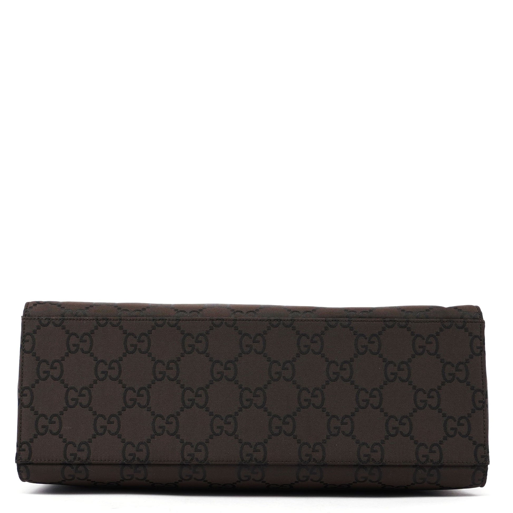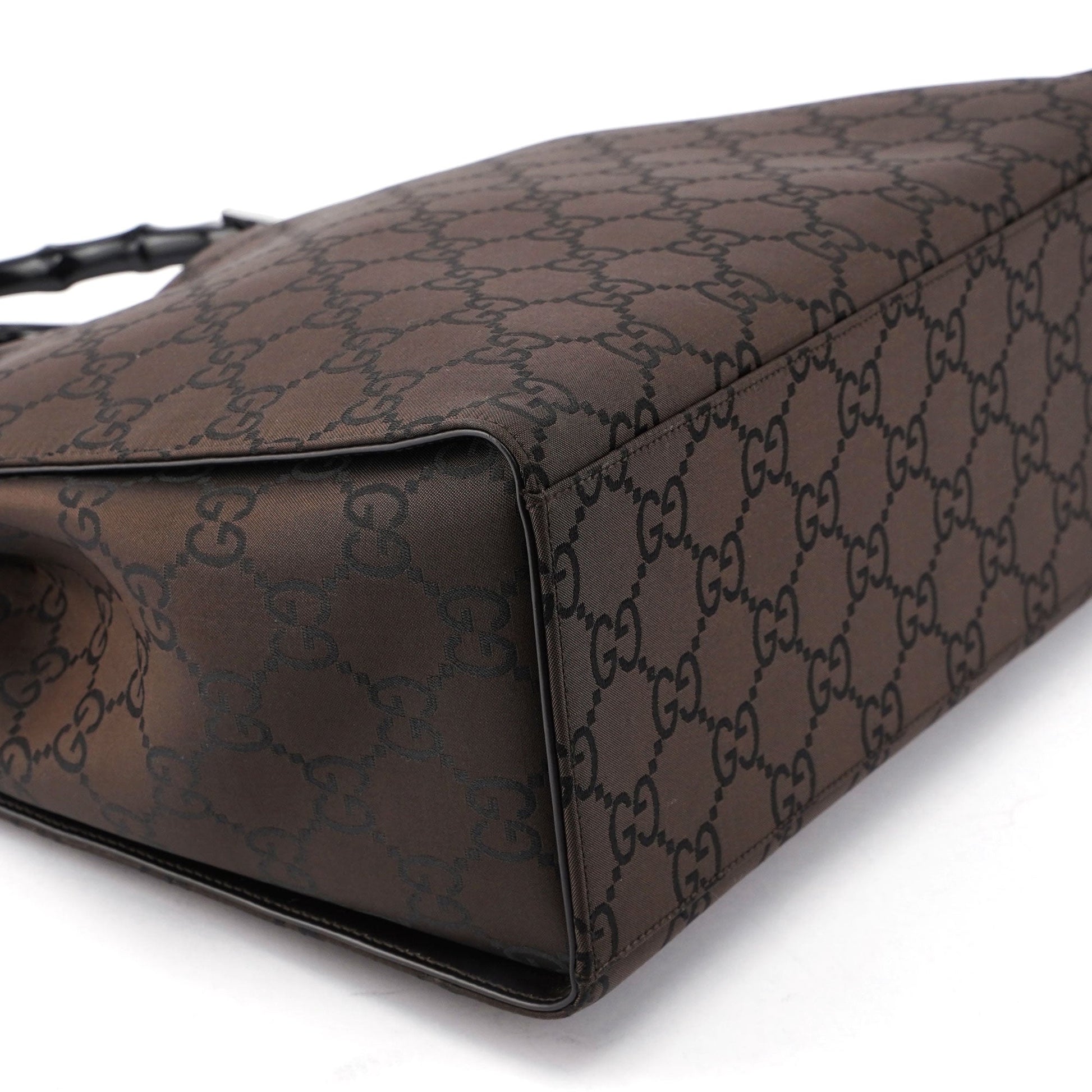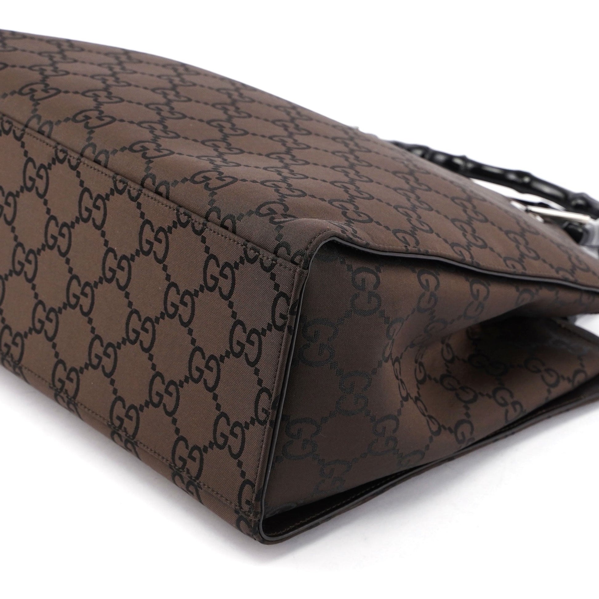 Designed by Tom Ford in the late 1990s, this Gucci Bamboo GG tote bag features two elegant black bamboo handles and silver-tone hardware. Crafted with the iconic GG monogram canvas, it offers three interior compartments lined with satin, including an interior zipper pocket for organized storage, blending luxurious design with practical functionality.