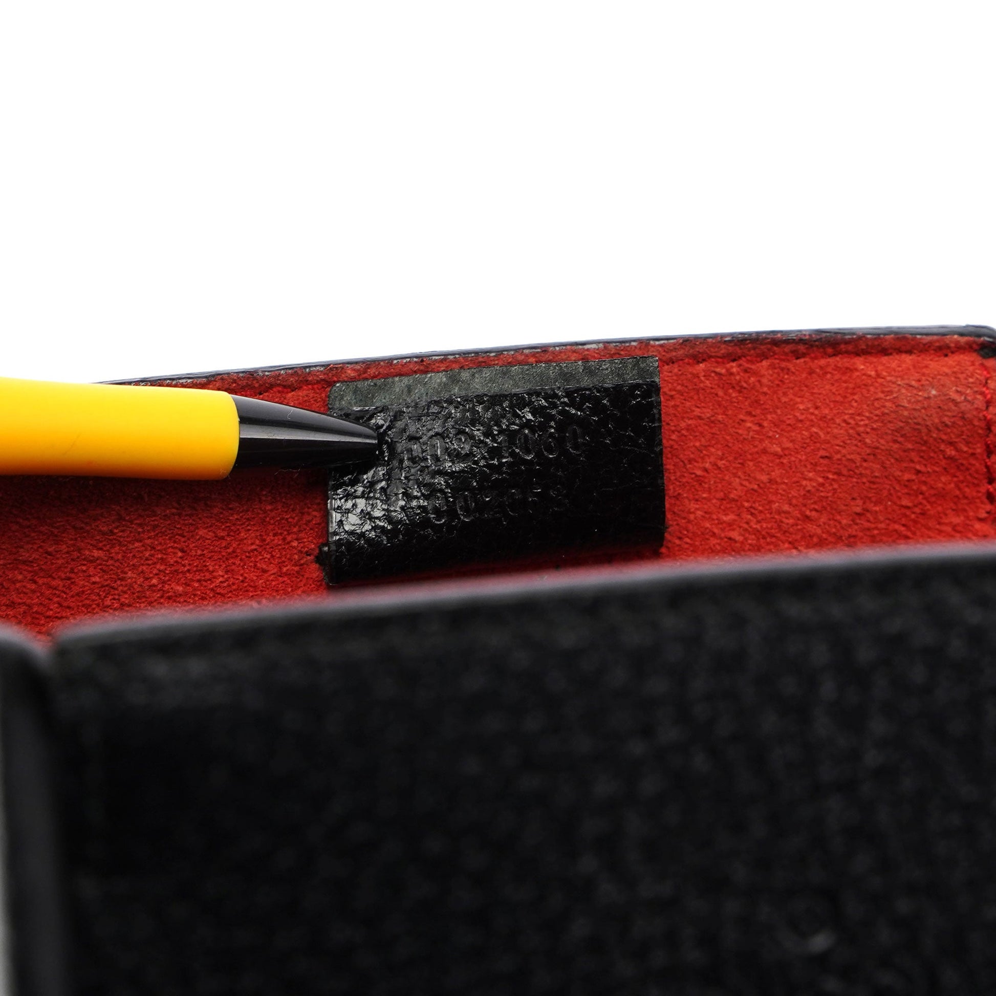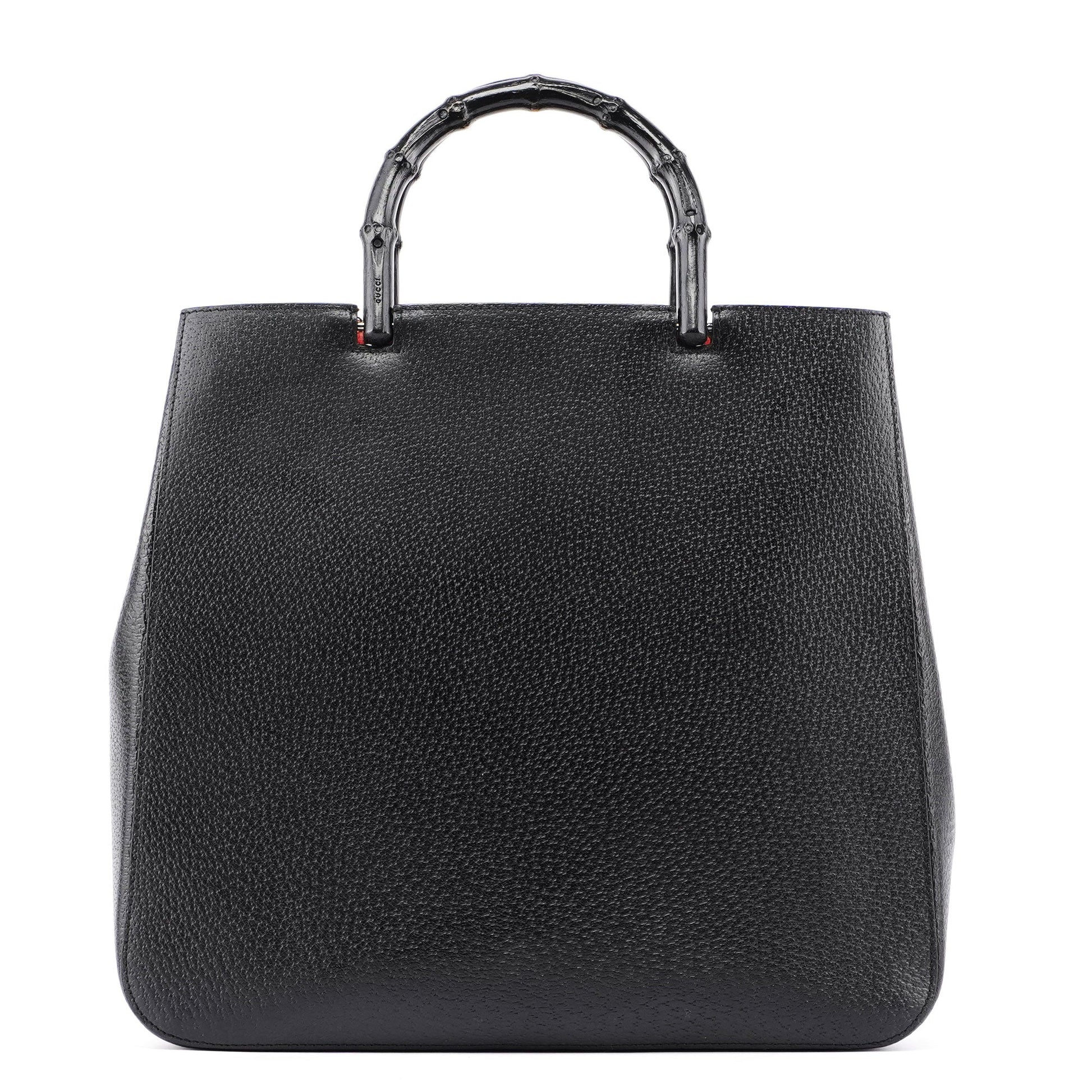 Designed by Tom Ford in the late '90s, this Gucci Bamboo tote bag handcrafted in black leather features two bamboo handles and two compartments. The interior, lined with red suede and including a zipper pocket, adds a bold contrast. The Gucci logo embossed at the front highlights its distinguished design.