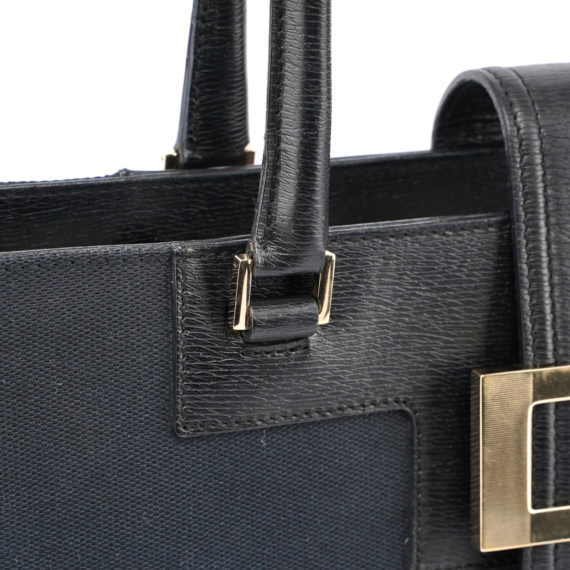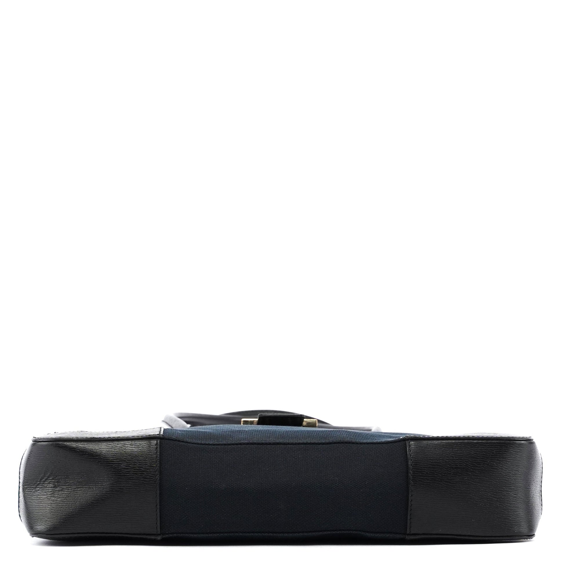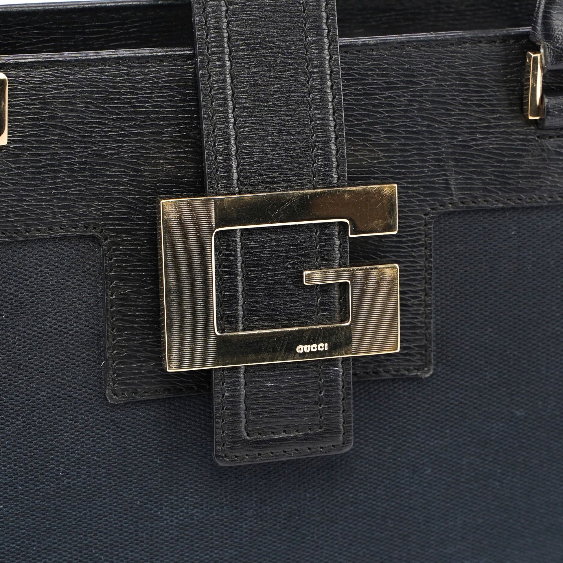 Tom Ford's late '90s Gucci Square G tote embodies sophistication and timeless style. Its black canvas is complemented by gold-tone hardware bearing the iconic Gucci logo. Finished with black leather trim, the bag's satin-lined interior includes a convenient zipper pocket.