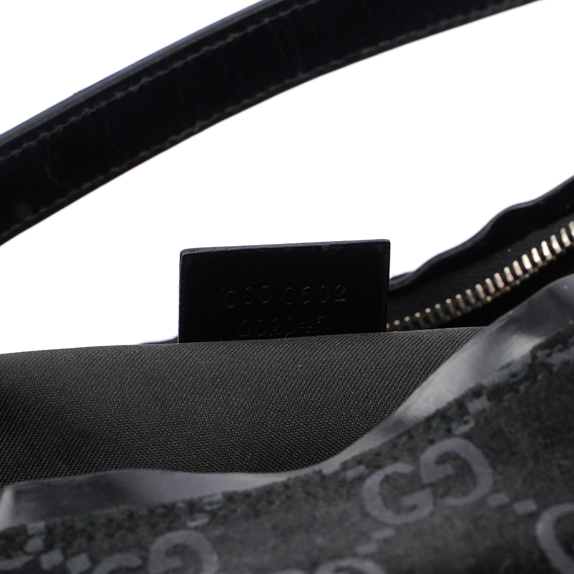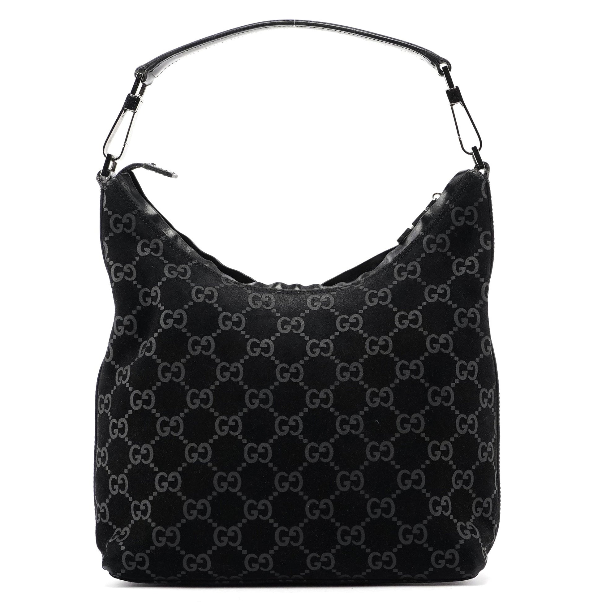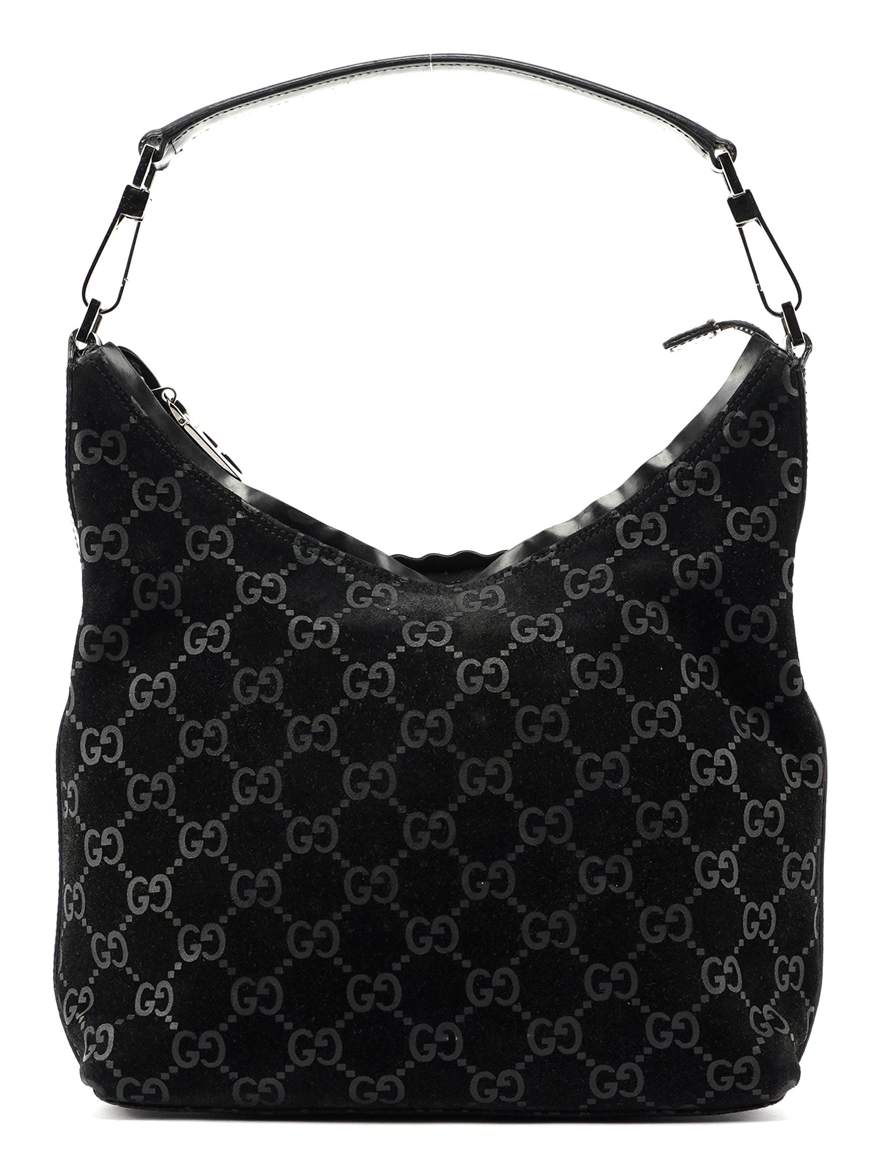 Unveil the elegance of the Gucci GG suede monogram shoulder bag, designed by Tom Ford in 1997. This luxurious piece features silver-tone hardware with engraved Gucci logo, complemented by black calfskin leather trim. A zipper closure secures the satin-lined interior, making it a perfect fusion of timeless design and modern sophistication.