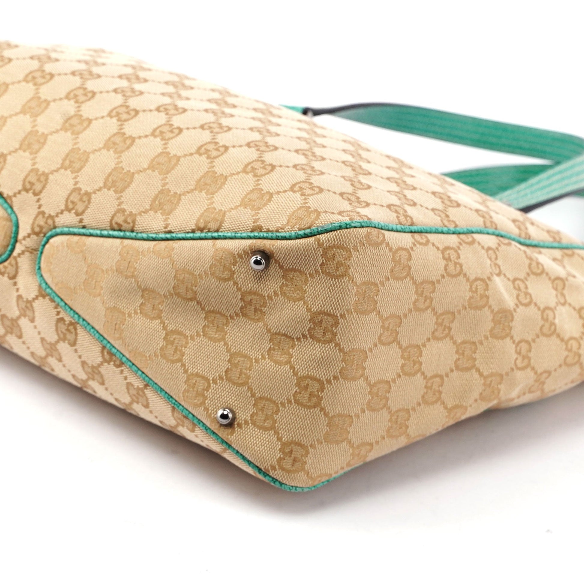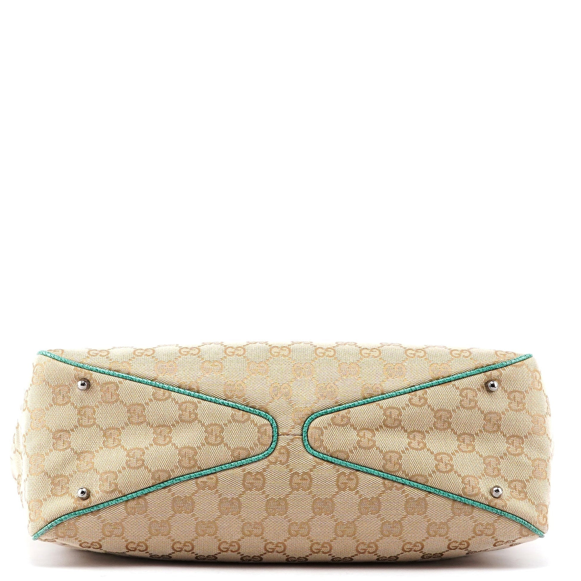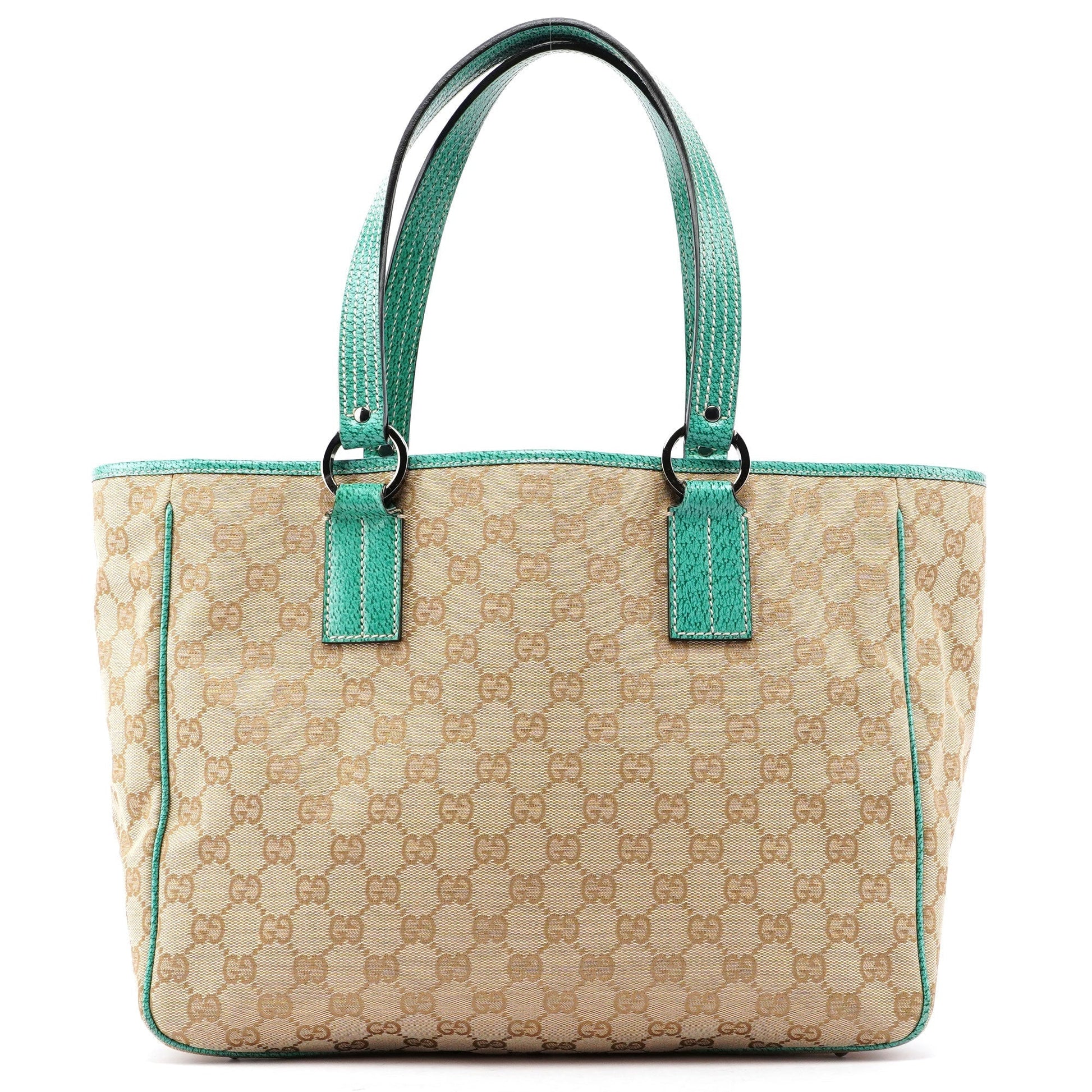 Designed by Tom Ford in the early 2000's, this Gucci GG tote bag features a beige canvas GG monogram with turquoise leather trim. The silver-tone hardware adds a touch of elegance. Inside, the cotton-lined interior includes a handy zipper pocket.