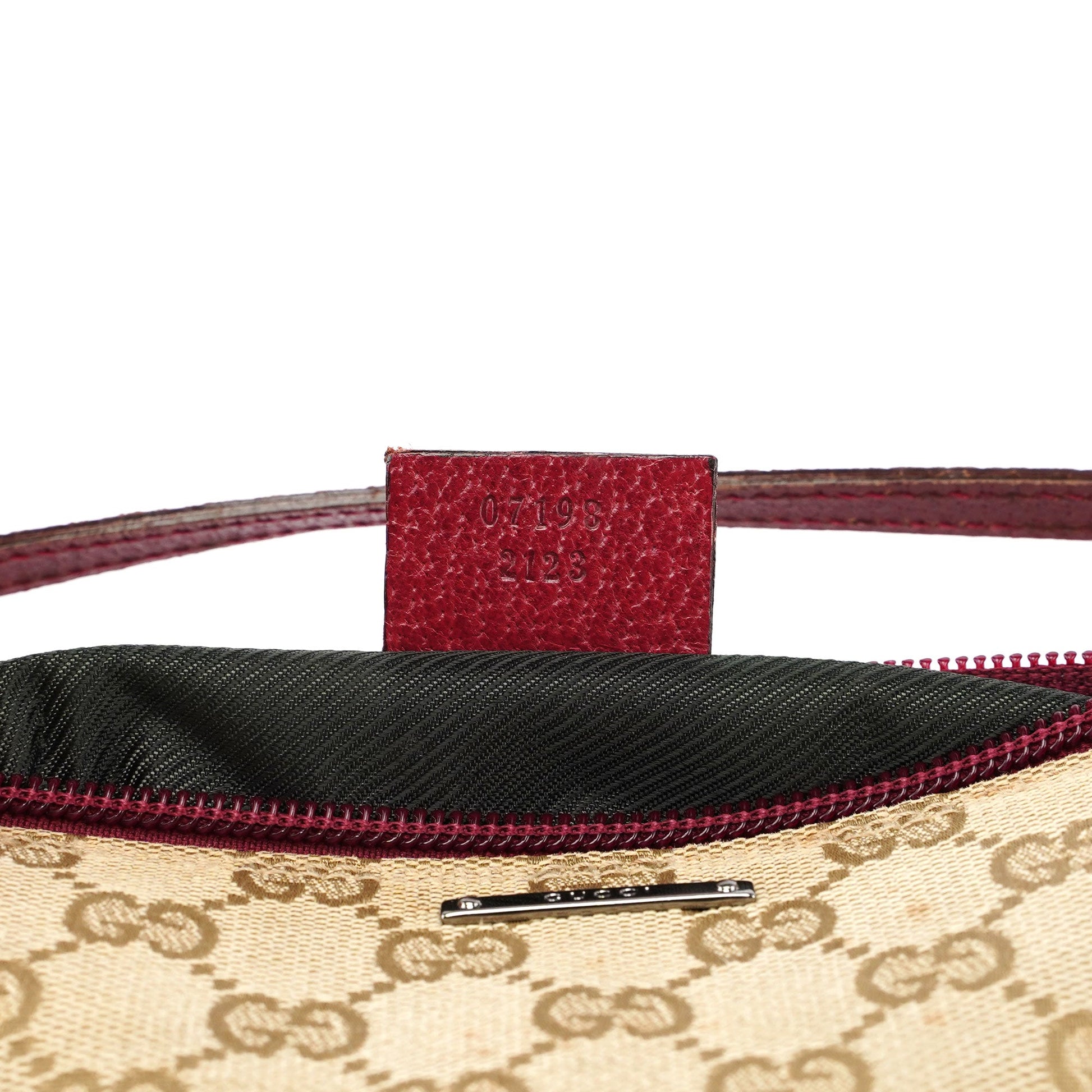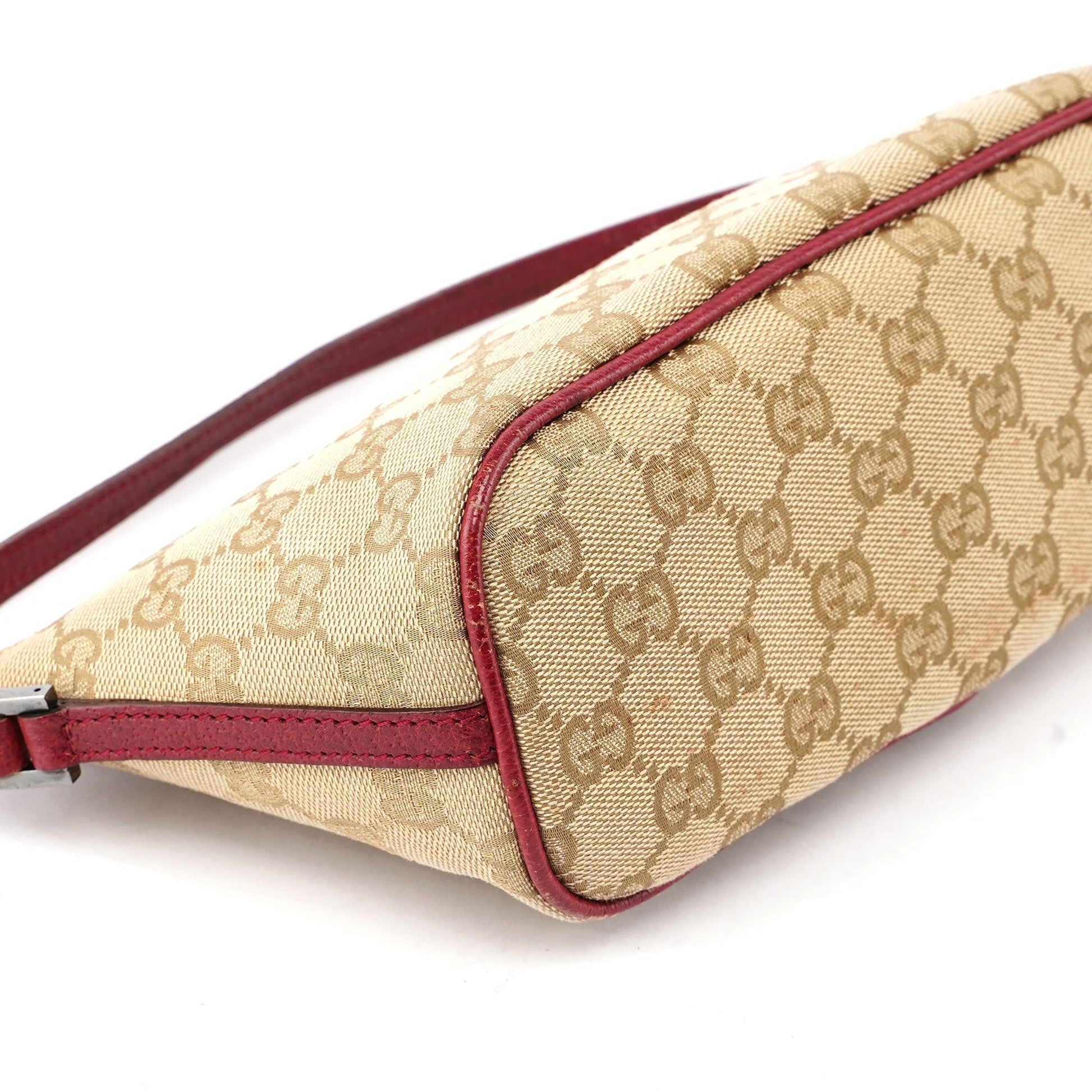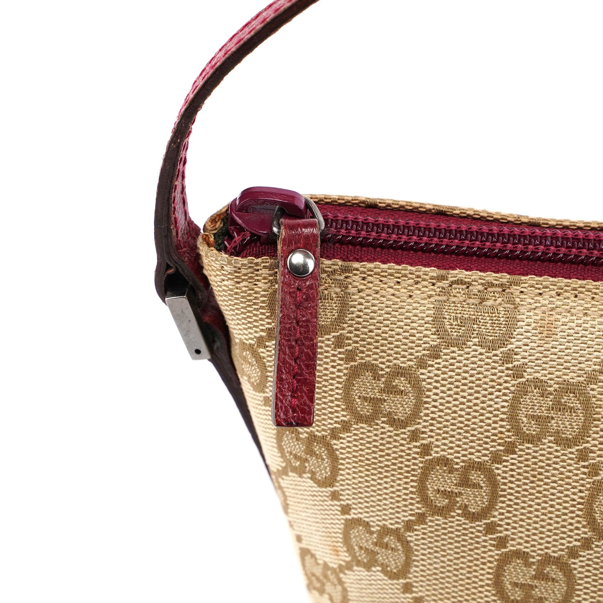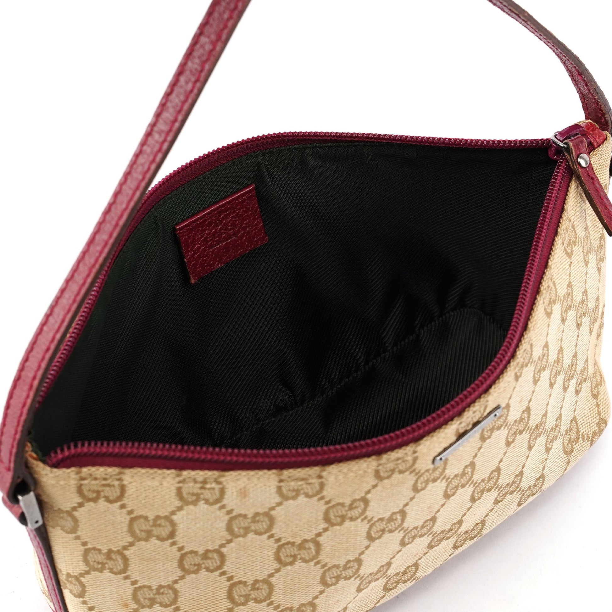 Explore timeless elegance with the Gucci GG Boat Pochette by Tom Ford, circa late 1990s. This exquisite piece combines beige GG canvas with red leather trim and silver-tone hardware. Its secure zip closure and satin-lined interior offer luxury and practicality, while the subtle Gucci plaque adds a touch of heritage. A perfect blend of vintage charm and sophistication.