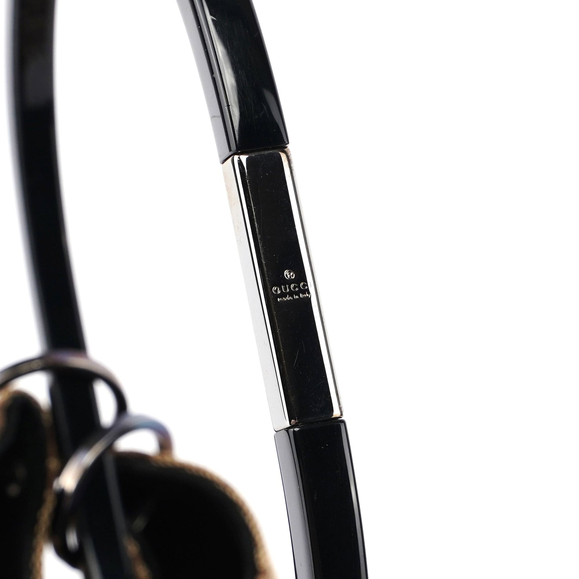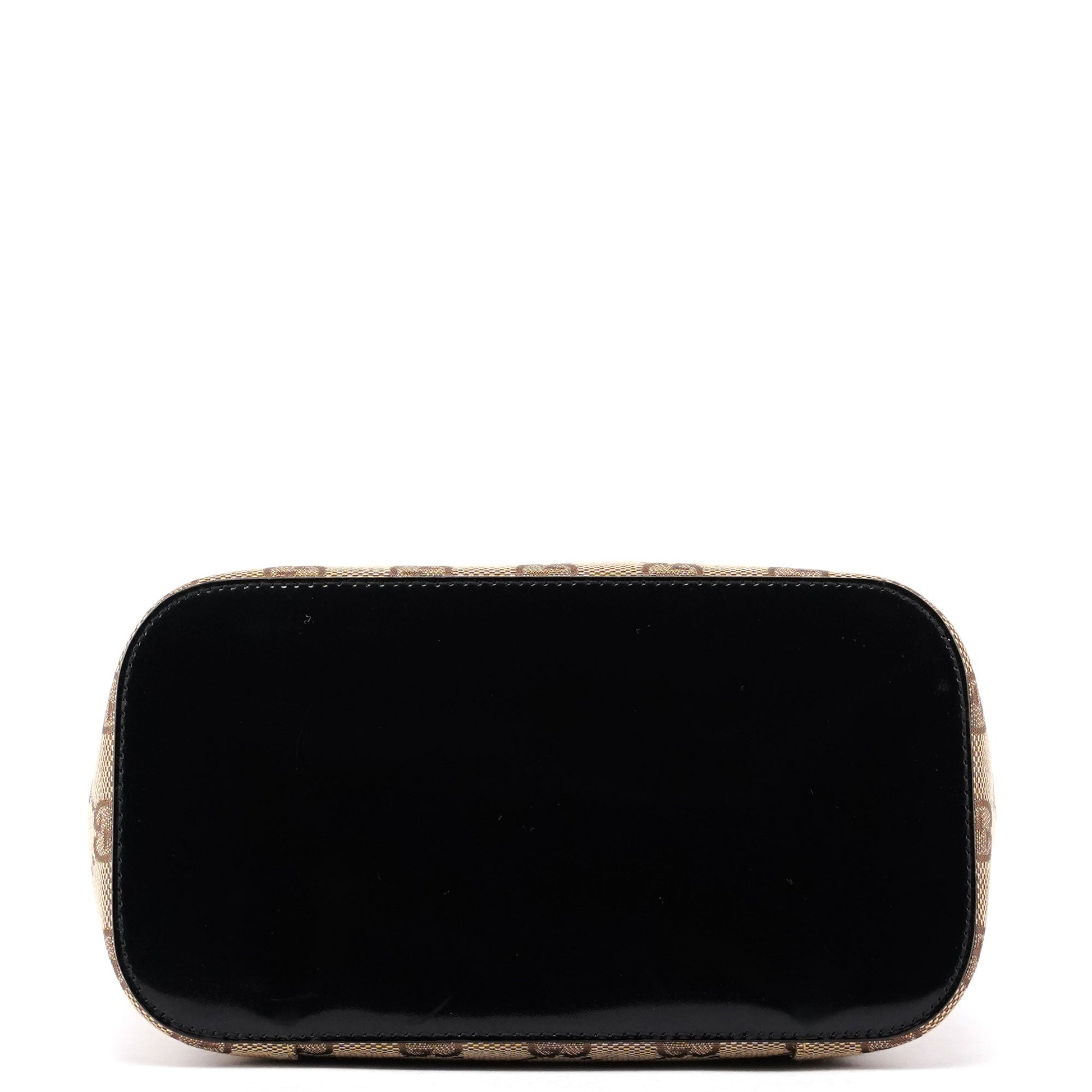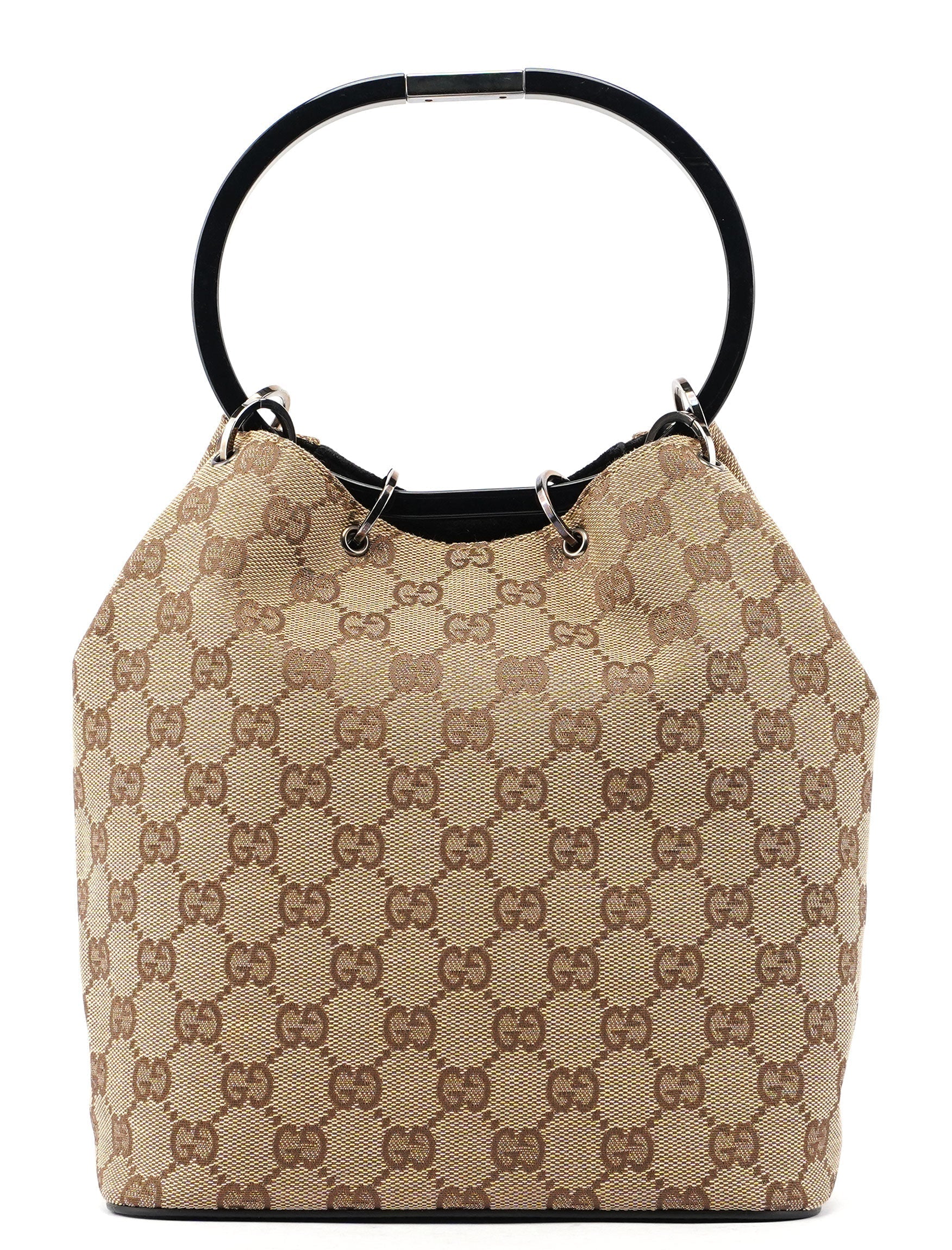 Designed by Tom Ford for the iconic 1999 collection, this incredibly rare Gucci GG Ring bag is handcrafted in the iconic GG beige monogram canvas with black patent leather trim and silver-tone hardware. It features a plastic handle and a suede-lined interior with an interior zipper pocket.