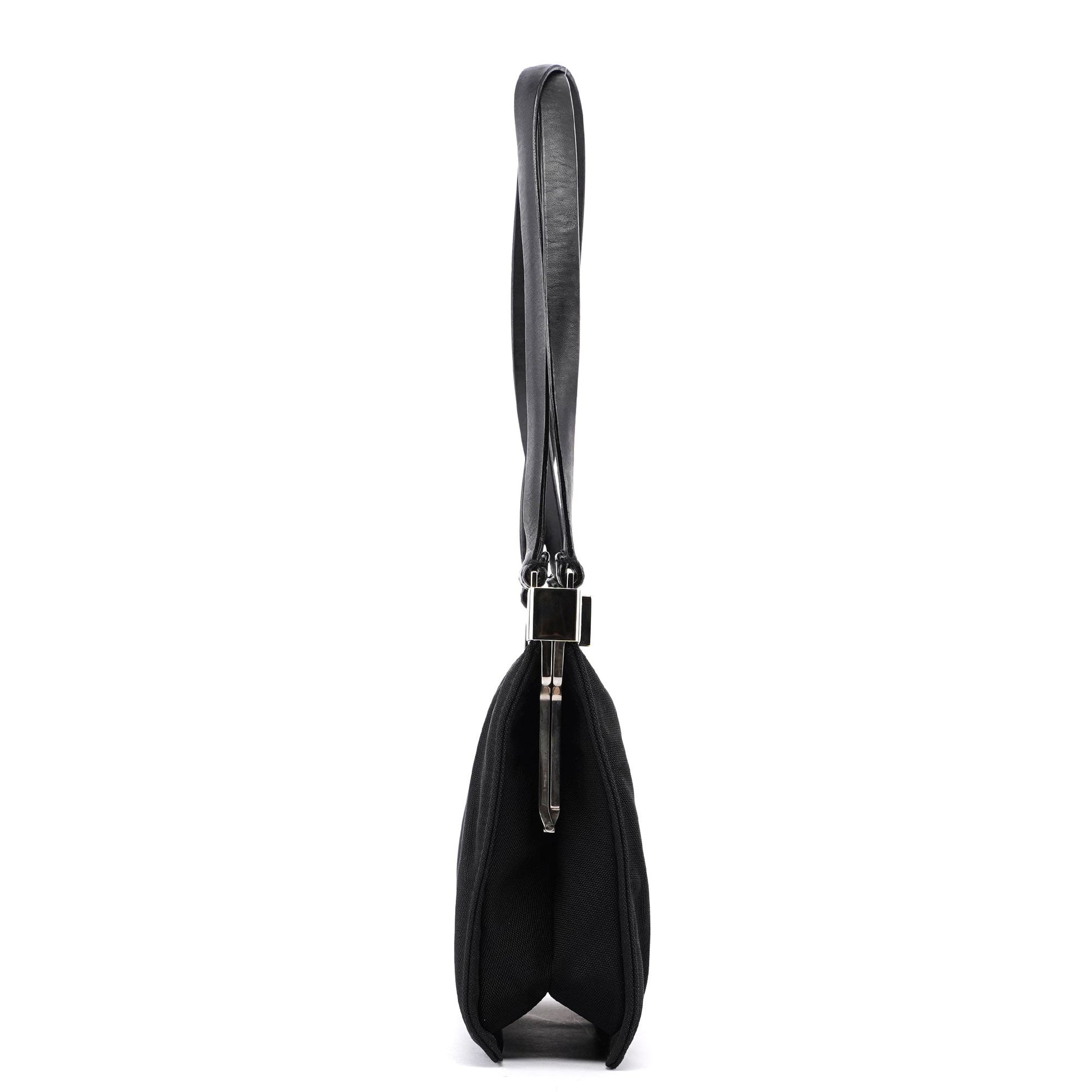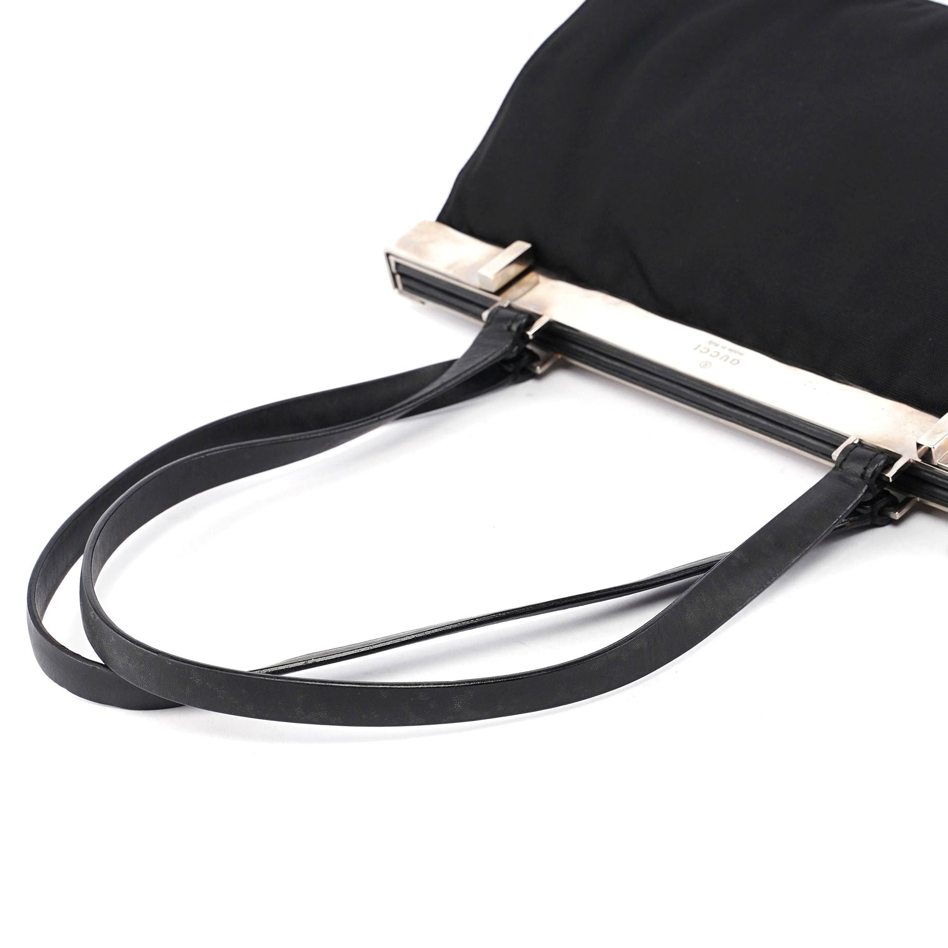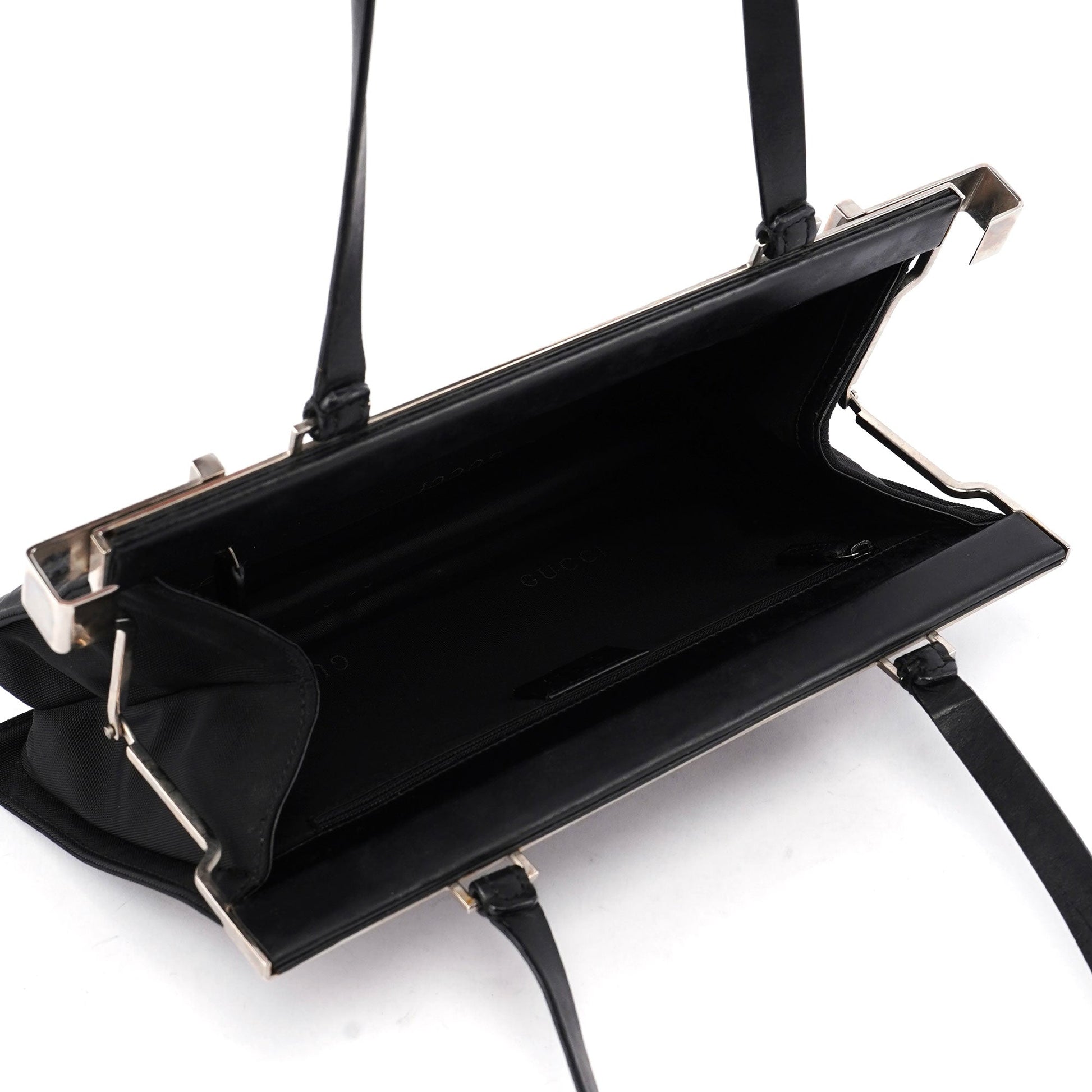 Explore the vintage Gucci tote bag, designed by Tom Ford in the late 1990s. This stylish piece features black cotton canvas with calfskin leather trim and handles, accented by a silver-tone clutch-style closure engraved with the Gucci logo. Its satin-lined interior includes two zipper pockets, merging classic design with functional elegance.