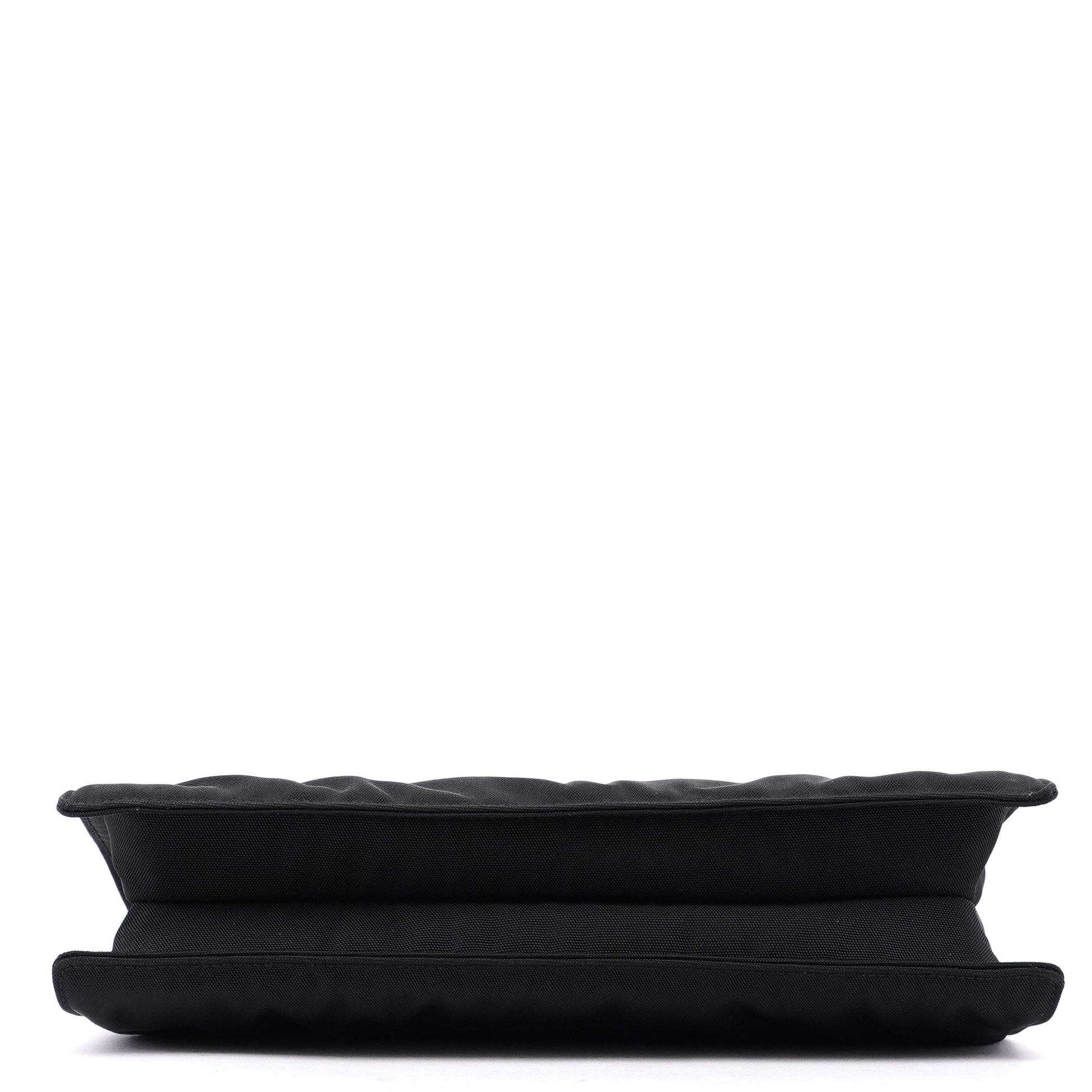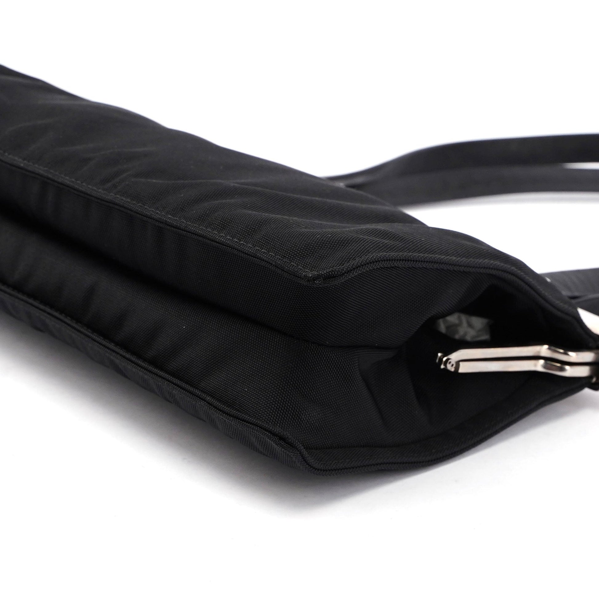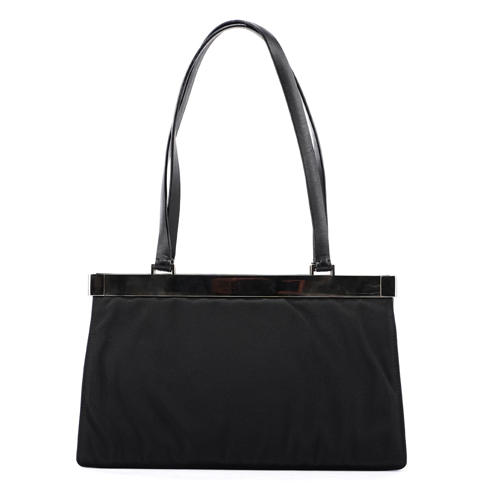 Explore the vintage Gucci tote bag, designed by Tom Ford in the late 1990s. This stylish piece features black cotton canvas with calfskin leather trim and handles, accented by a silver-tone clutch-style closure engraved with the Gucci logo. Its satin-lined interior includes two zipper pockets, merging classic design with functional elegance.