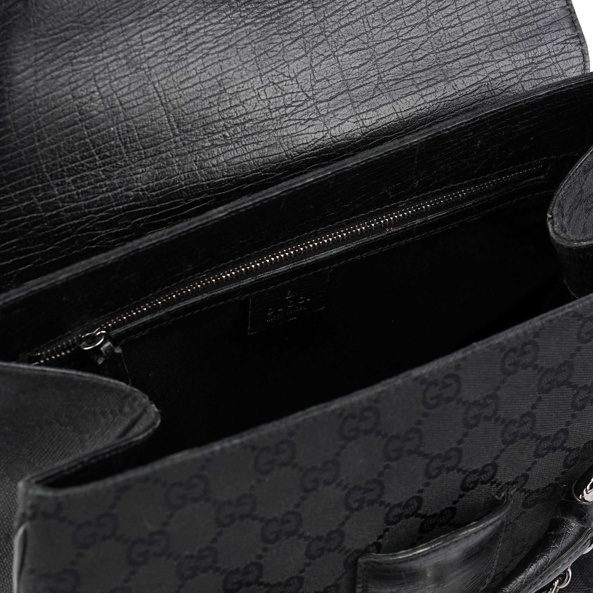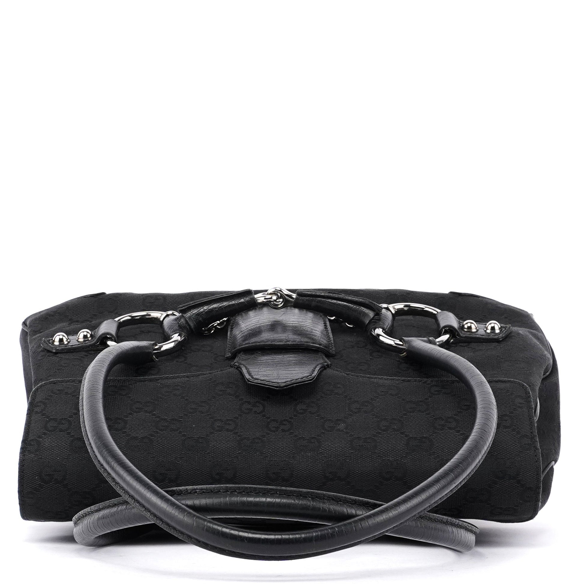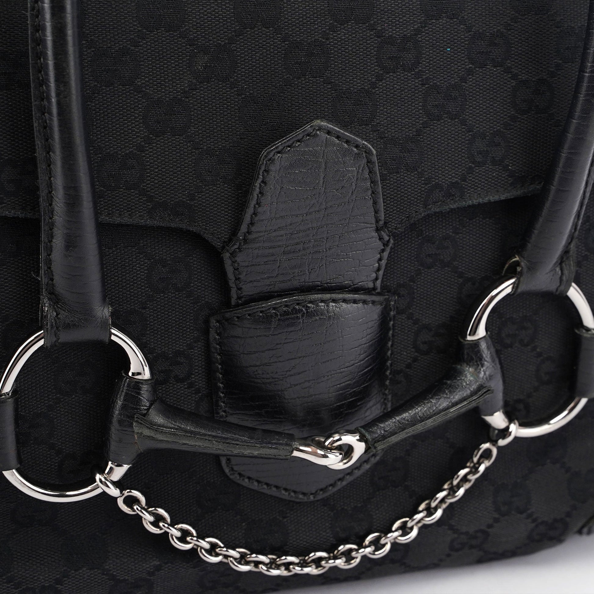 Handcrafted in GG monogram black canvas, the Gucci GG Horsebit bag, a creation of Tom Ford from the late 1990s, features tonal leather trim and silver-tone hardware. Its interior, lined in satin, boasts a practical zipper pocket.