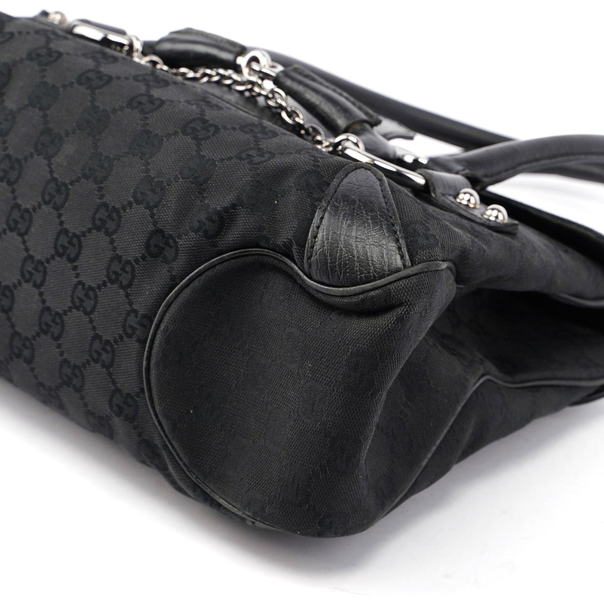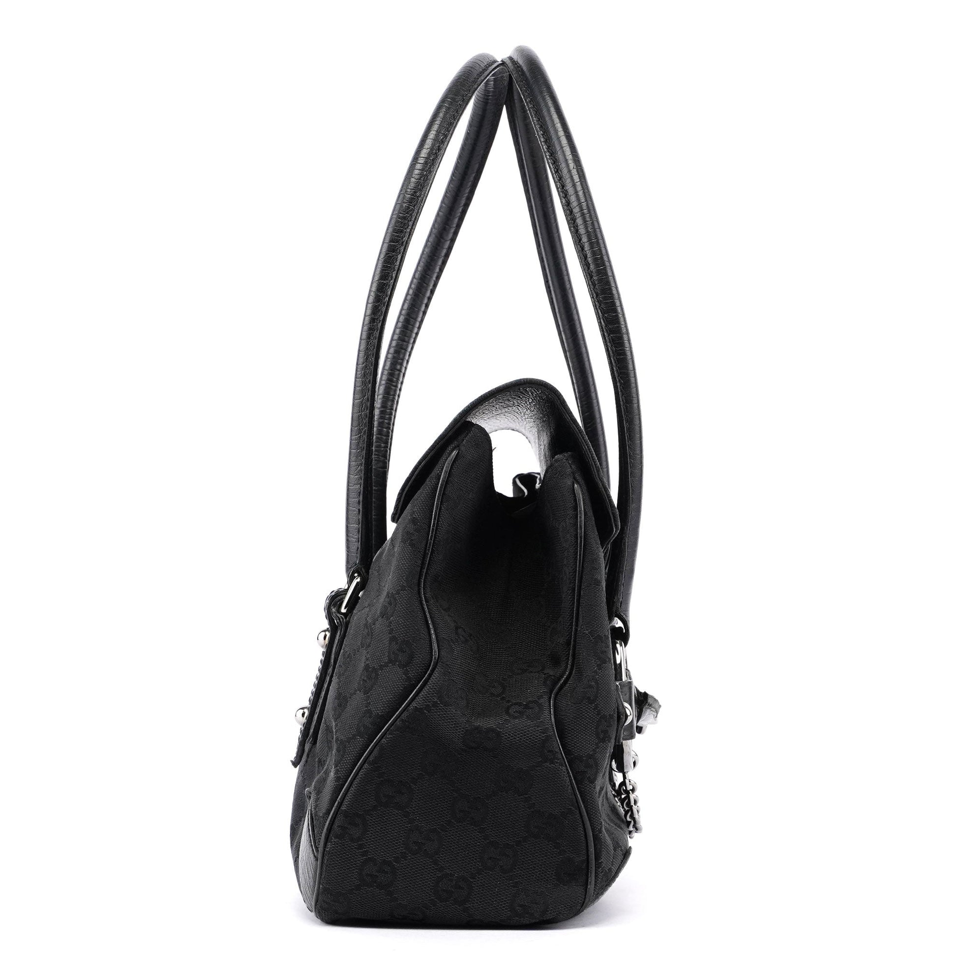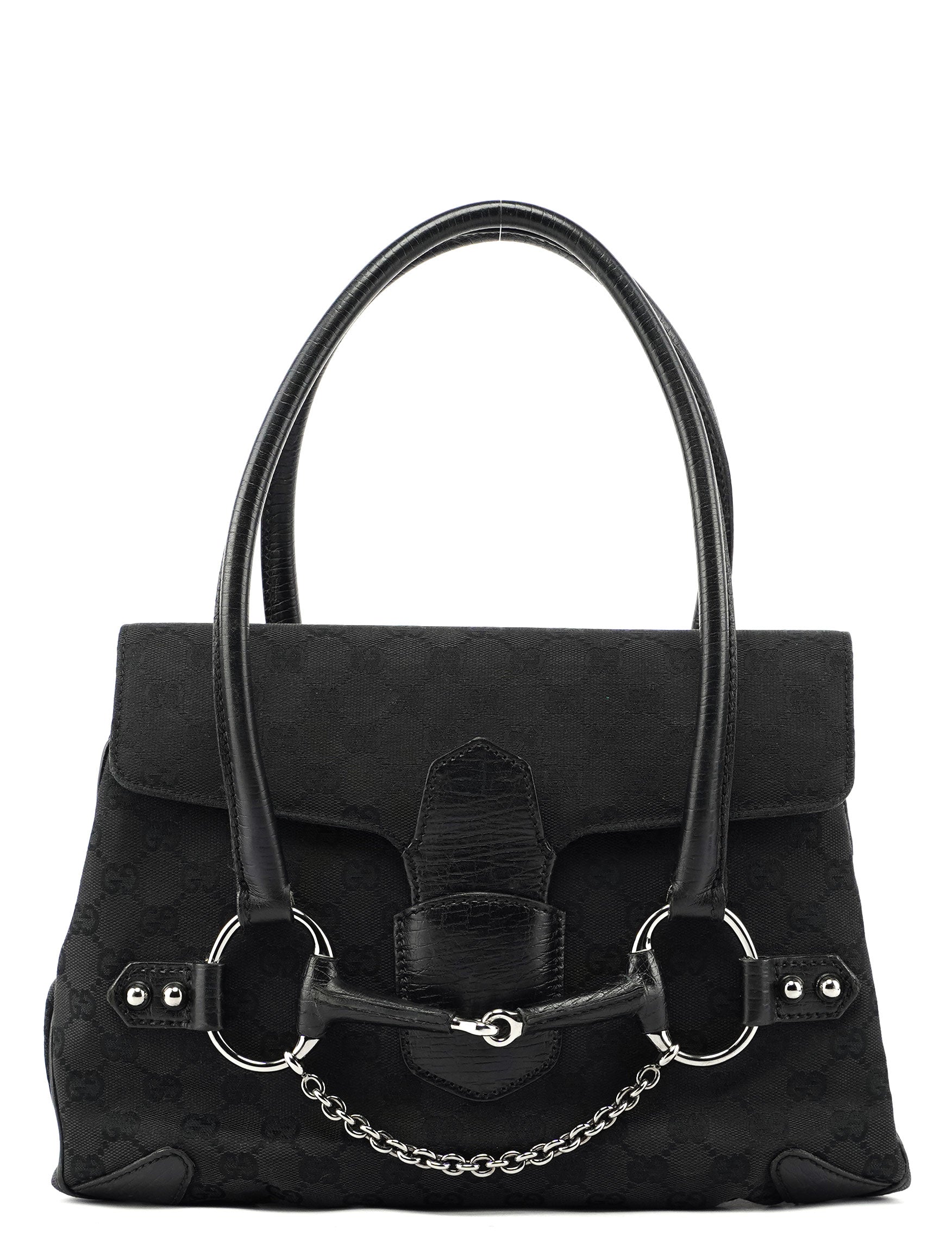 Handcrafted in GG monogram black canvas, the Gucci GG Horsebit bag, a creation of Tom Ford from the late 1990s, features tonal leather trim and silver-tone hardware. Its interior, lined in satin, boasts a practical zipper pocket.