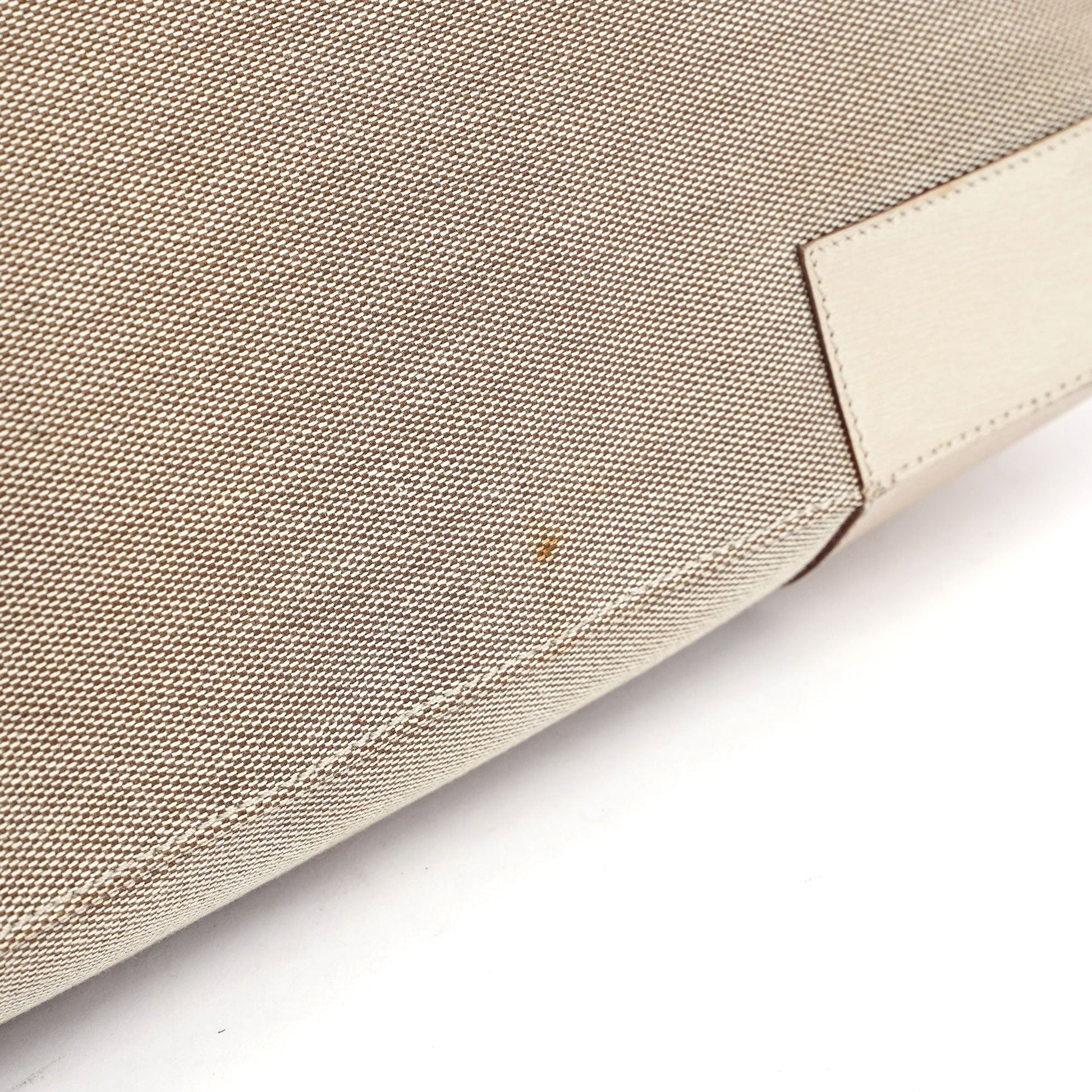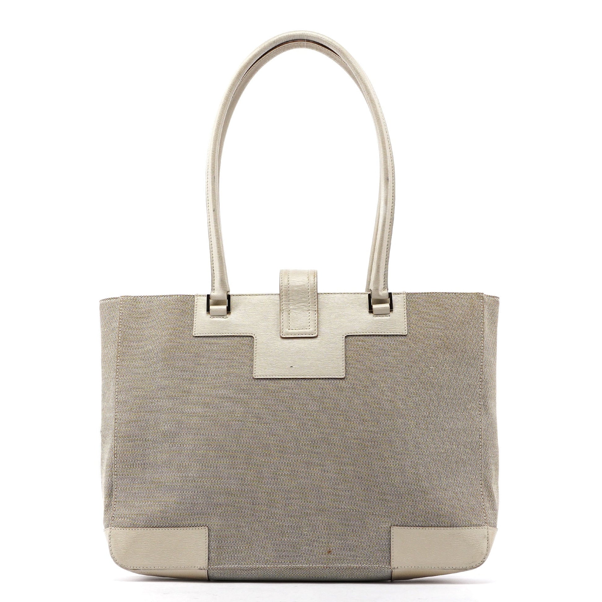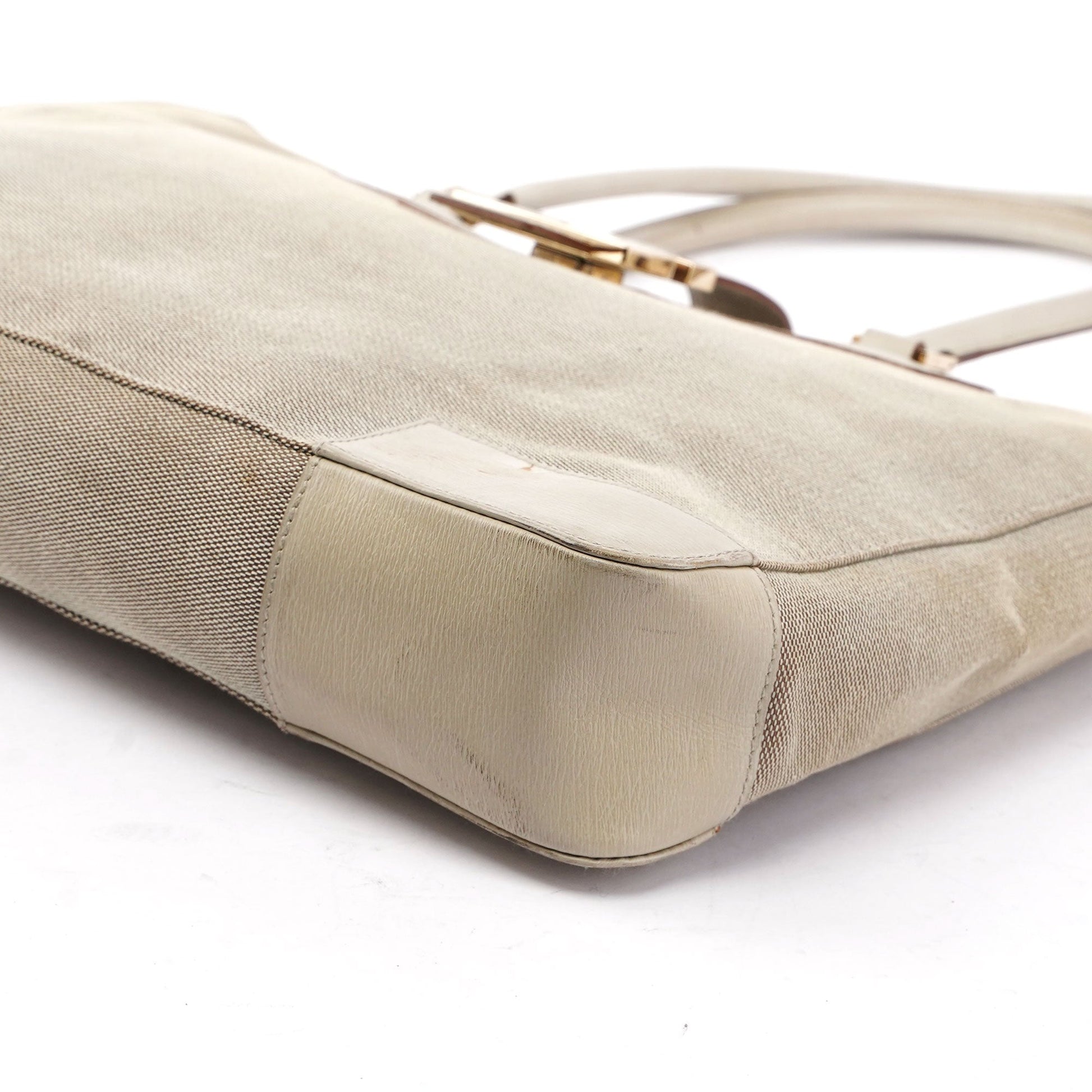 This Gucci Square G tote, a late 1990s design by Tom Ford, is handcrafted in beige canvas with tonal leather trim, featuring a gold-tone Square G on the front. The interior is lined with beige monogram satin and includes an interior zipper pocket for functionality.