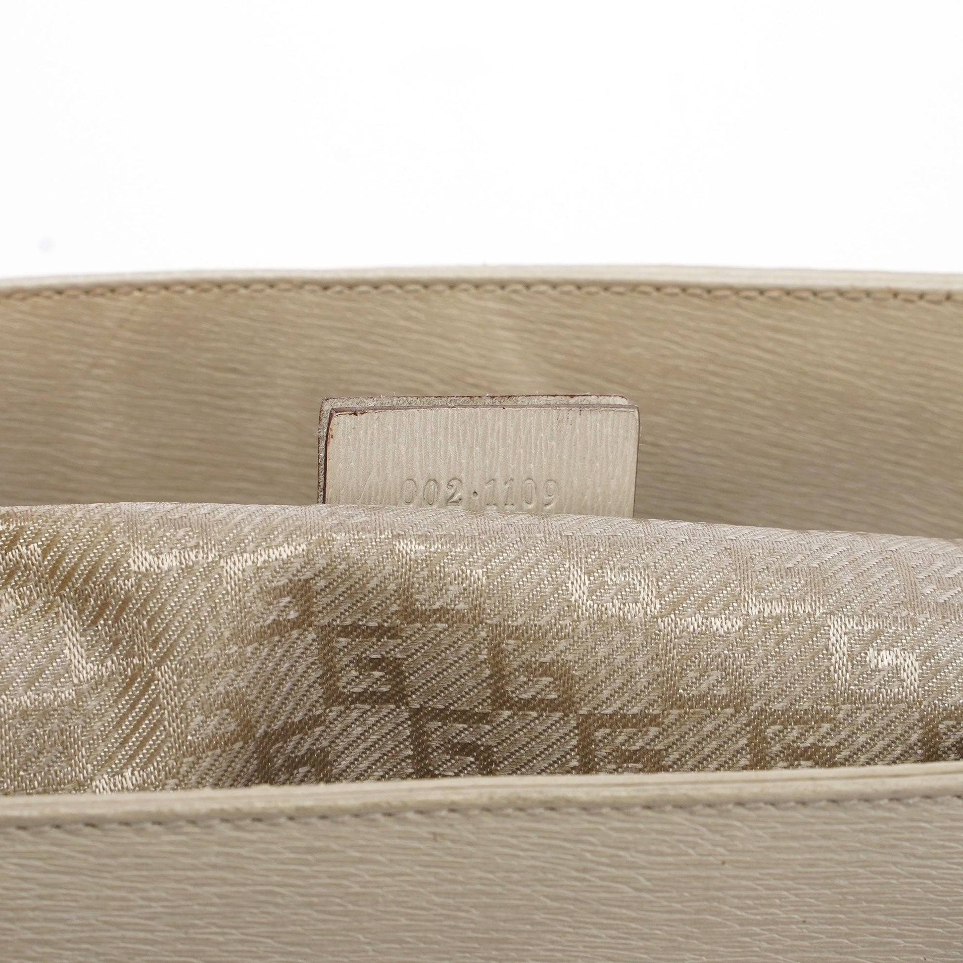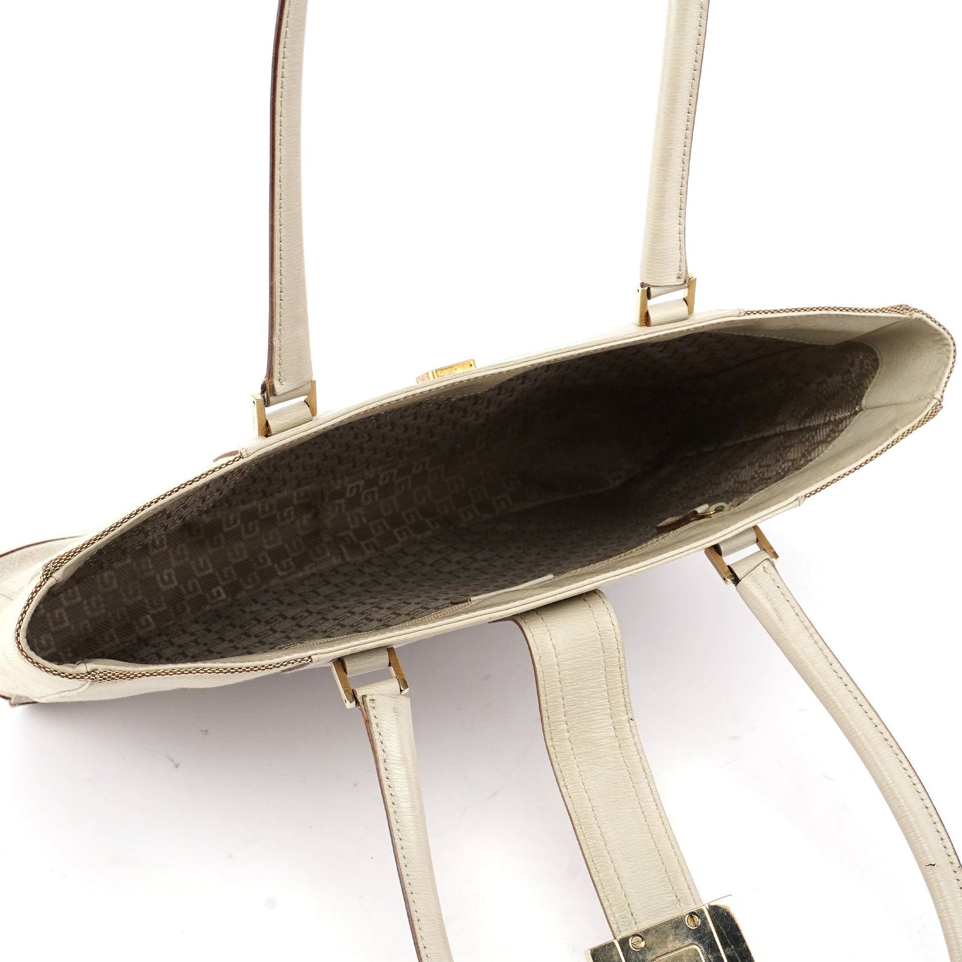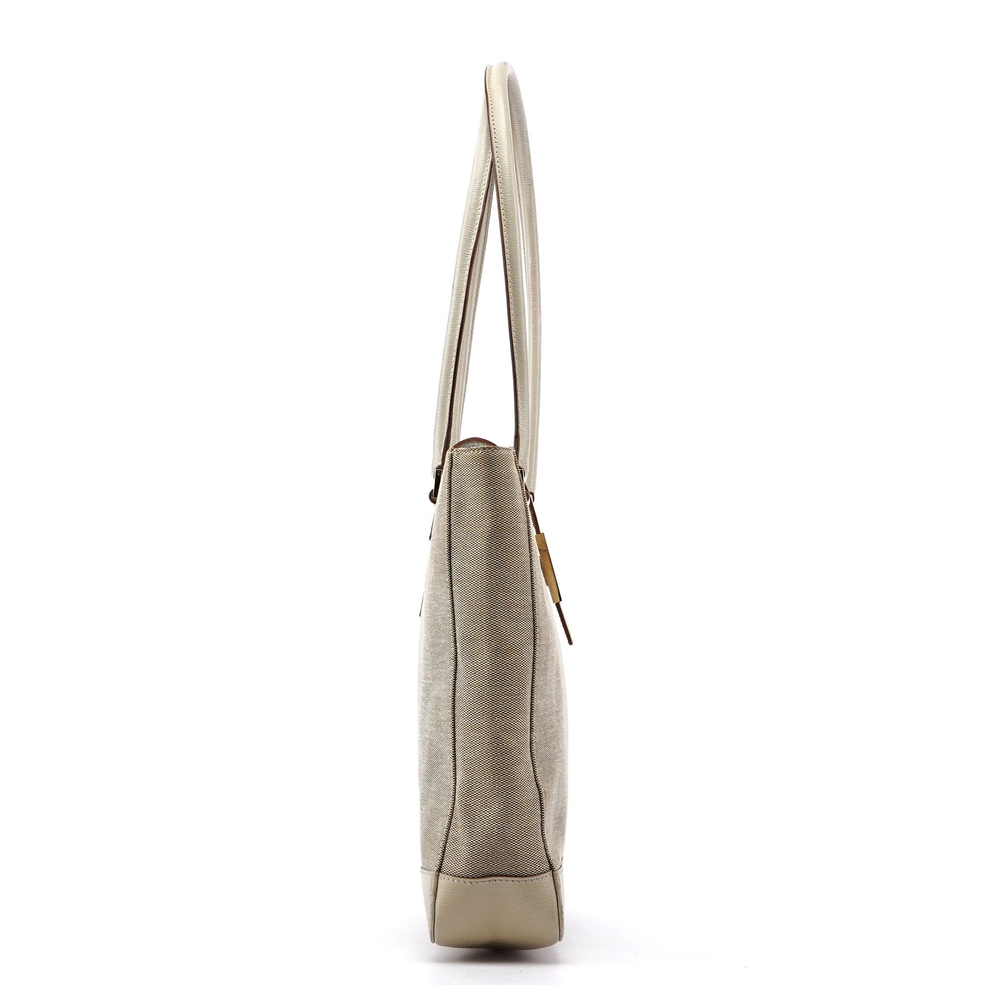 This Gucci Square G tote, a late 1990s design by Tom Ford, is handcrafted in beige canvas with tonal leather trim, featuring a gold-tone Square G on the front. The interior is lined with beige monogram satin and includes an interior zipper pocket for functionality.