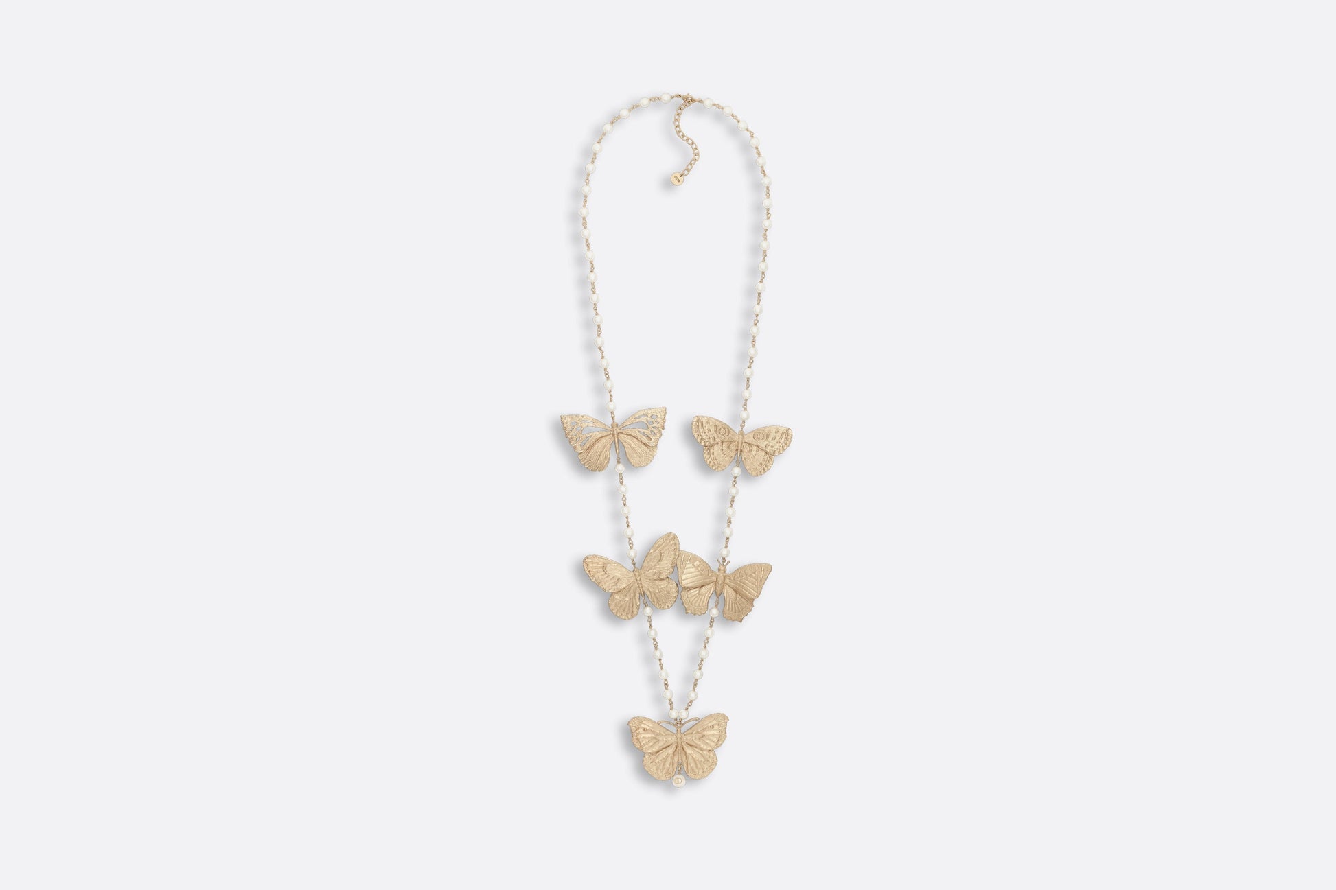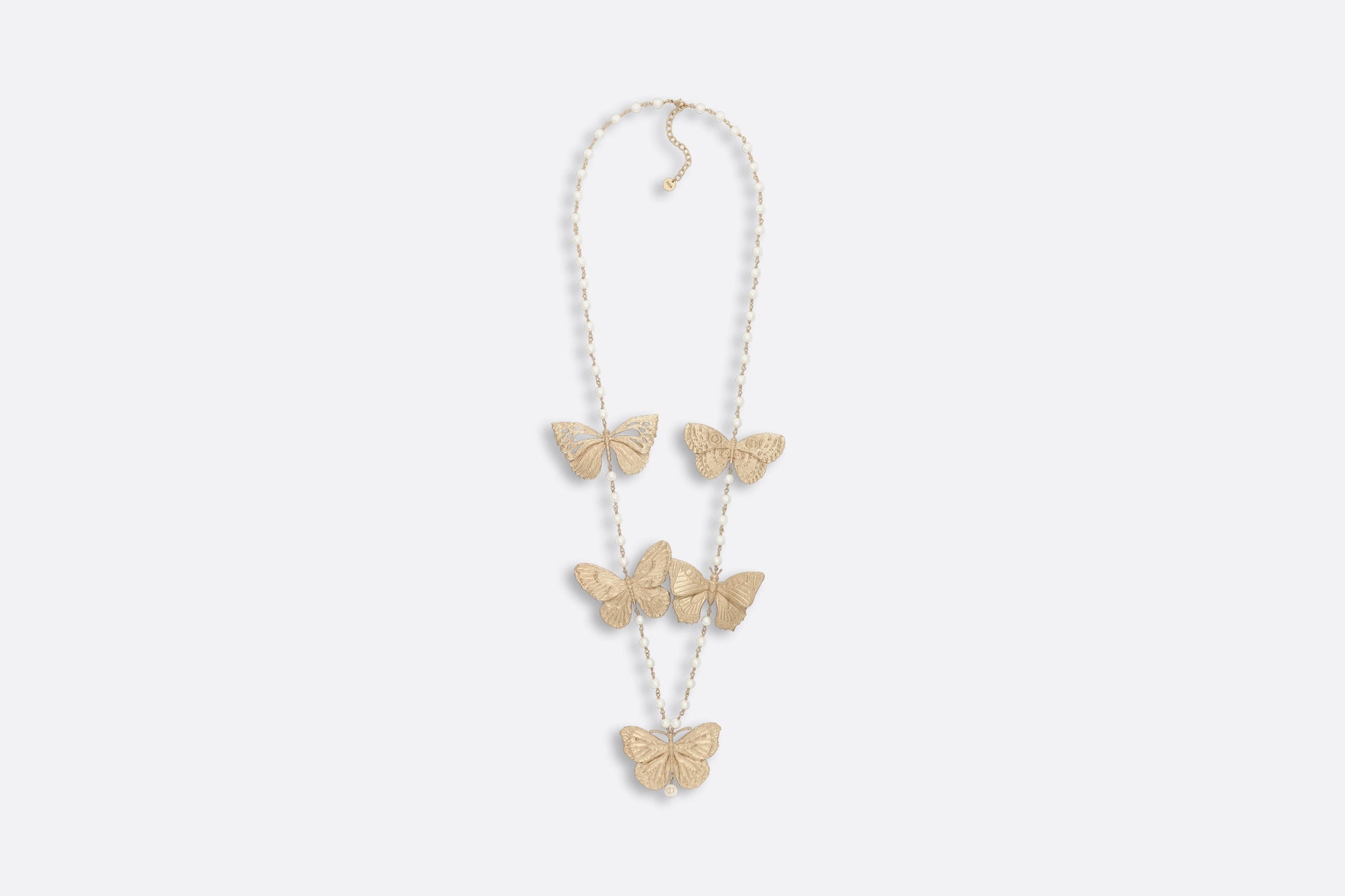 Unveiled at the Cruise 2024 fashion show, the Dior Métamorphose long necklace suggests transformation, evolution and freedom through a signature animal from the collection. Embodying the House's exceptional savoir-faire, the resin pearl-punctuated chain features oversized butterflies finely crafted in matte gold-finish metal and embellished with a white CD resin pearl. The elegant long necklace can be styled with other creations from the Dior Métamorphose line.