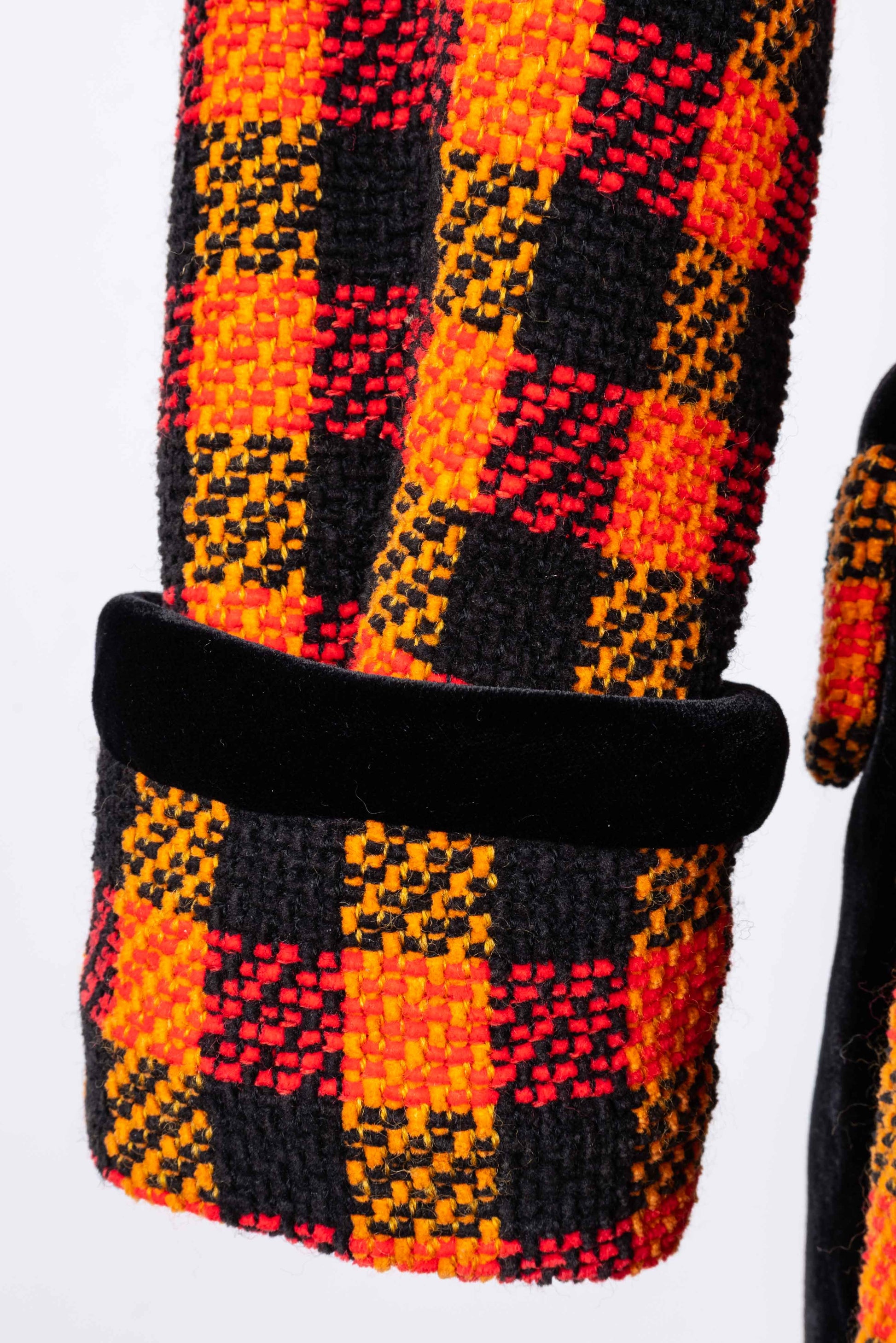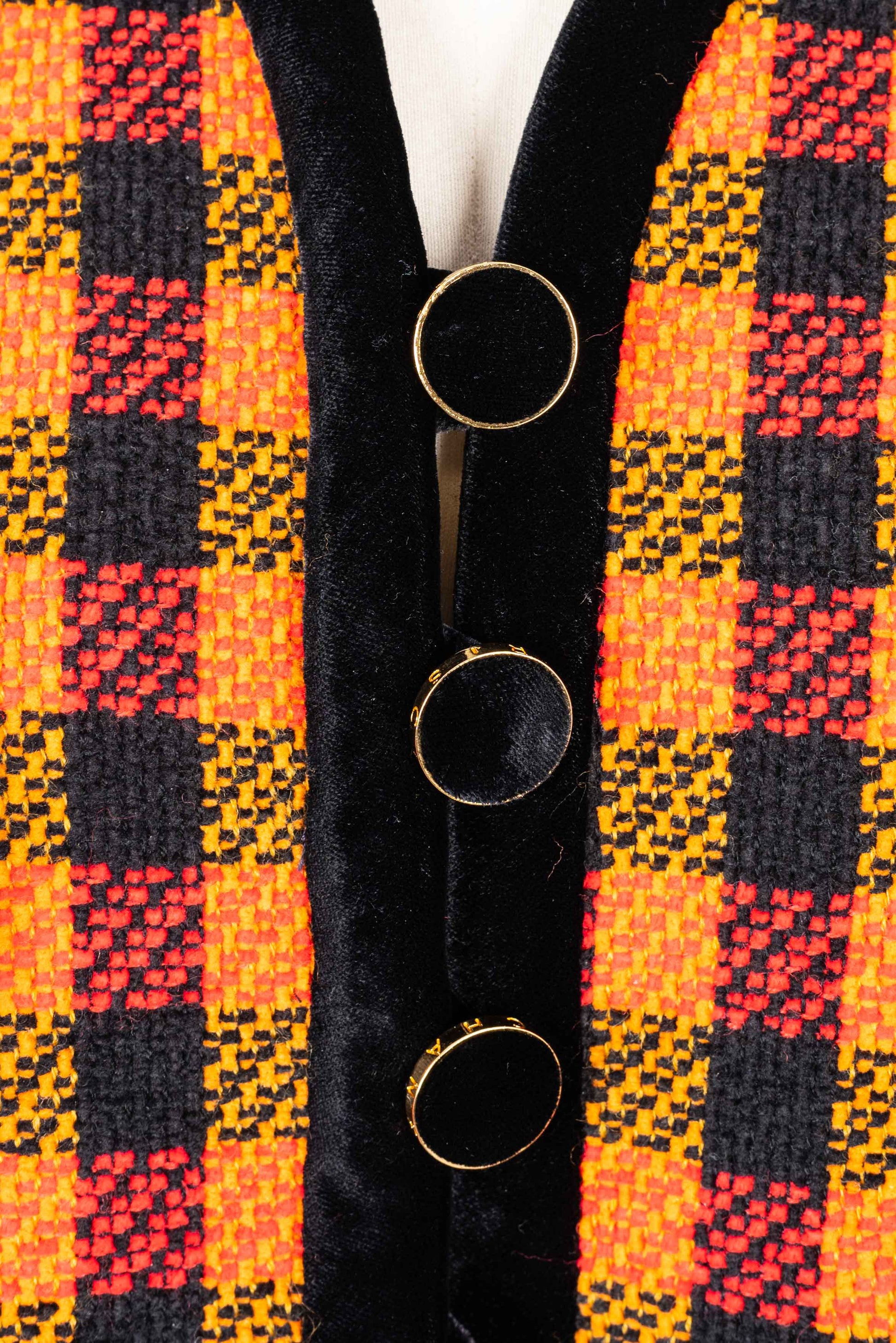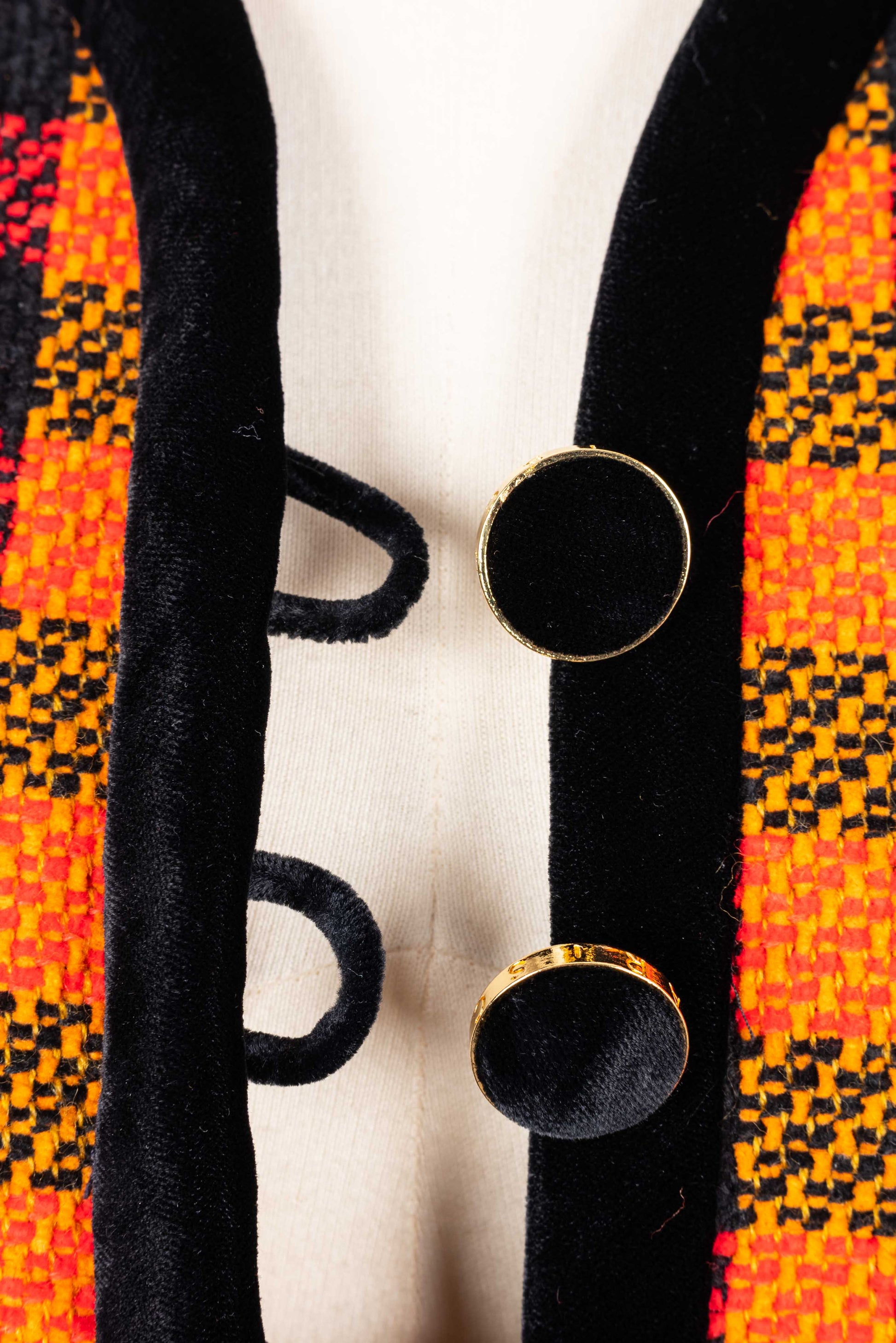 CHANEL - (Made in France) Ensemble de tailleur composé d'une jupe et d'une veste en tweed à carreaux dans les tons de jaune, orange et de rouge. Les poches et le tour de la veste sont en velours noir. Doublure en soie. Taille indiquée 38FR. Ensemble datant des années 1990.