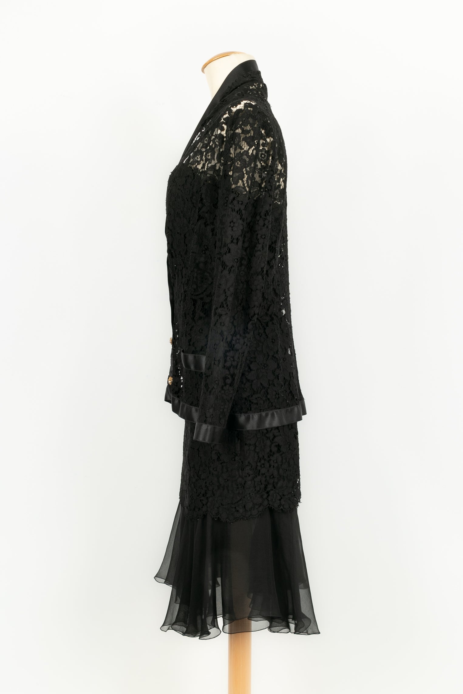 CHANEL -(Made in France) Ensemble en dentelle et soie noir composé d'un haut bustier, d'une jupe et d'un gilet se fermant par des boutons camélia. Taille 40FR. Collection Automne-Hiver 1990/91.