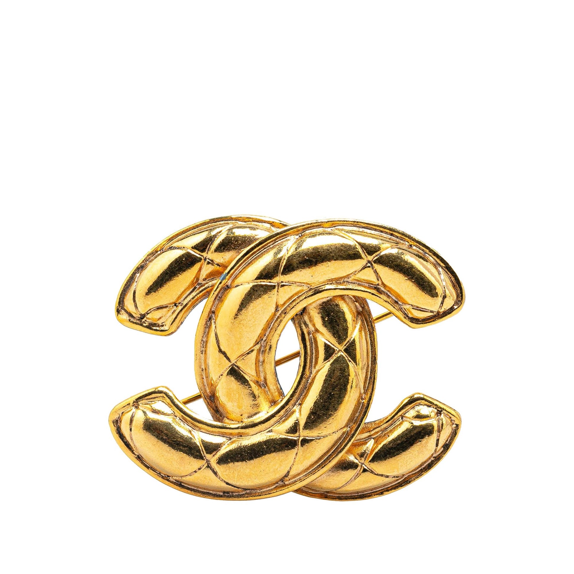 Product Details: Gold Chanel CC Gold Plated Brooch. This brooch features gold plated and pin closure. 1.4" L x 1.8" W x 0" D.