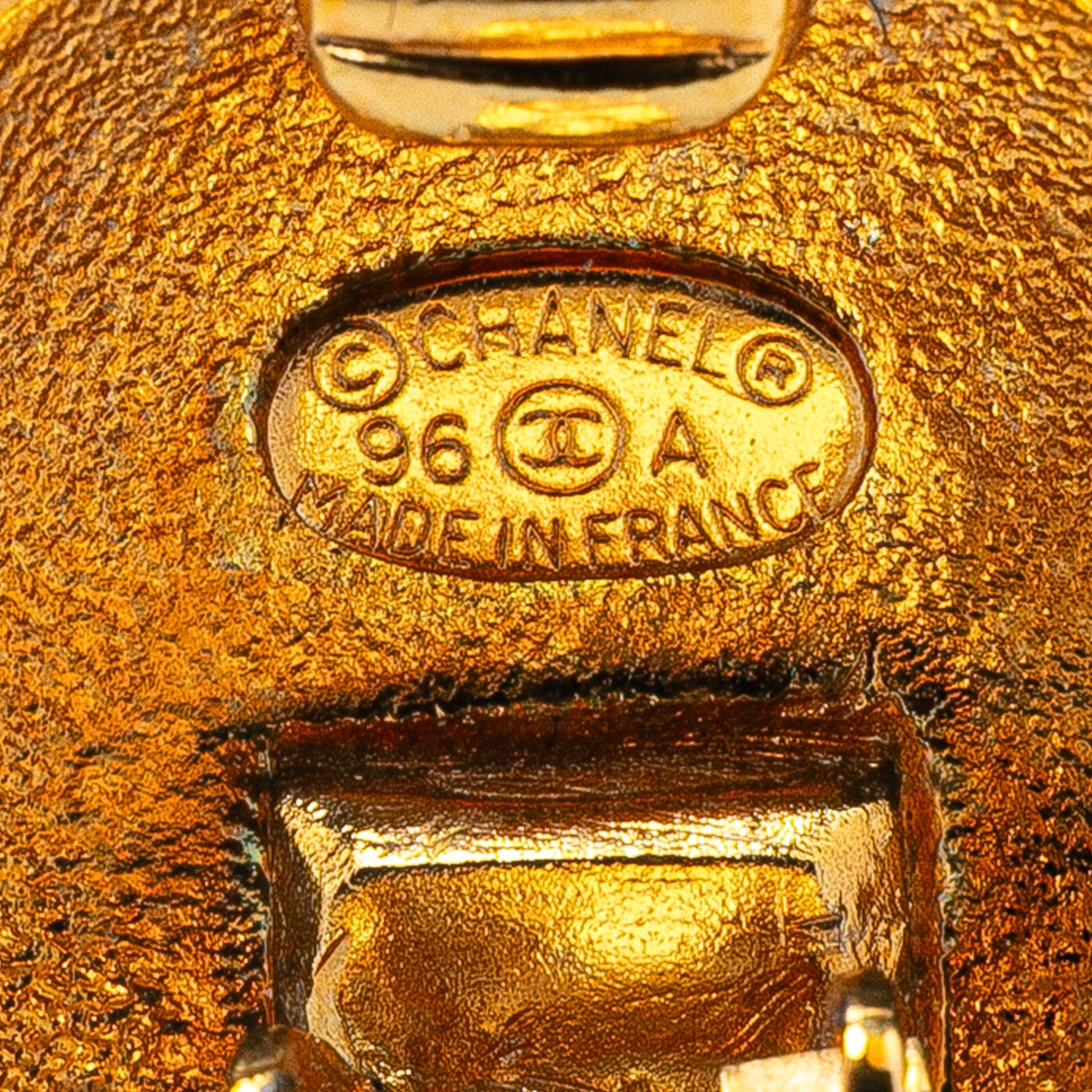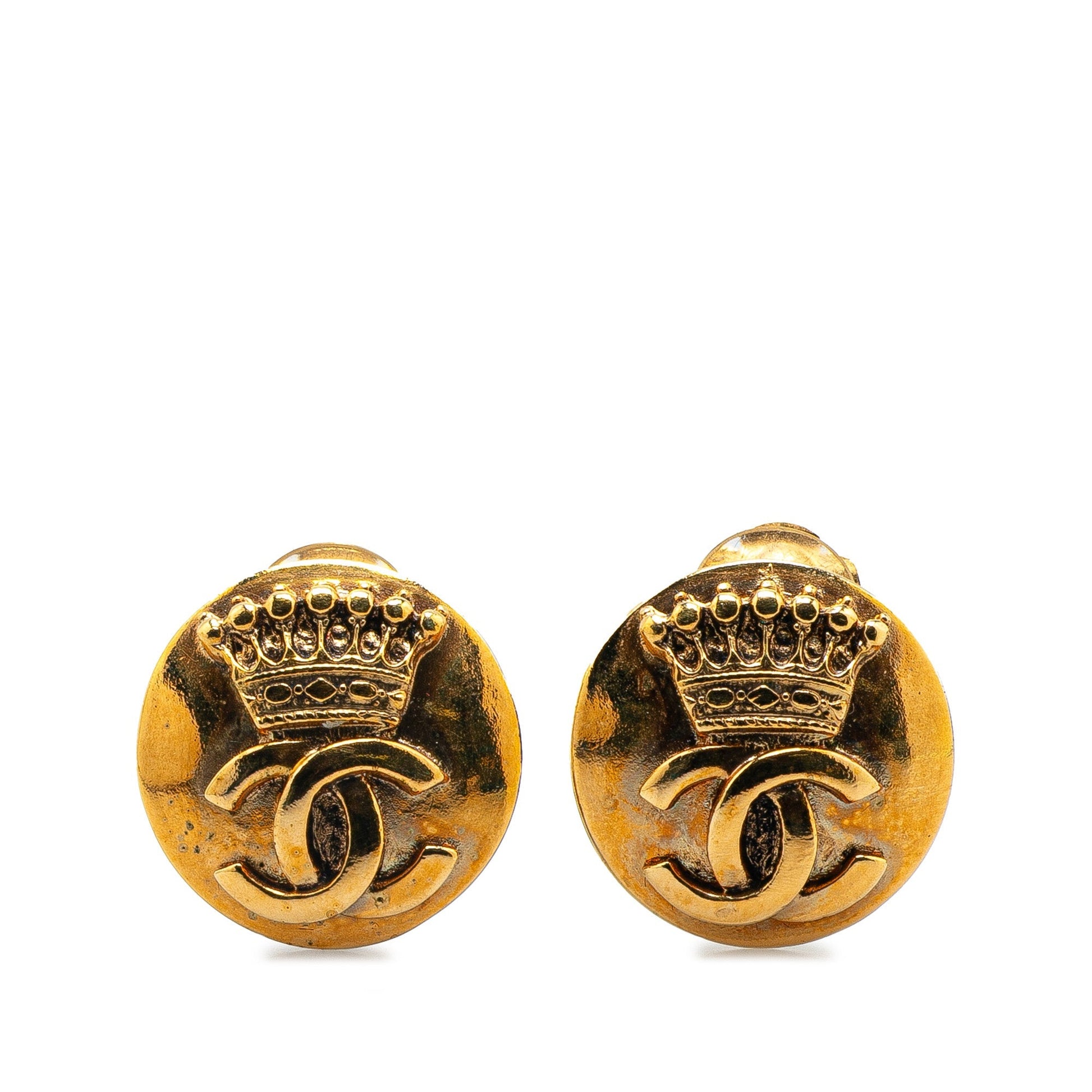 Product Details: Gold Chanel Gold Plated CC Crown Clip On Earrings. These earrings feature a gold plated metal body and a back clip on closure. 0.8" L x 0.8" W x 0" D. Serial number 96A.