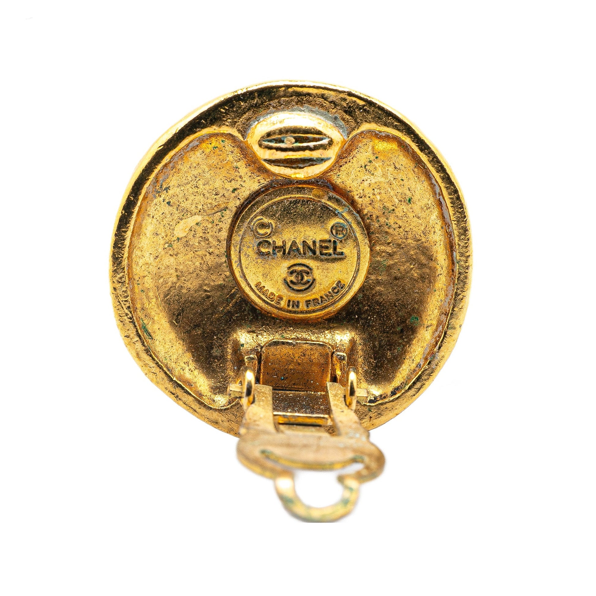 Product Details: Gold Chanel Gold Plated CC Round Clip on Earrings. These earrings feature a gold-plated body and clip-on closure. 1" L x 1" W x 0" D.