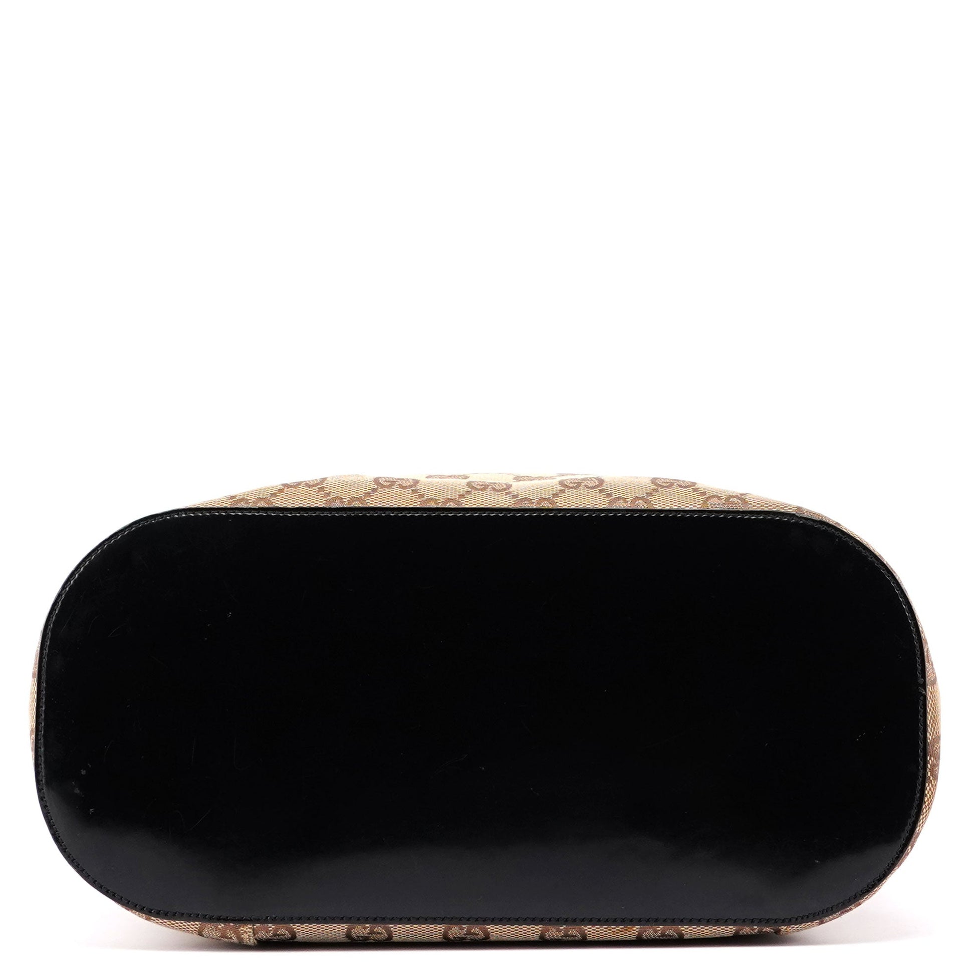 Designed by Tom Ford for the iconic 1999 collection, this incredibly rare Gucci GG Ring bag is handcrafted in the iconic GG beige monogram canvas with black patent leather trim and silver-tone hardware. It features a gloss blackhandle and a suede-lined interior with an interior zipper pocket.