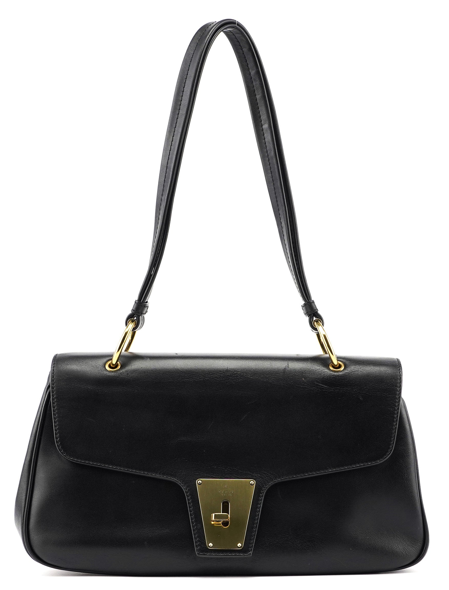 Handcrafted in black calfskin leather, this Gucci Lock Vitello bag by Tom Ford from the 1990s features gold-tone hardware engraved with the Gucci logo, a lock closure, and a back zipper pocket. The interior is lined in GG monogram satin with a zipper pocket, showcasing timeless elegance.