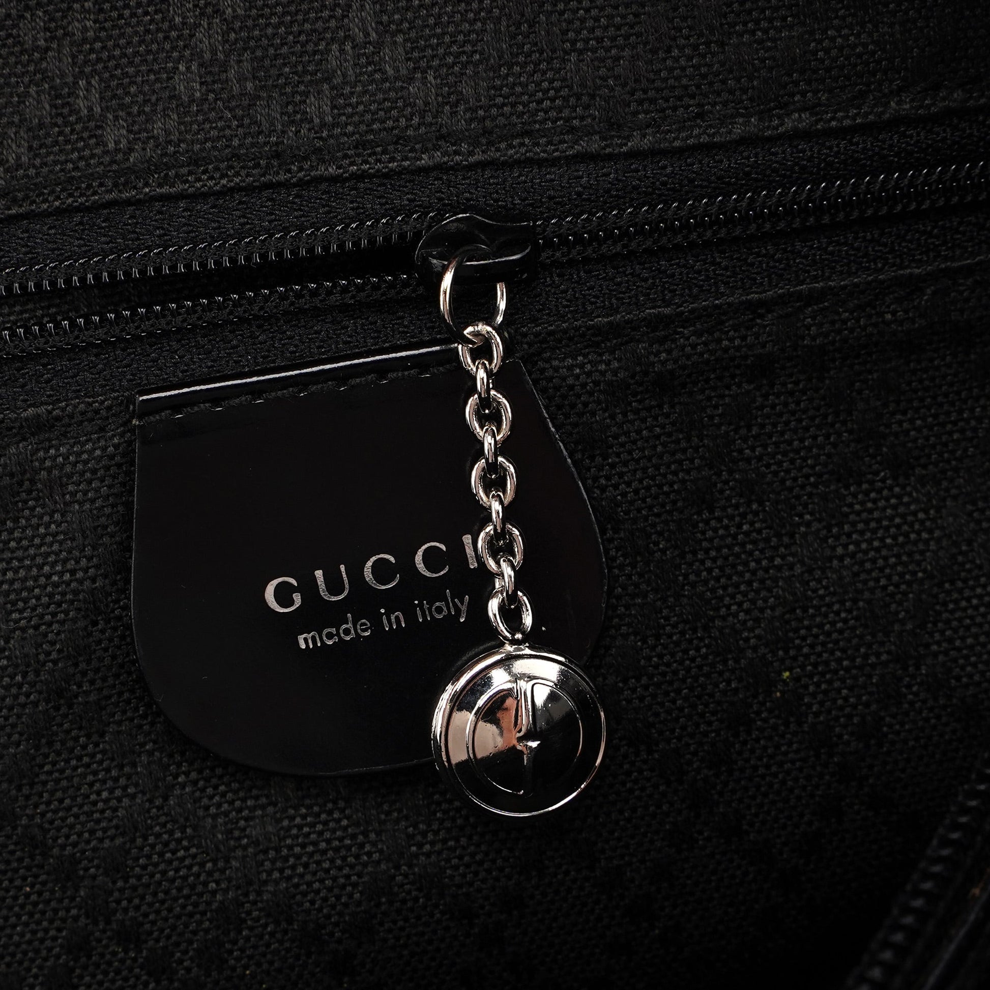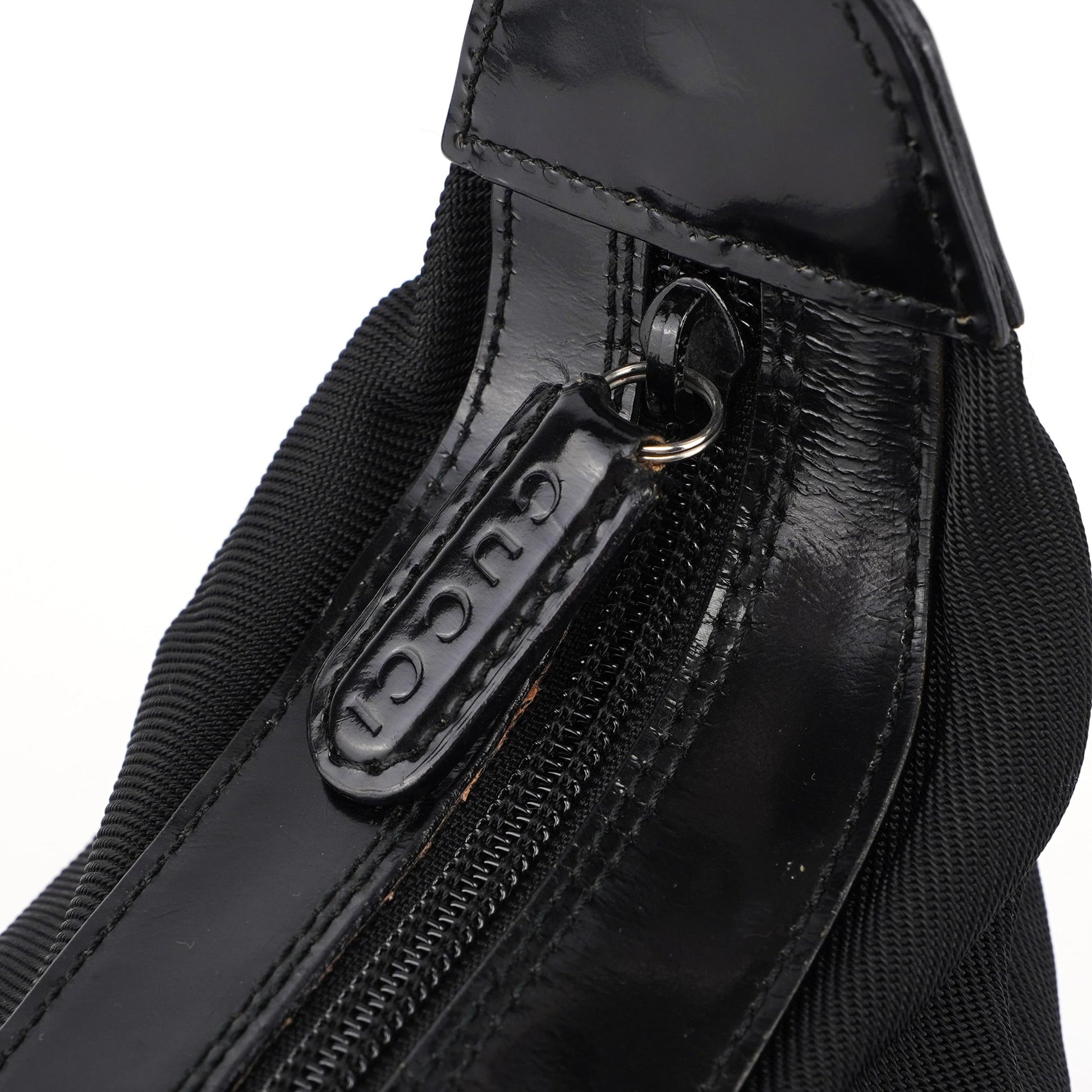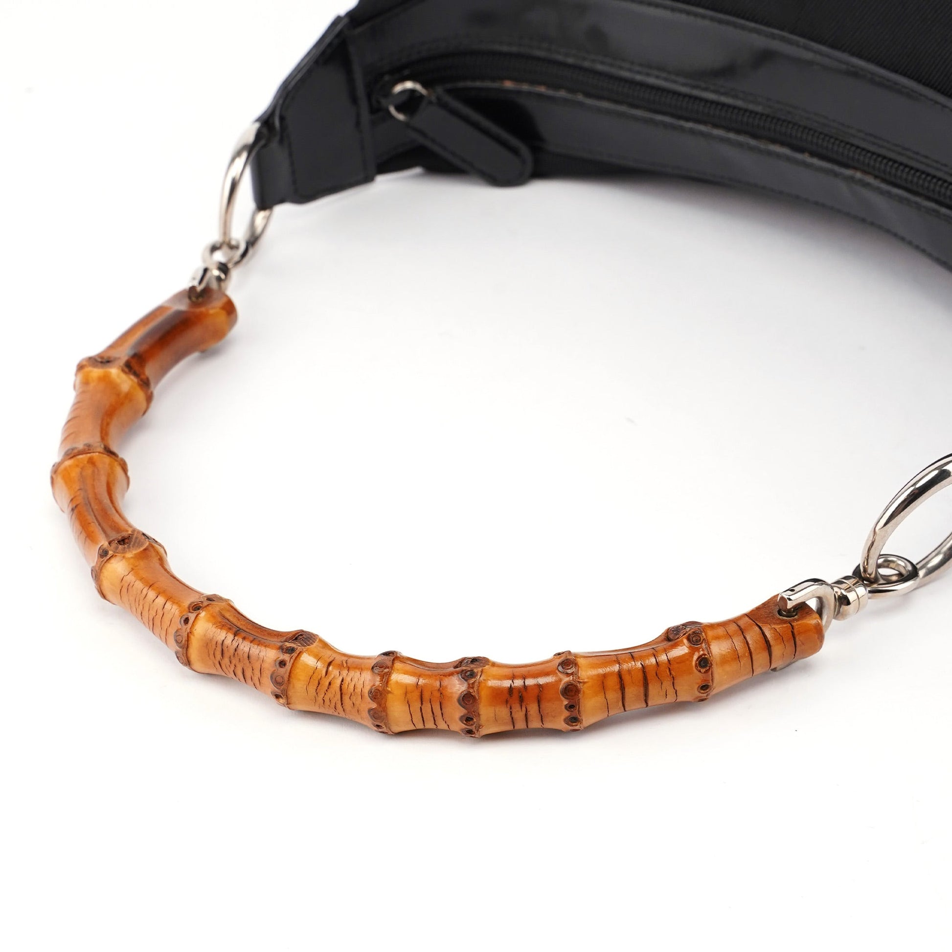 This Gucci Bamboo shoulder bag is a design by Tom Ford from the late 1990s. It features a bamboo handle and is handcrafted from black canvas, silver-tone hardware, and tonal patent leather trim. The bag's zipper-closed compartment is lined with satin and includes an interior zipper pocket.