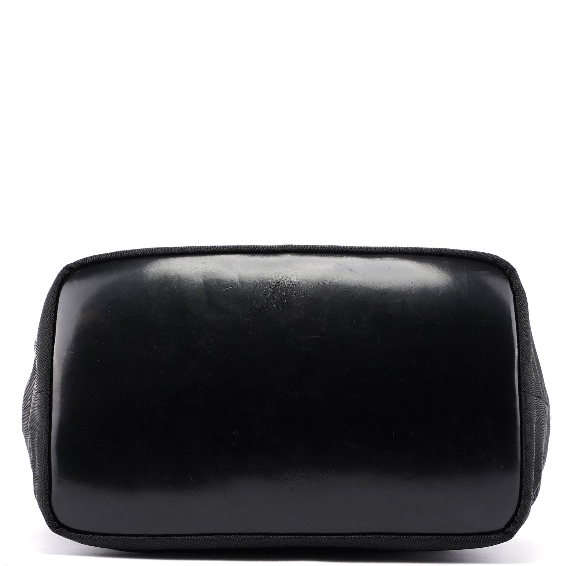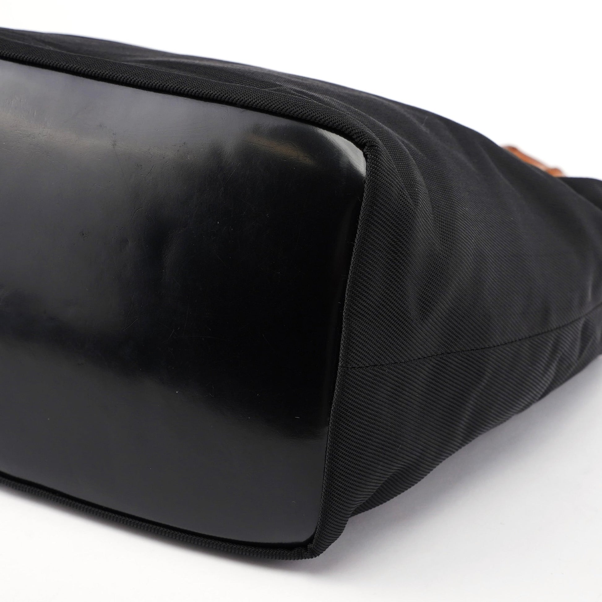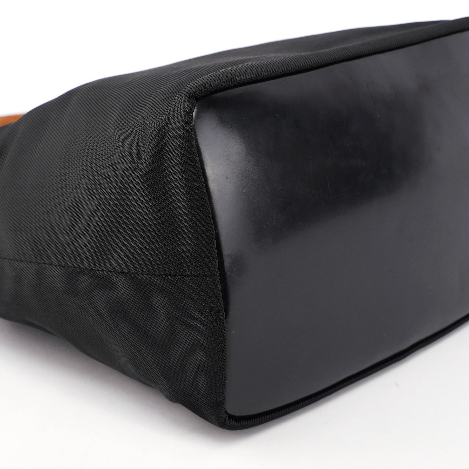This Gucci Bamboo shoulder bag is a design by Tom Ford from the late 1990s. It features a bamboo handle and is handcrafted from black canvas, silver-tone hardware, and tonal patent leather trim. The bag's zipper-closed compartment is lined with satin and includes an interior zipper pocket.