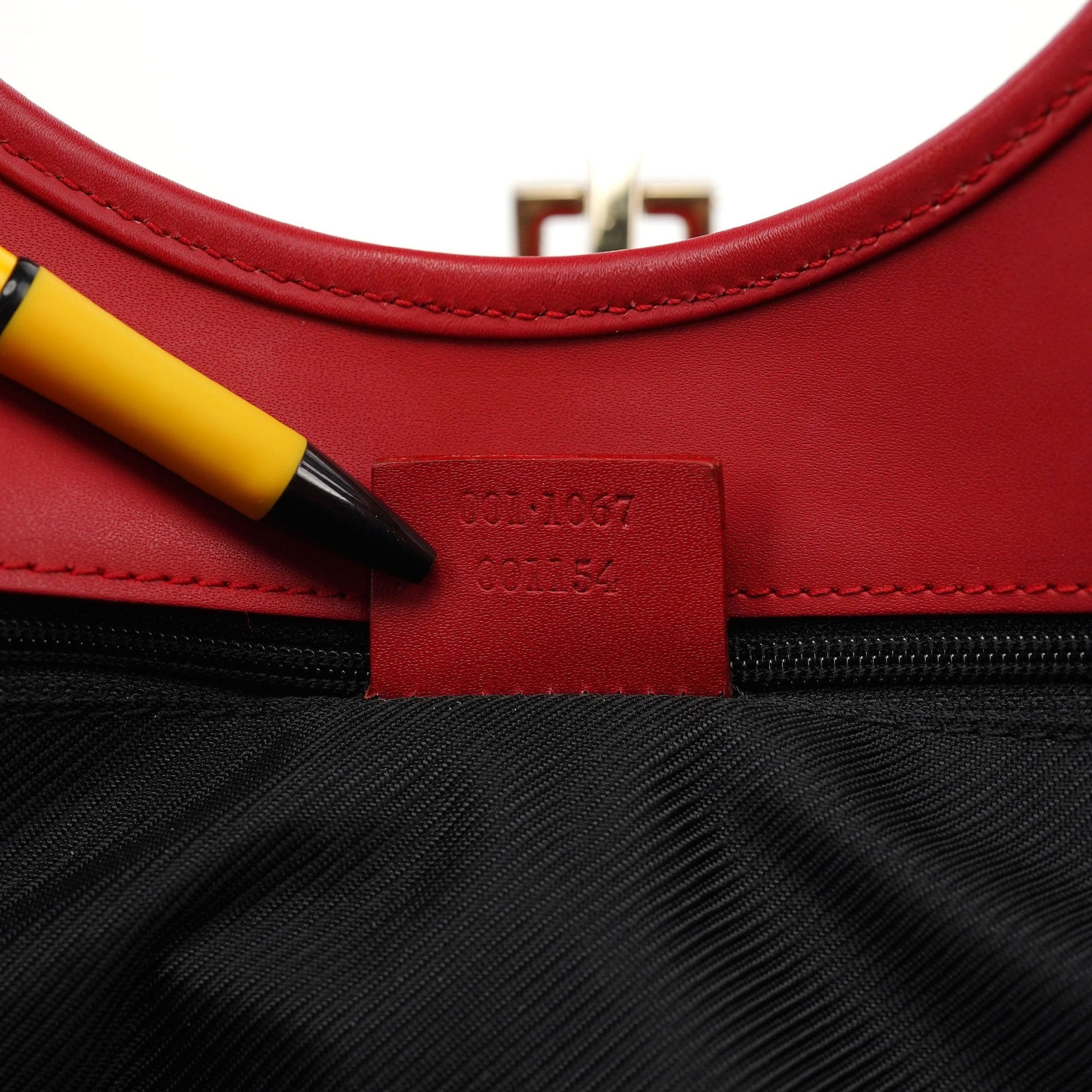 Designed by Tom Ford in the late 1990s, this Gucci Jackie shoulder bag pairs beige GG monogram canvas with vibrant red leather trim. The iconic piston lock closure and gold-tone hardware add signature detailing, while the satin-lined interior with a zip pocket balances elegance with everyday function.