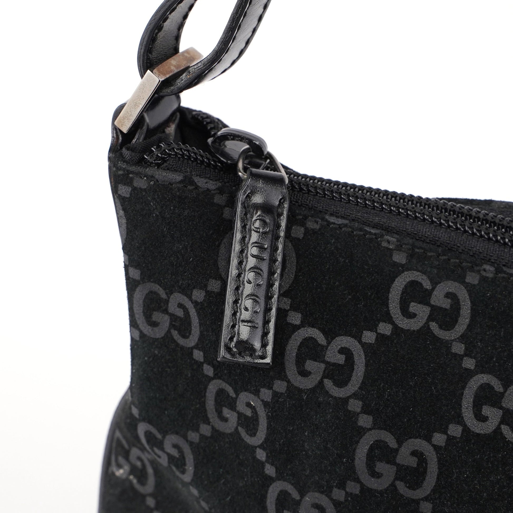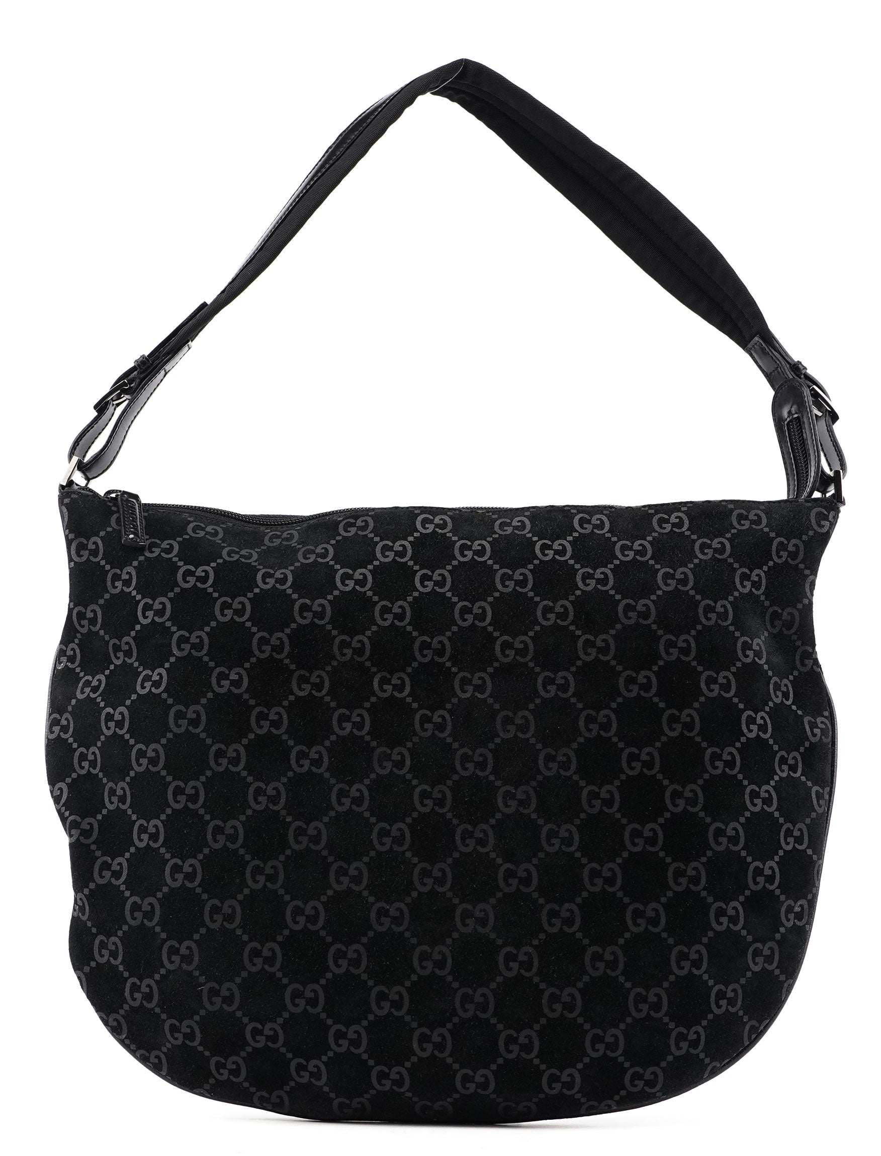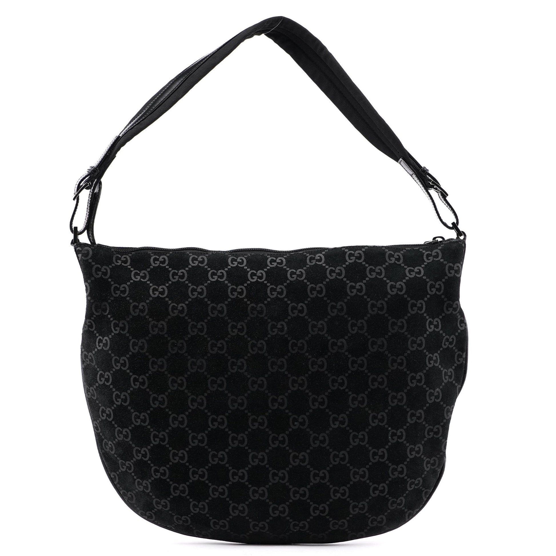 The Gucci GG Suede shoulder bag, designed by Tom Ford in 1997, is handcrafted from black GG monogram suede and accented with silver-tone hardware and black calfskin leather trim. It features a zipper closure that secures the cotton-lined interior, complete with an additional zipper pocket for organized storage.