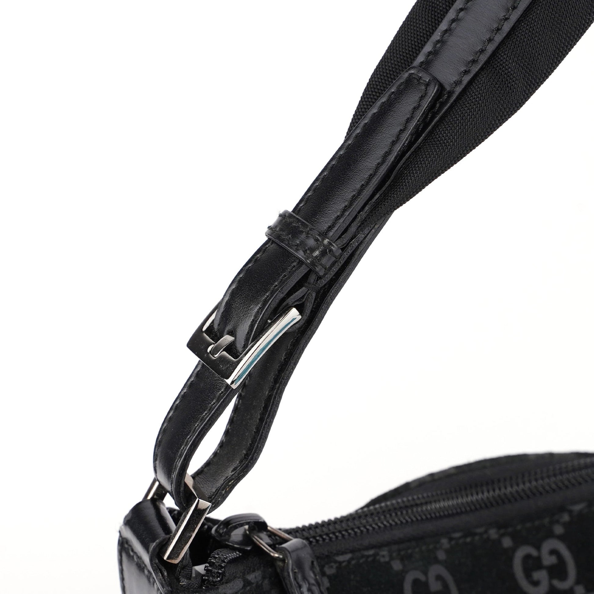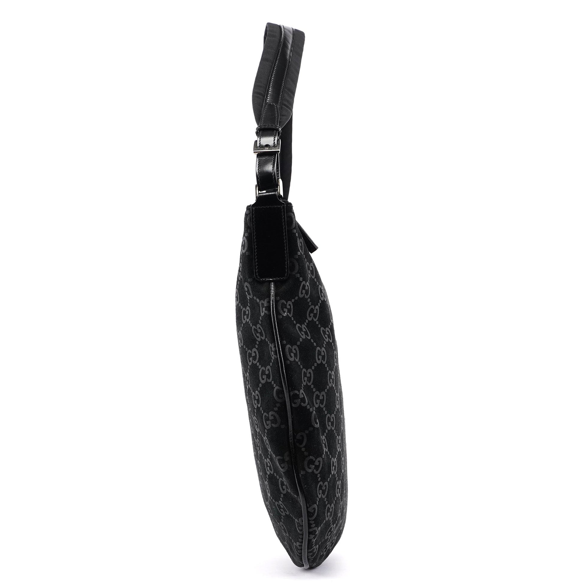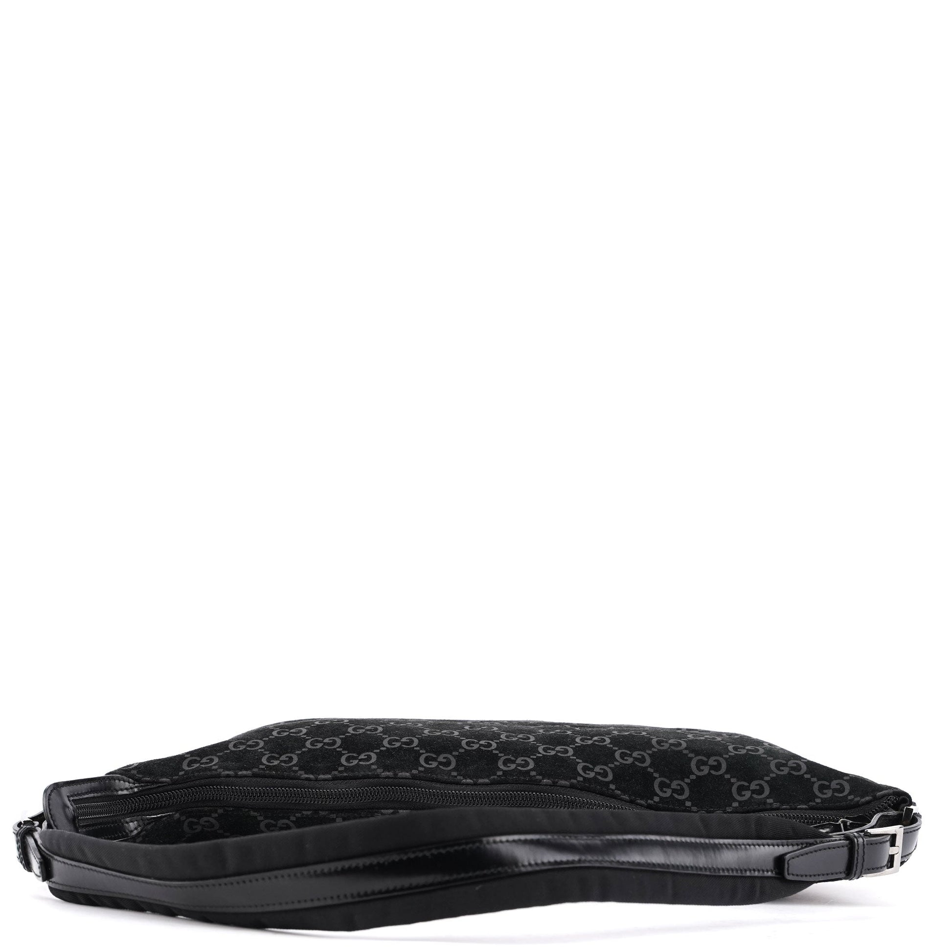 The Gucci GG Suede shoulder bag, designed by Tom Ford in 1997, is handcrafted from black GG monogram suede and accented with silver-tone hardware and black calfskin leather trim. It features a zipper closure that secures the cotton-lined interior, complete with an additional zipper pocket for organized storage.