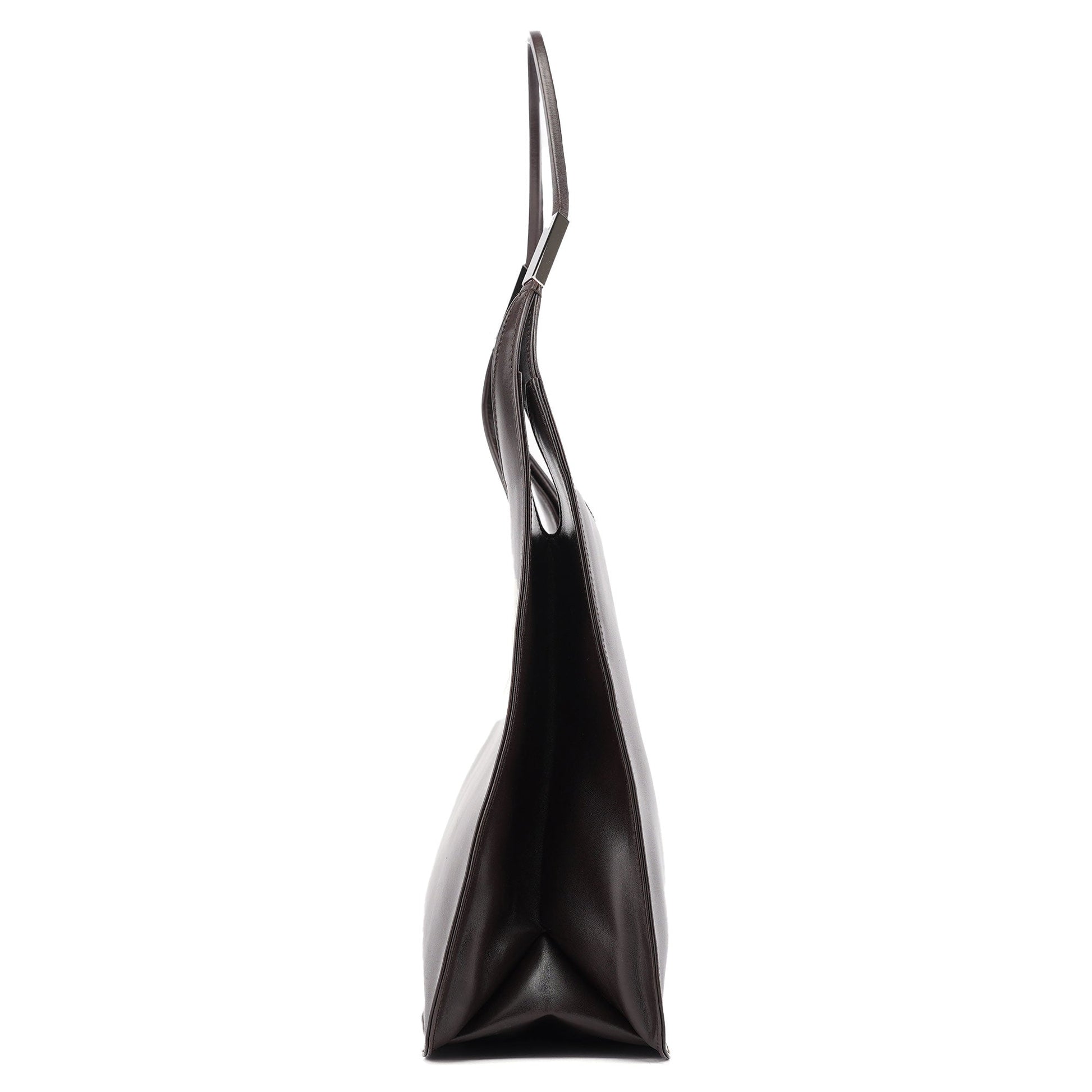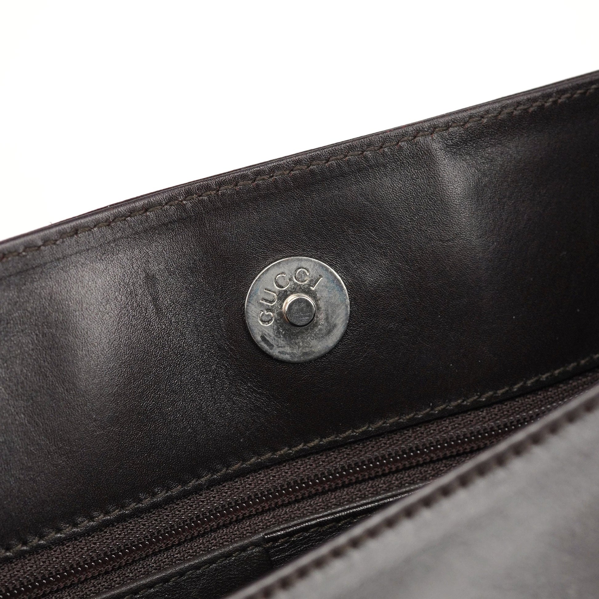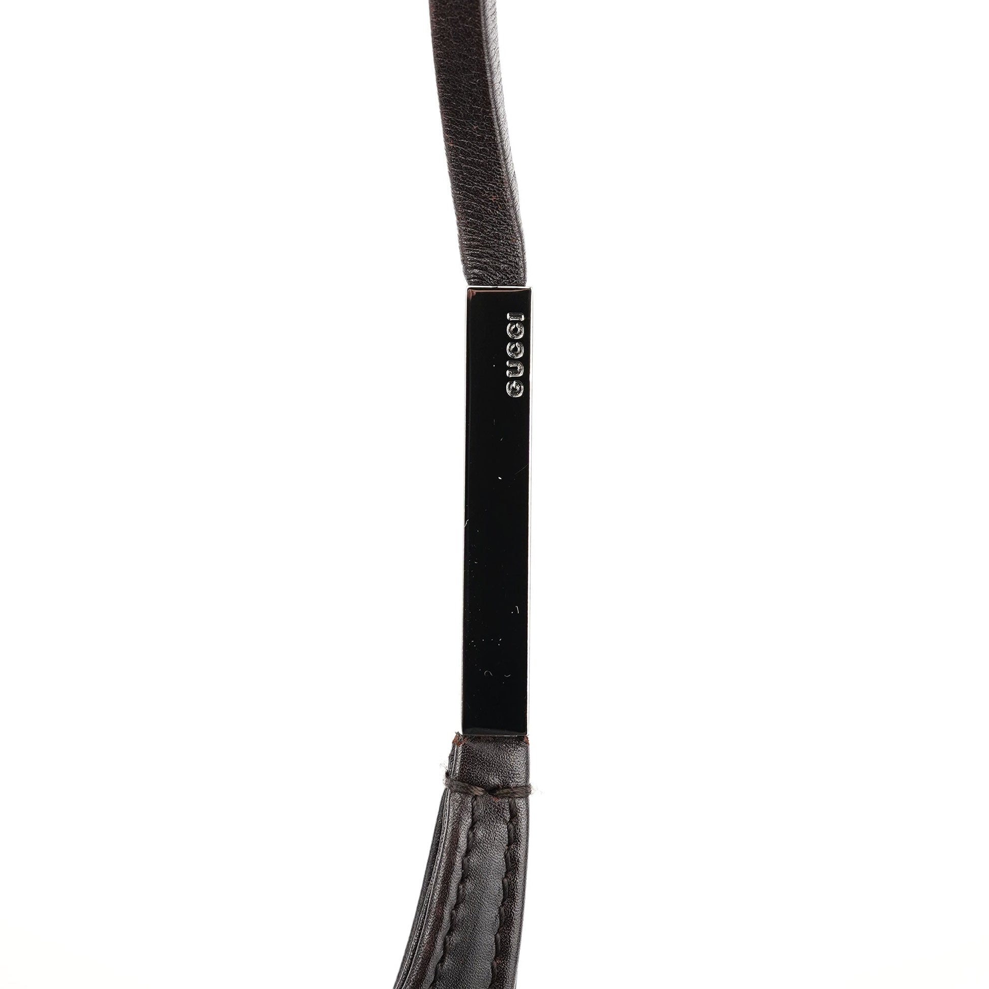 Designed by Tom Ford in the late 1990s, this Gucci shoulder bag is handcrafted from dark brown calfskin leather with silver-tone logo-engraved hardware. It features a magnetic closure, a calfskin-lined interior with a zip pocket, and a subtle embossed Gucci logo on the front for a refined finish.