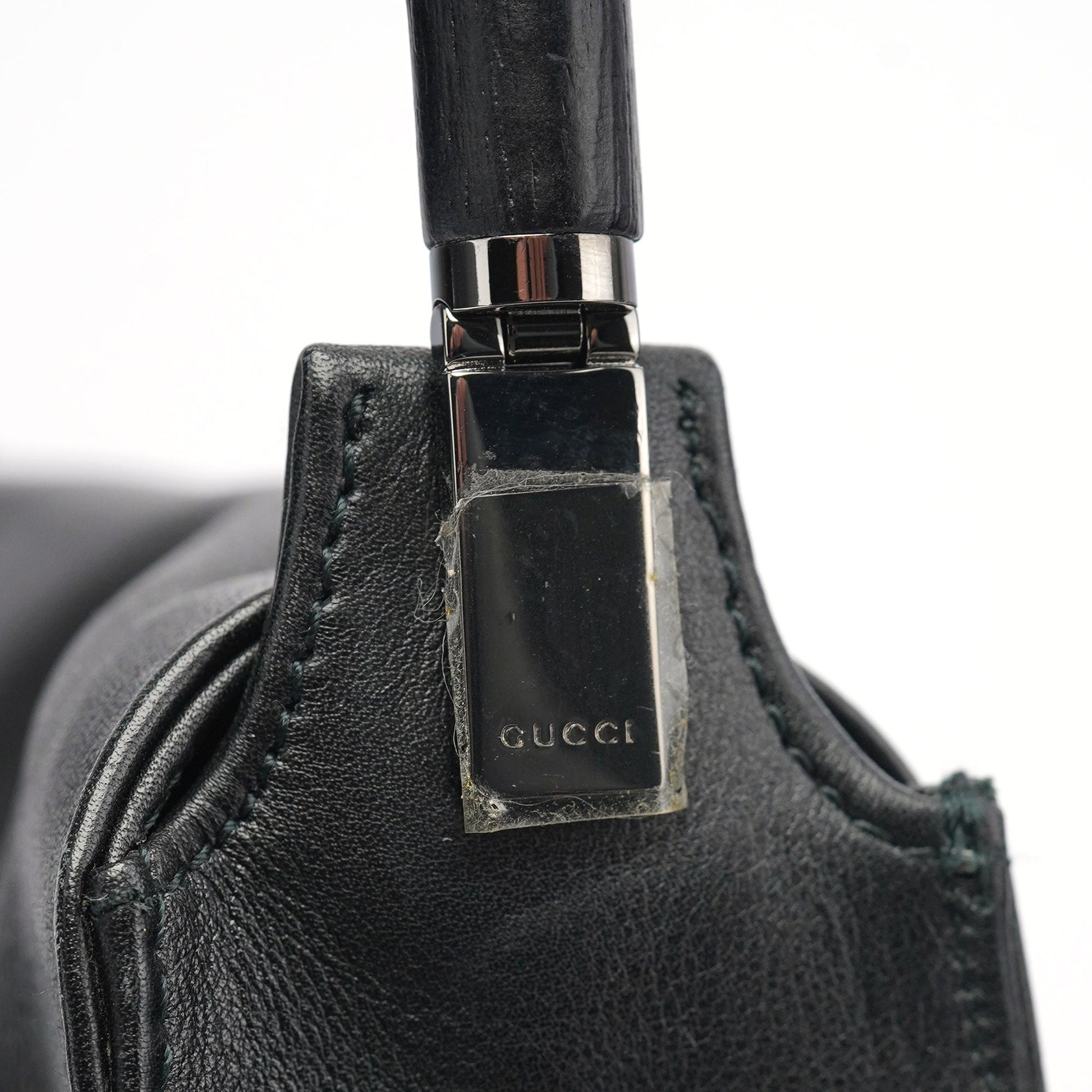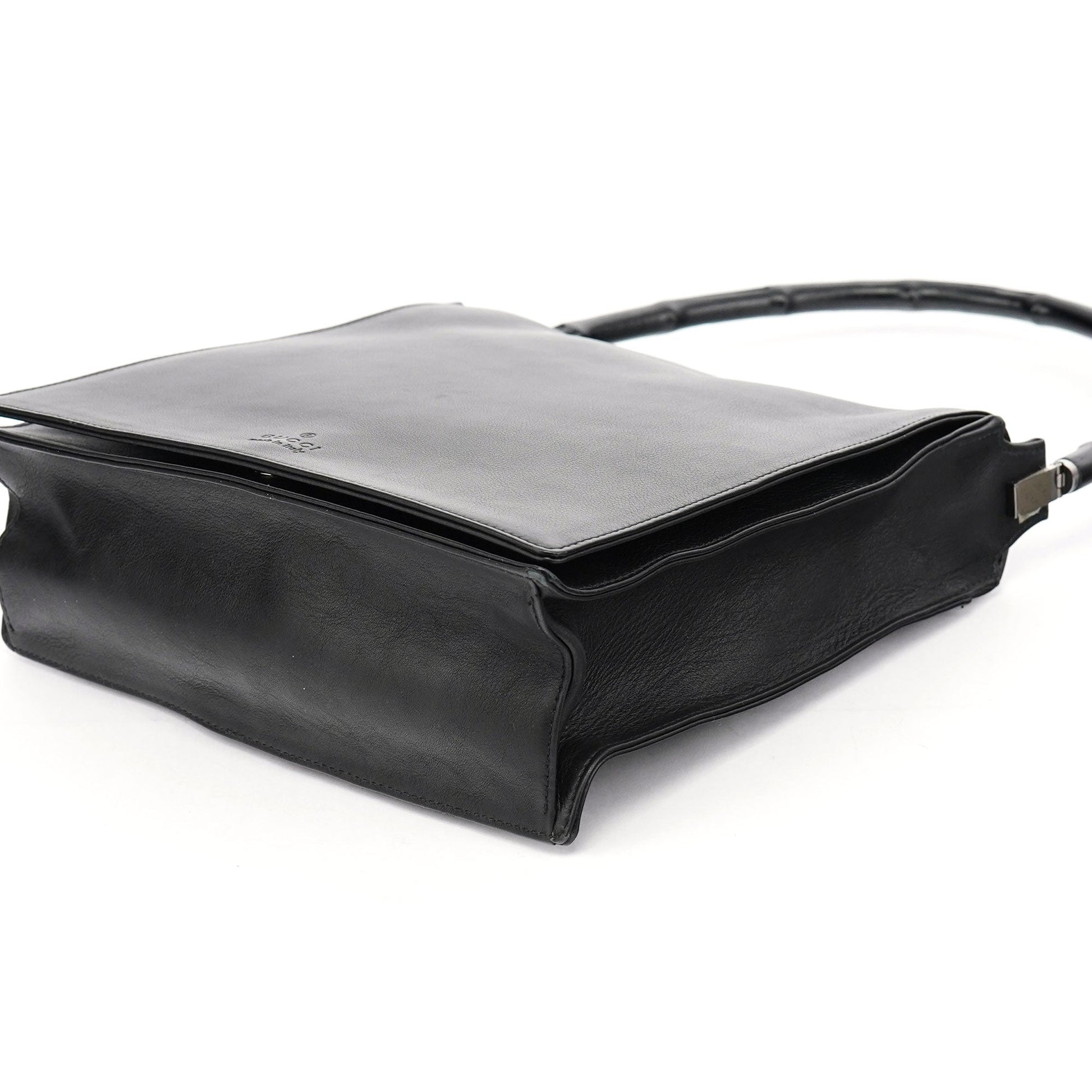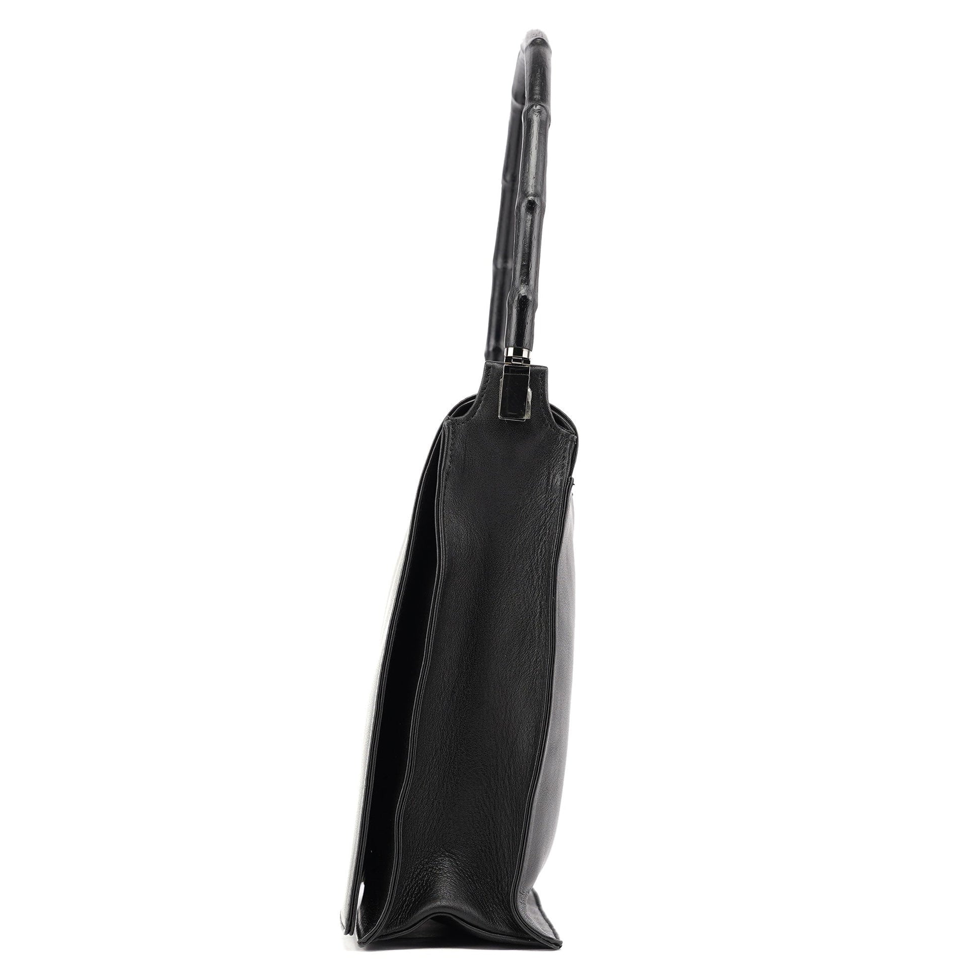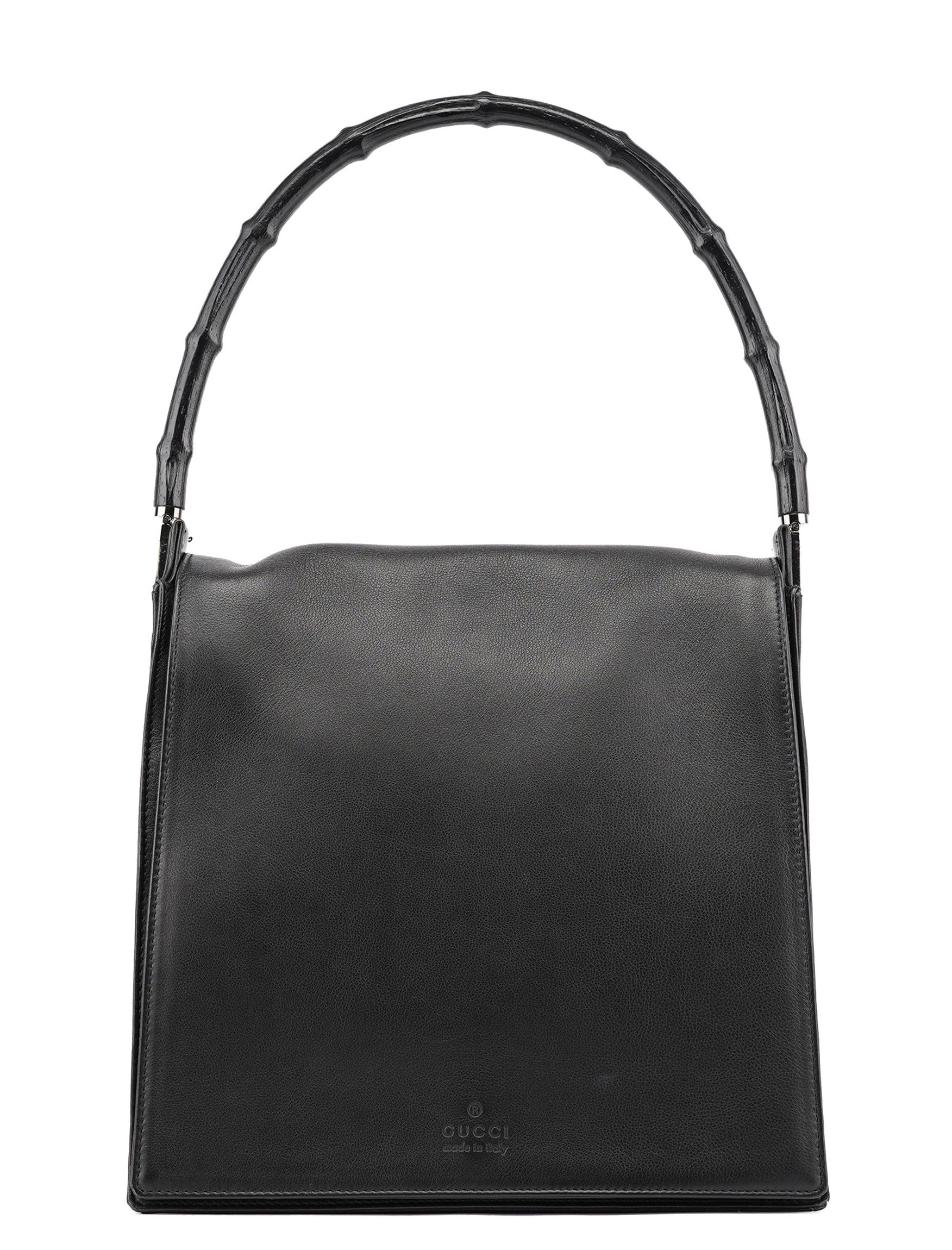 Designed by Tom Ford in the late 1990s, this Gucci Bamboo shoulder bag is crafted from black calfskin leather. Featuring a signature bamboo handle, silver-tone hardware with Gucci logo engraving, and a magnetic flap closure, it embodies timeless elegance. The satin-lined interior includes a zipper pocket, while the embossed Gucci logo on the front adds a refined finishing touch.