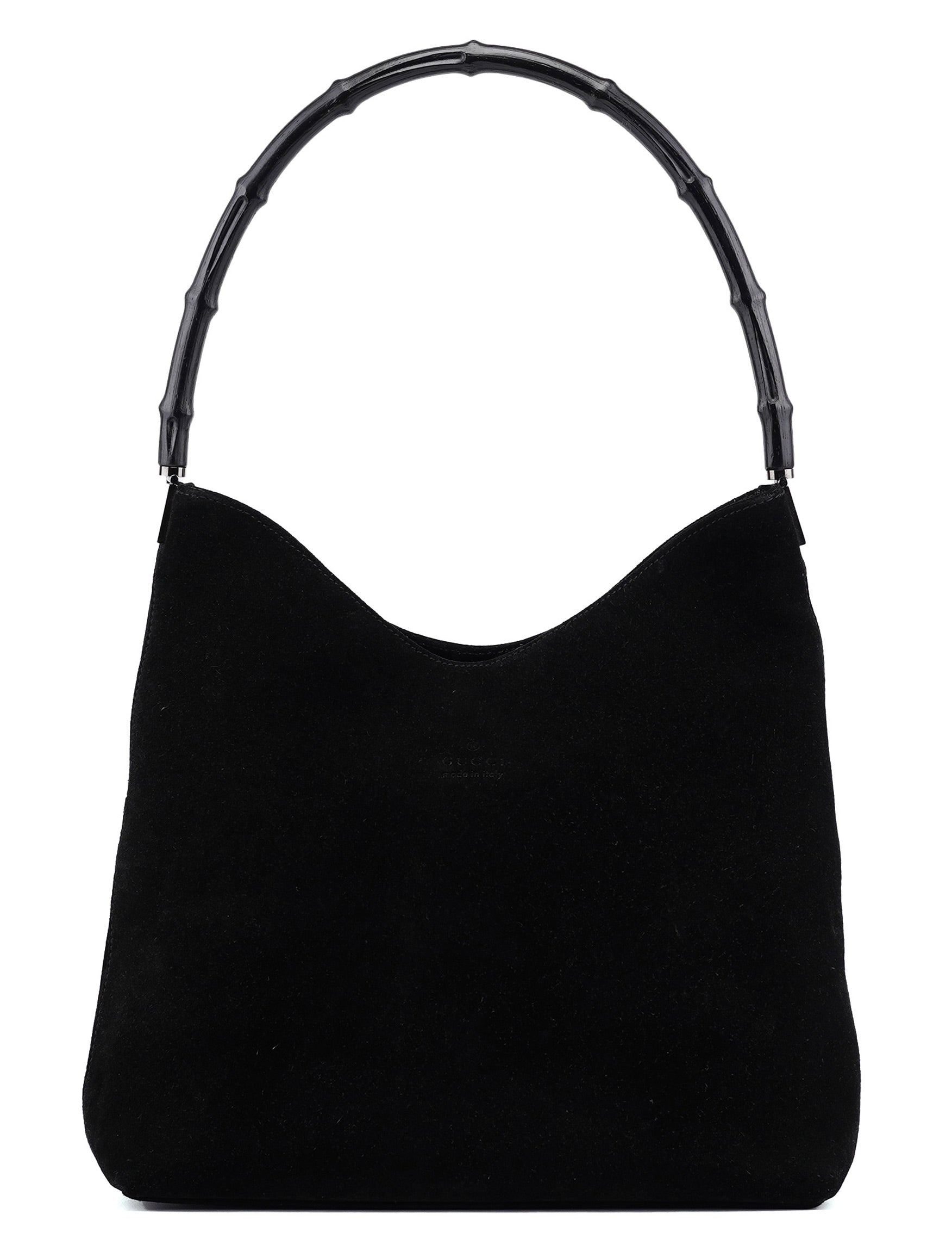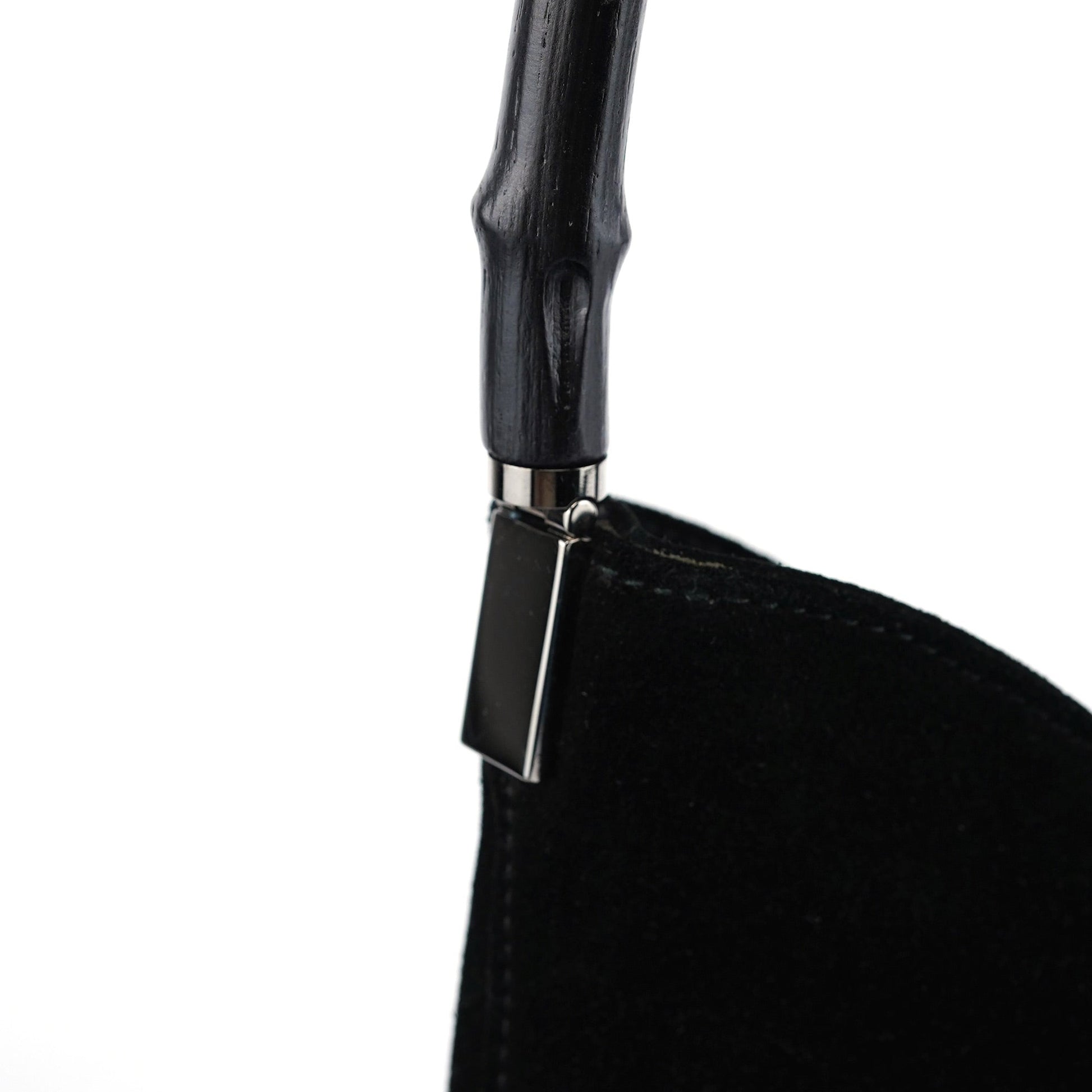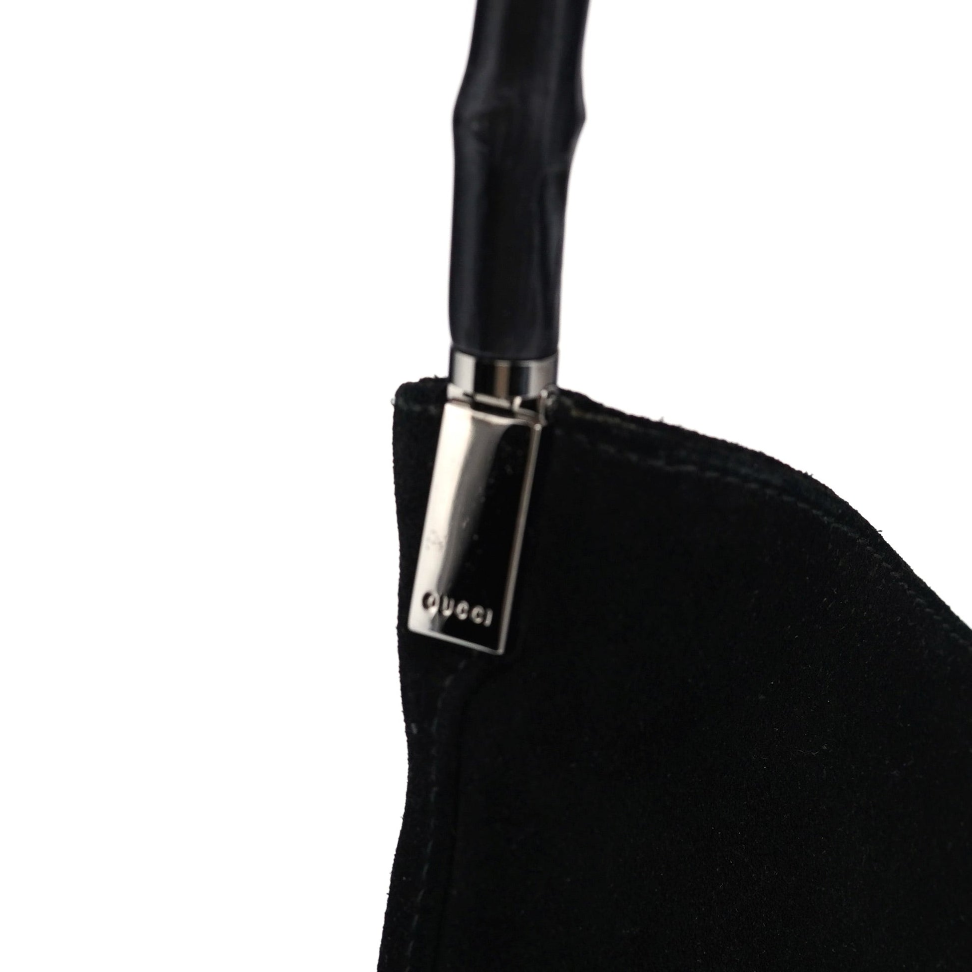 Designed by Tom Ford in the late 1990s, the Gucci Bamboo shoulder bag is handcrafted in black suede with silver-tone hardware engraved with the Gucci logo. Featuring the iconic bamboo handle, a satin-lined interior, and an embossed Gucci logo at the front, this piece embodies timeless elegance and sophisticated craftsmanship.