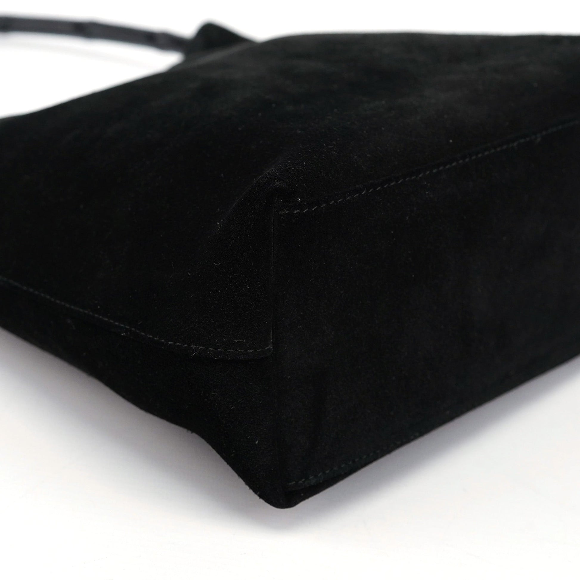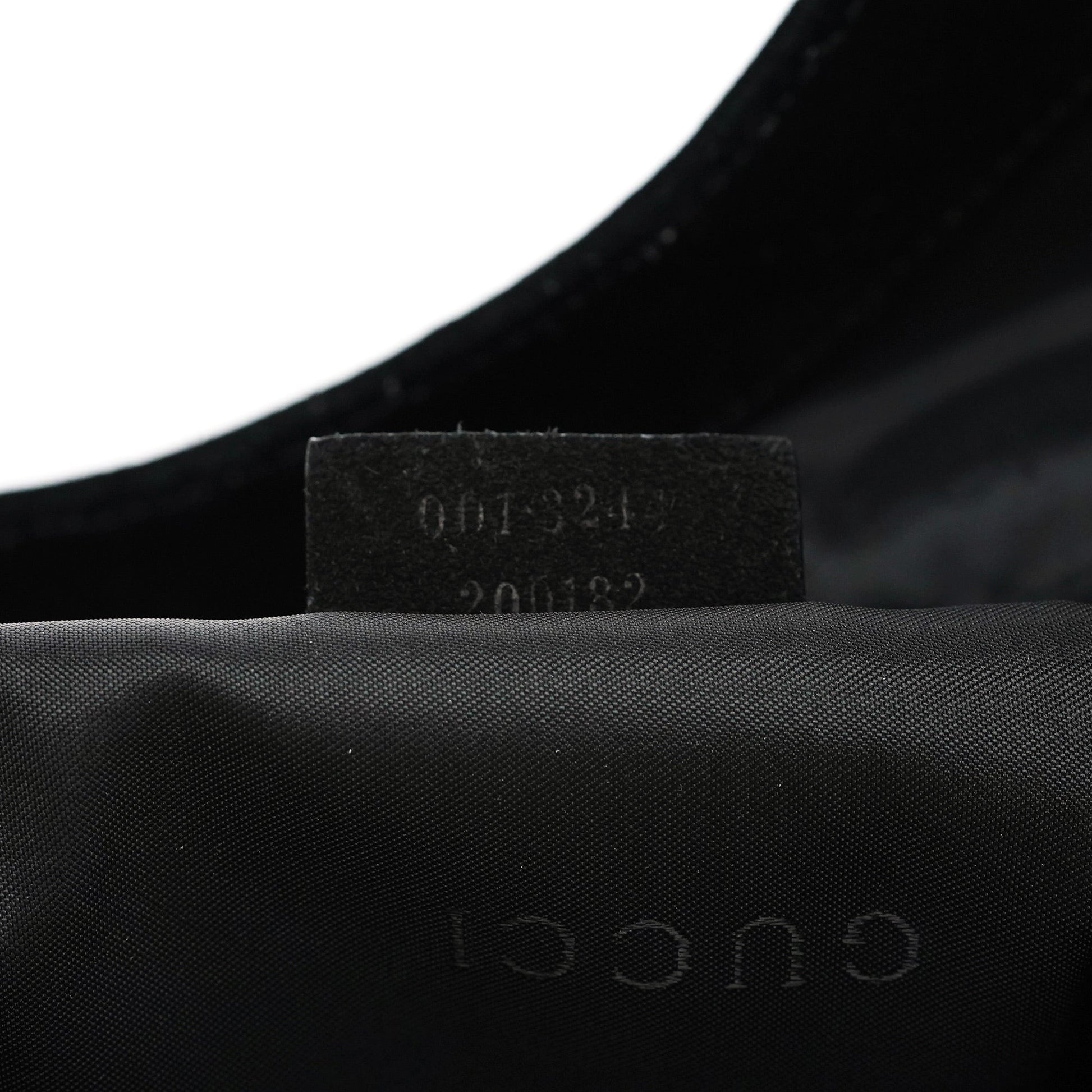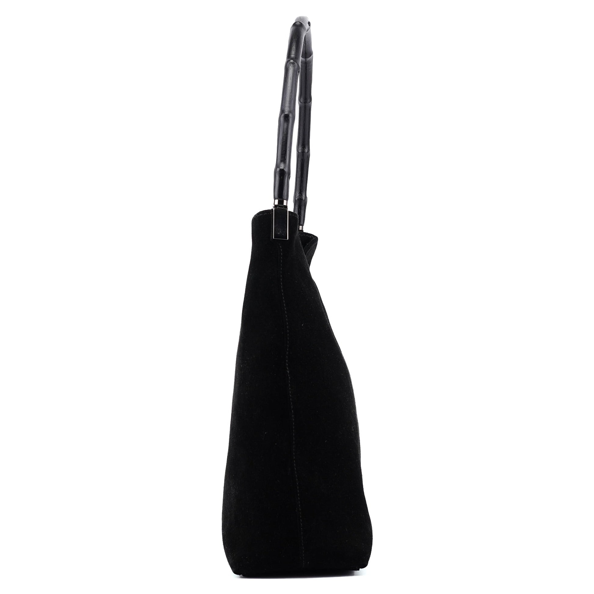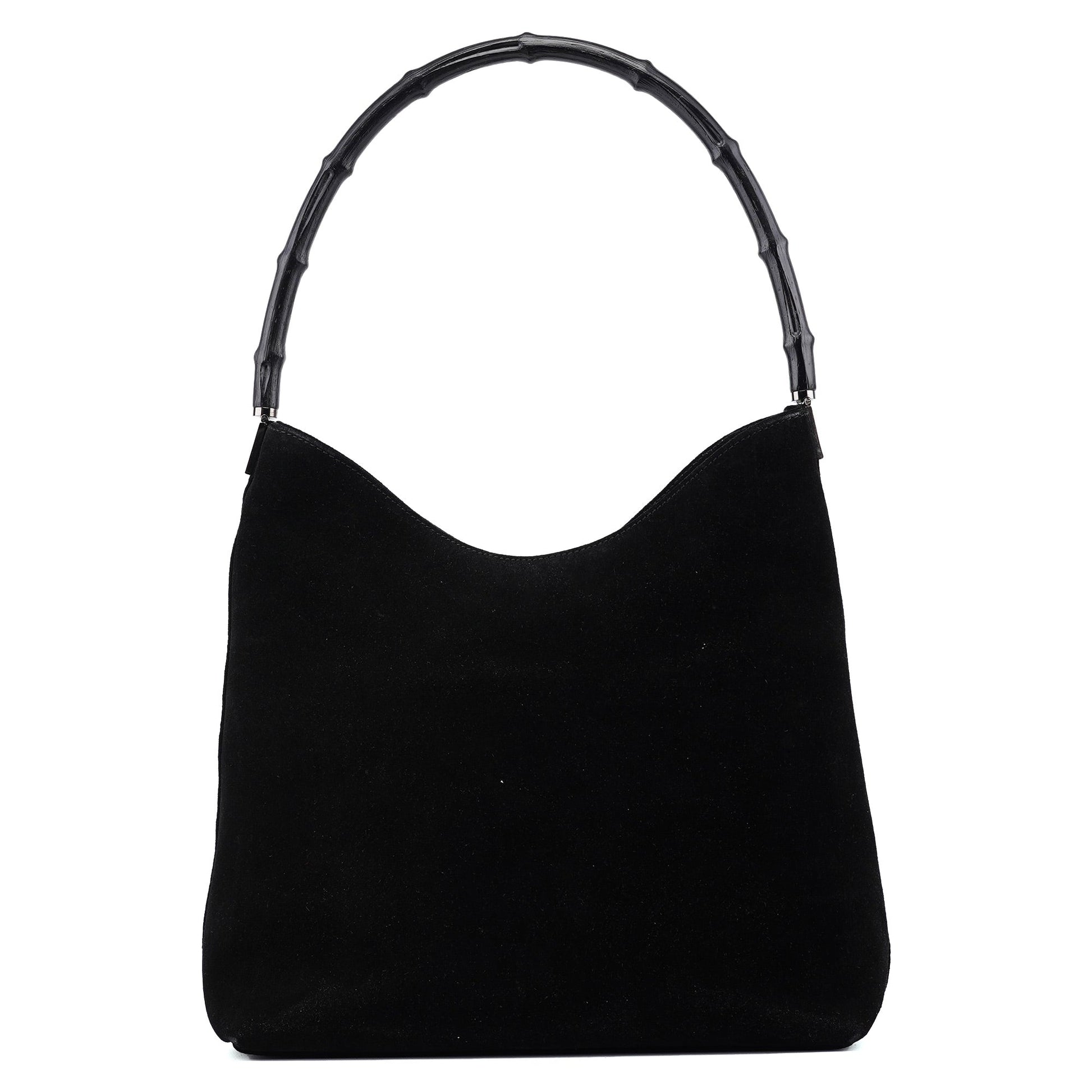 Designed by Tom Ford in the late 1990s, the Gucci Bamboo shoulder bag is handcrafted in black suede with silver-tone hardware engraved with the Gucci logo. Featuring the iconic bamboo handle, a satin-lined interior, and an embossed Gucci logo at the front, this piece embodies timeless elegance and sophisticated craftsmanship.