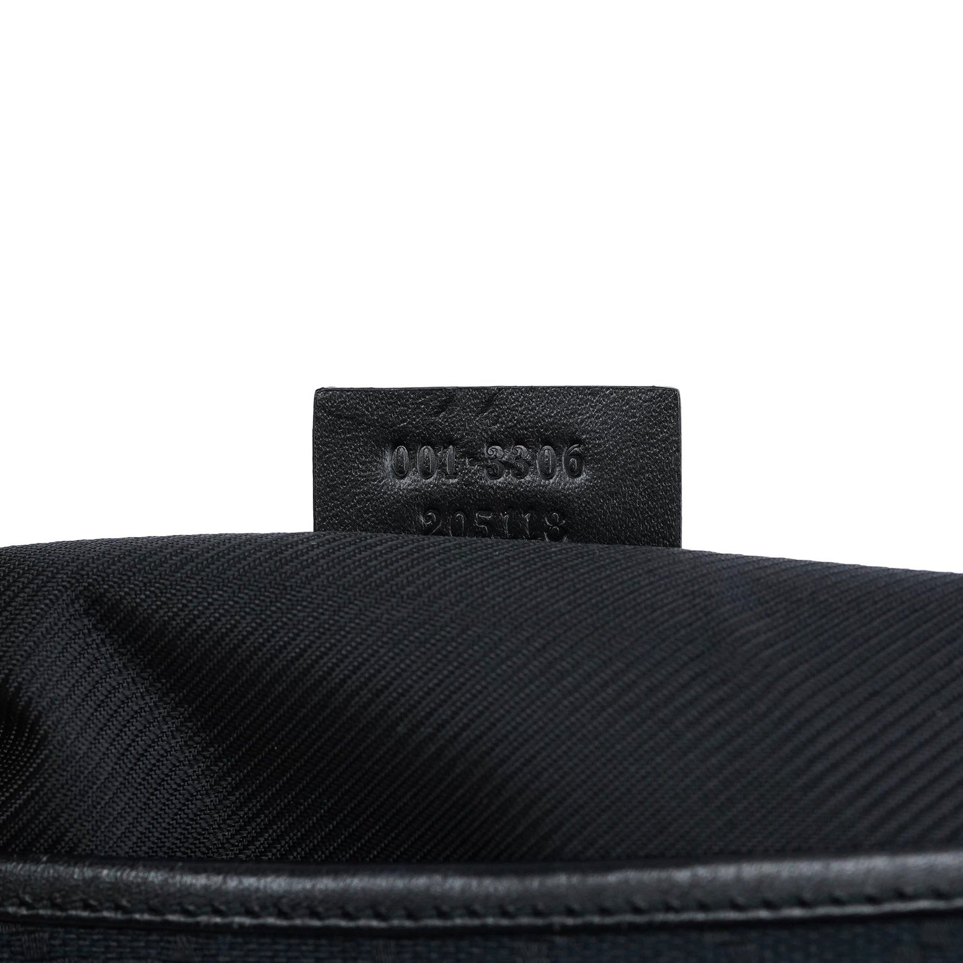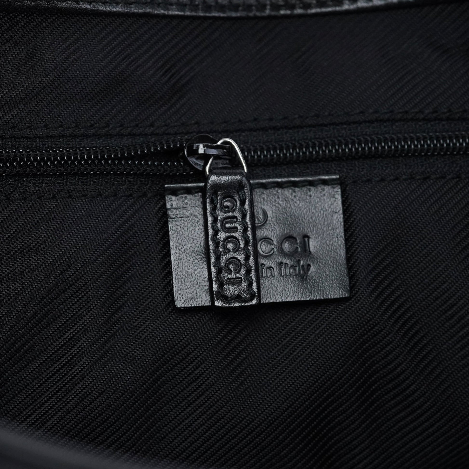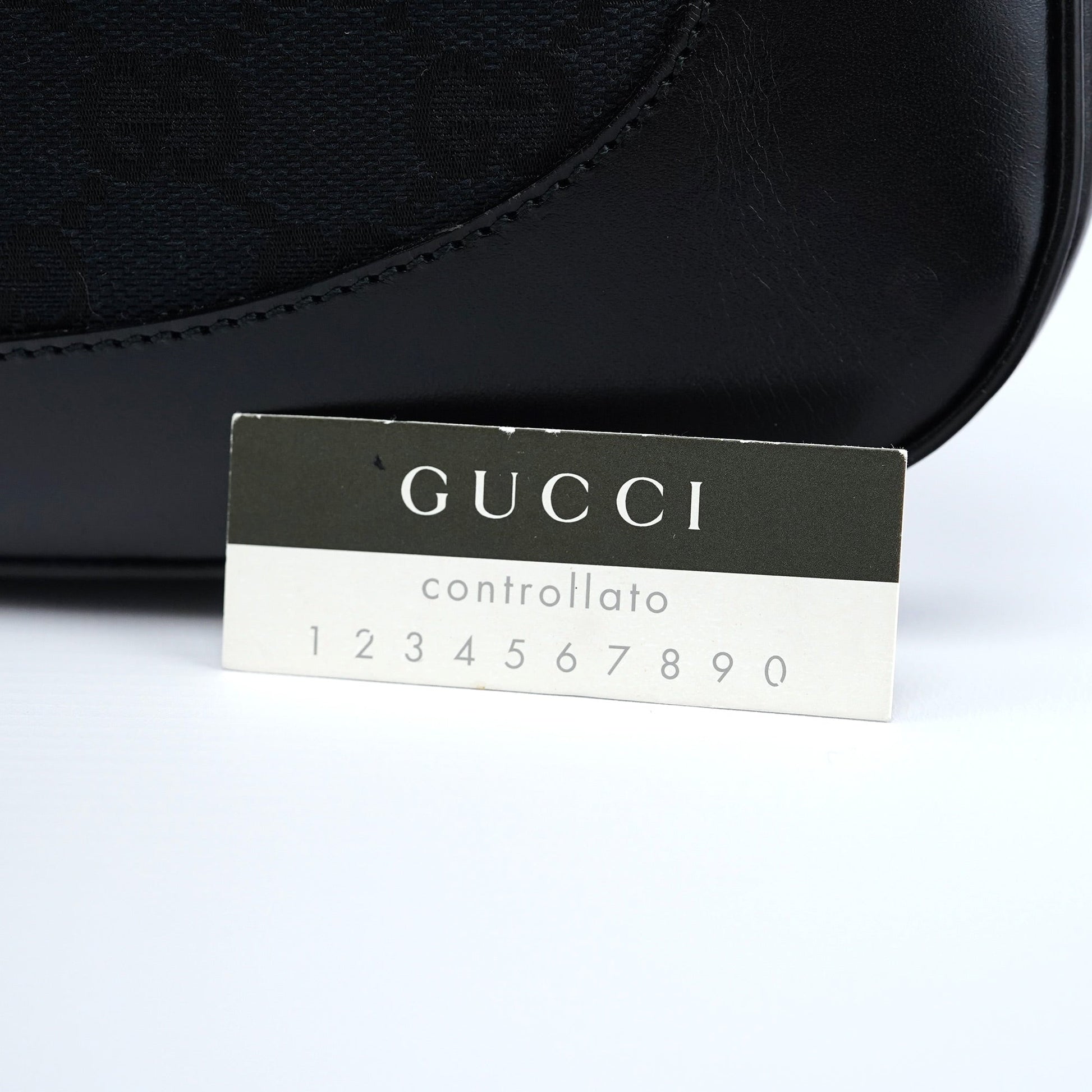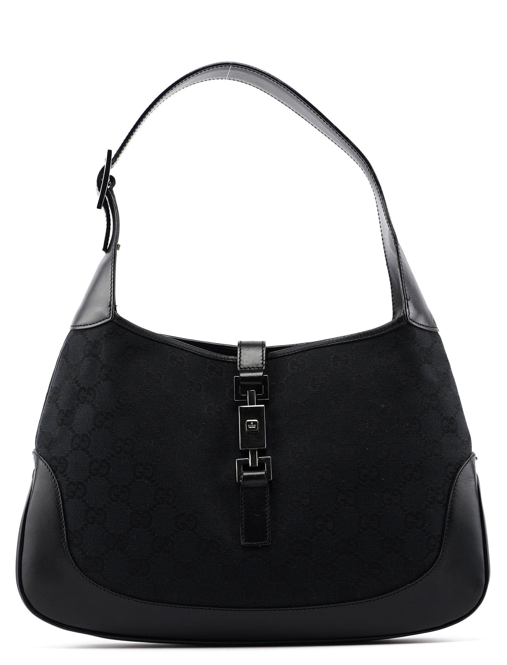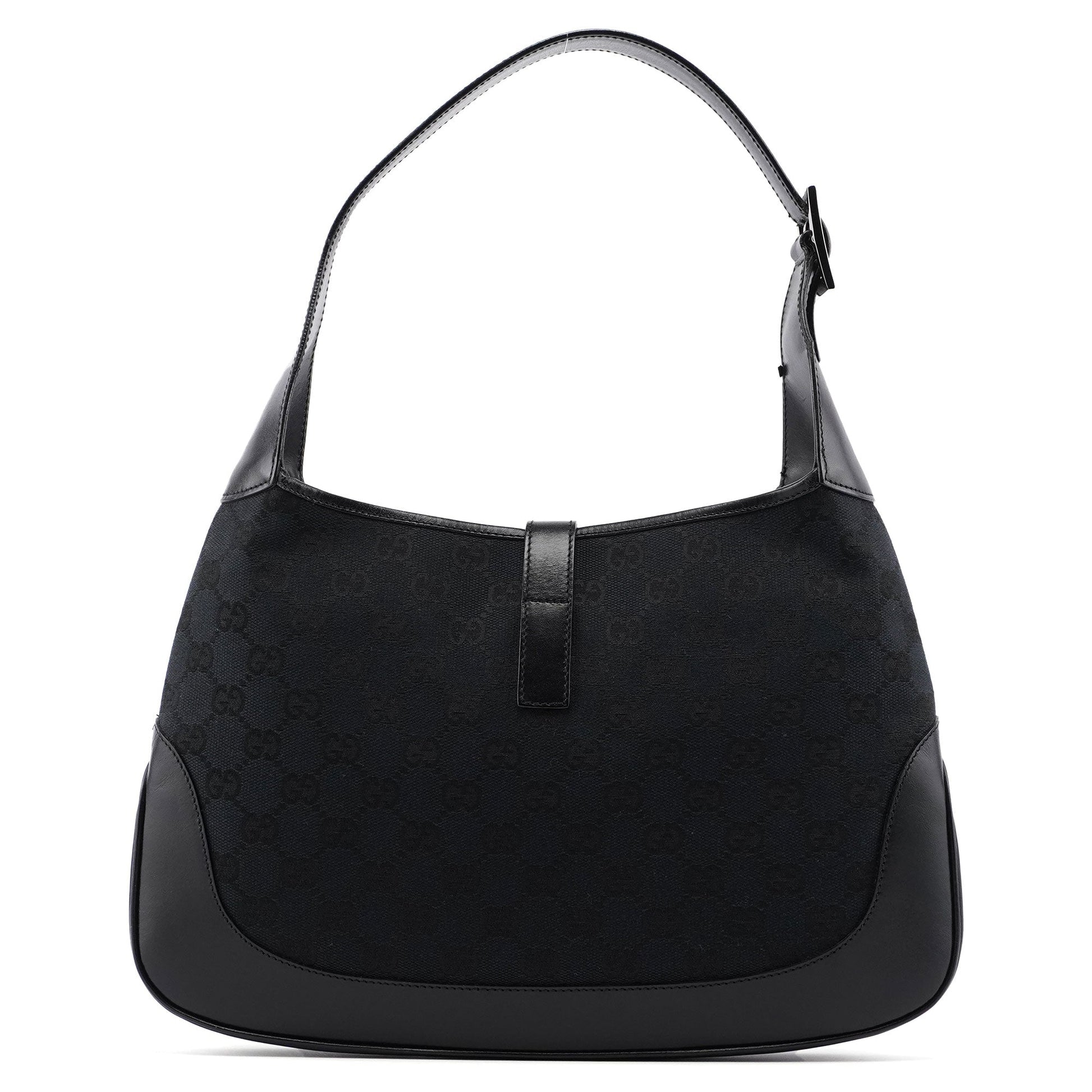The iconic Gucci Jackie bag, designed by Tom Ford in the late 1990s and now being re-editioned, is crafted from black GG monogram canvas and tonal calfskin leather, with silver-tone hardware engraved with the Gucci logo. It features the signature Jackie clasp closure, while the satin-lined interior includes a practical zipper pocket.