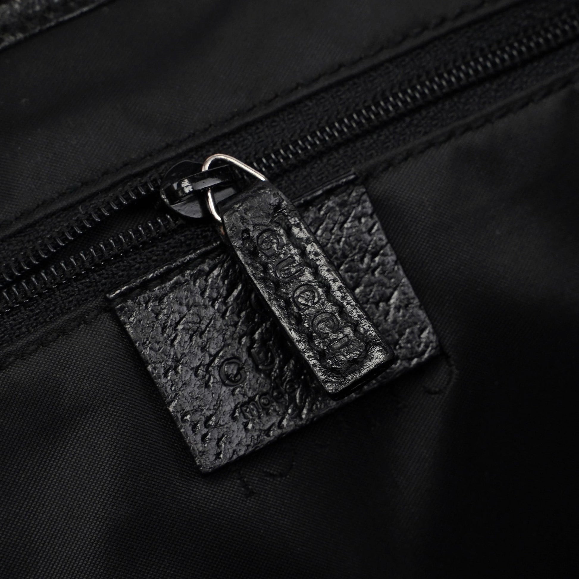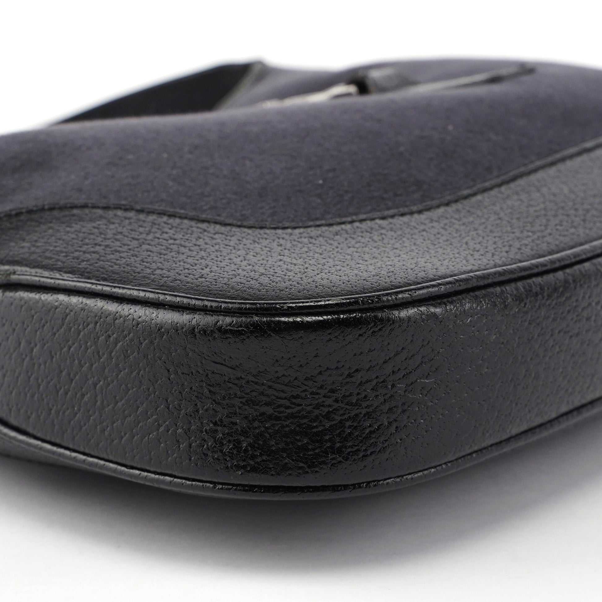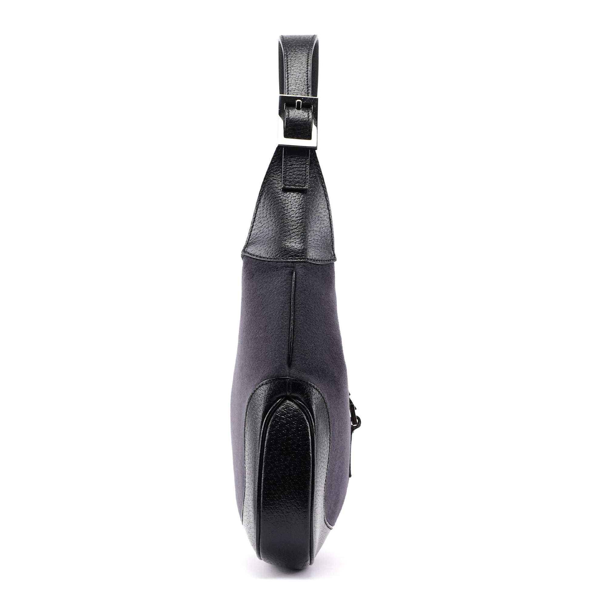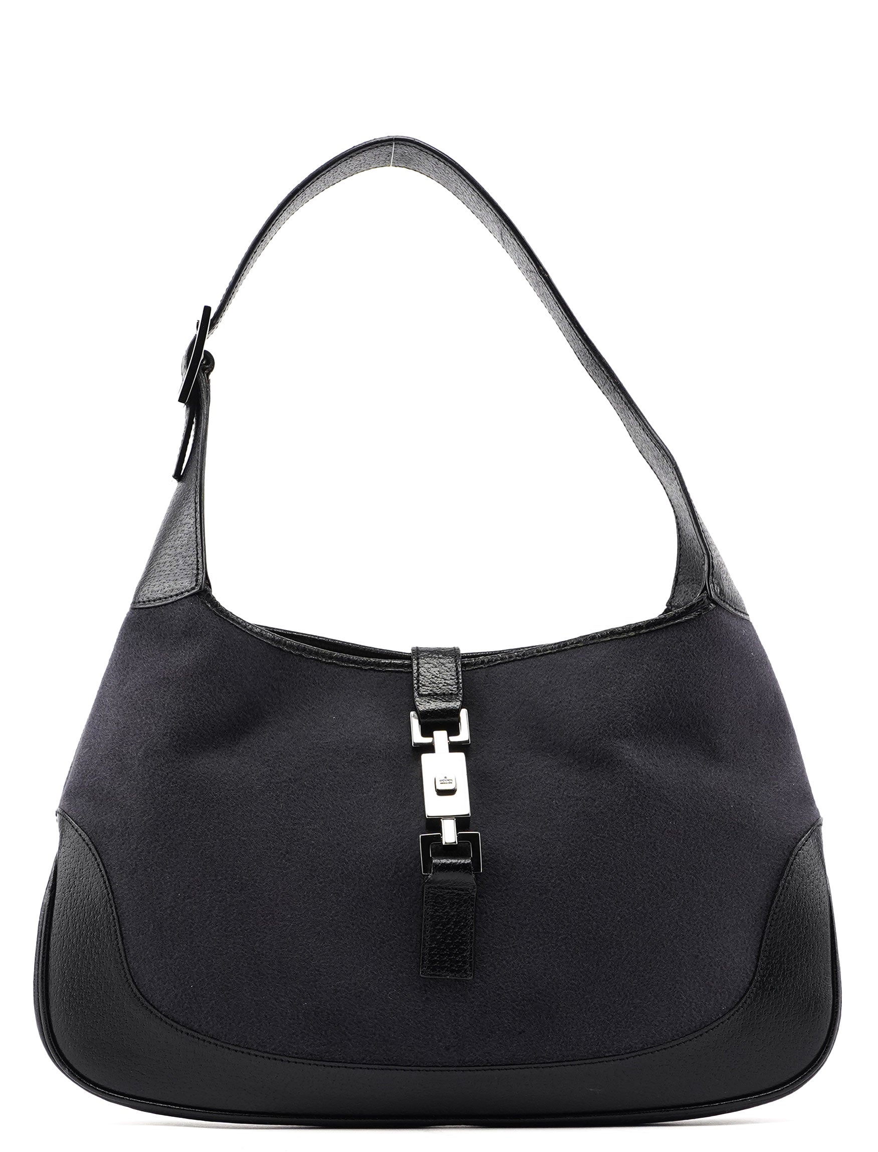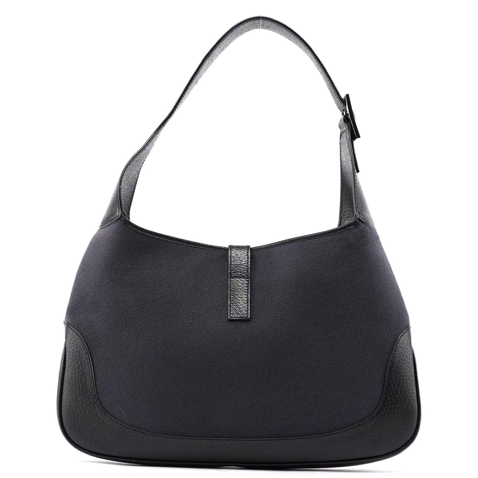 The iconic Gucci Jackie bag, designed by Tom Ford in the late 1990s and now being re-editioned, is crafted from black calfskin leather and anthracite wool, with silver-tone hardware engraved with the Gucci logo. It features the signature Jackie clasp closure, while the satin-lined interior includes a practical zipper pocket.