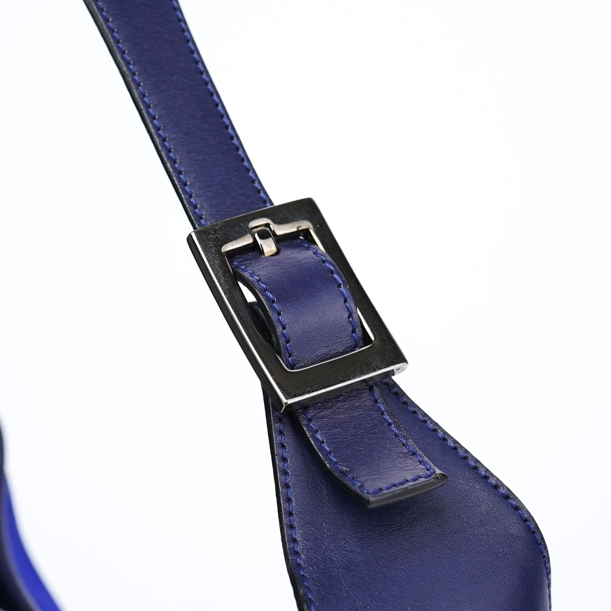 Designed in the early 2000s by Tom Ford, this Gucci Jackie shoulder bag is crafted from cobalt blue nylon with smooth navy calfskin leather trim. The iconic piston lock in silver-tone hardware secures the flap, while the structured belt-style shoulder strap adds a bold finish. A satin-lined interior with a zip pocket completes the sleek, archival silhouette.