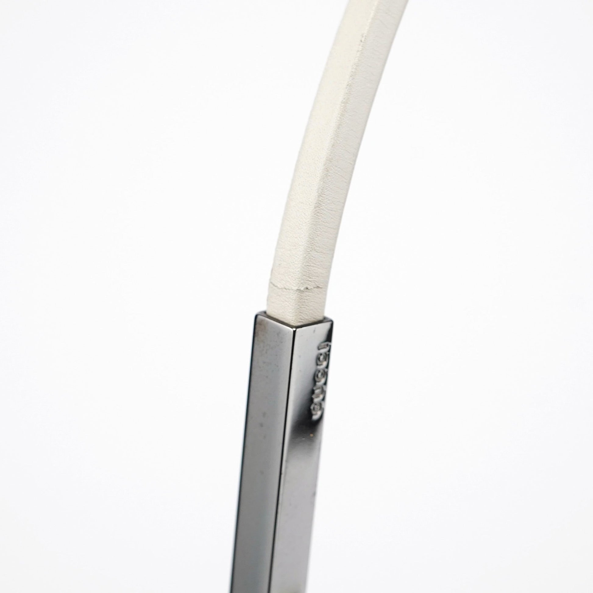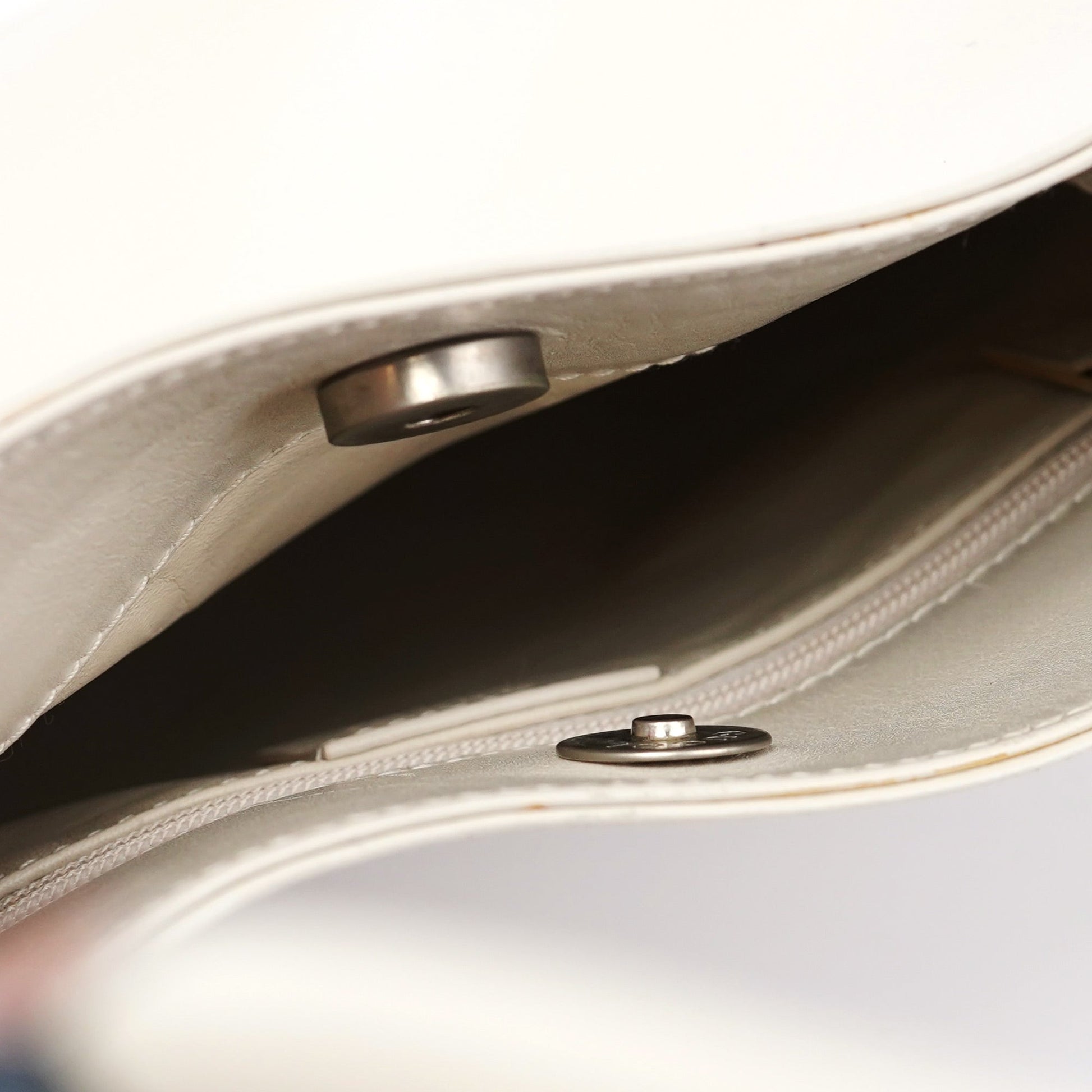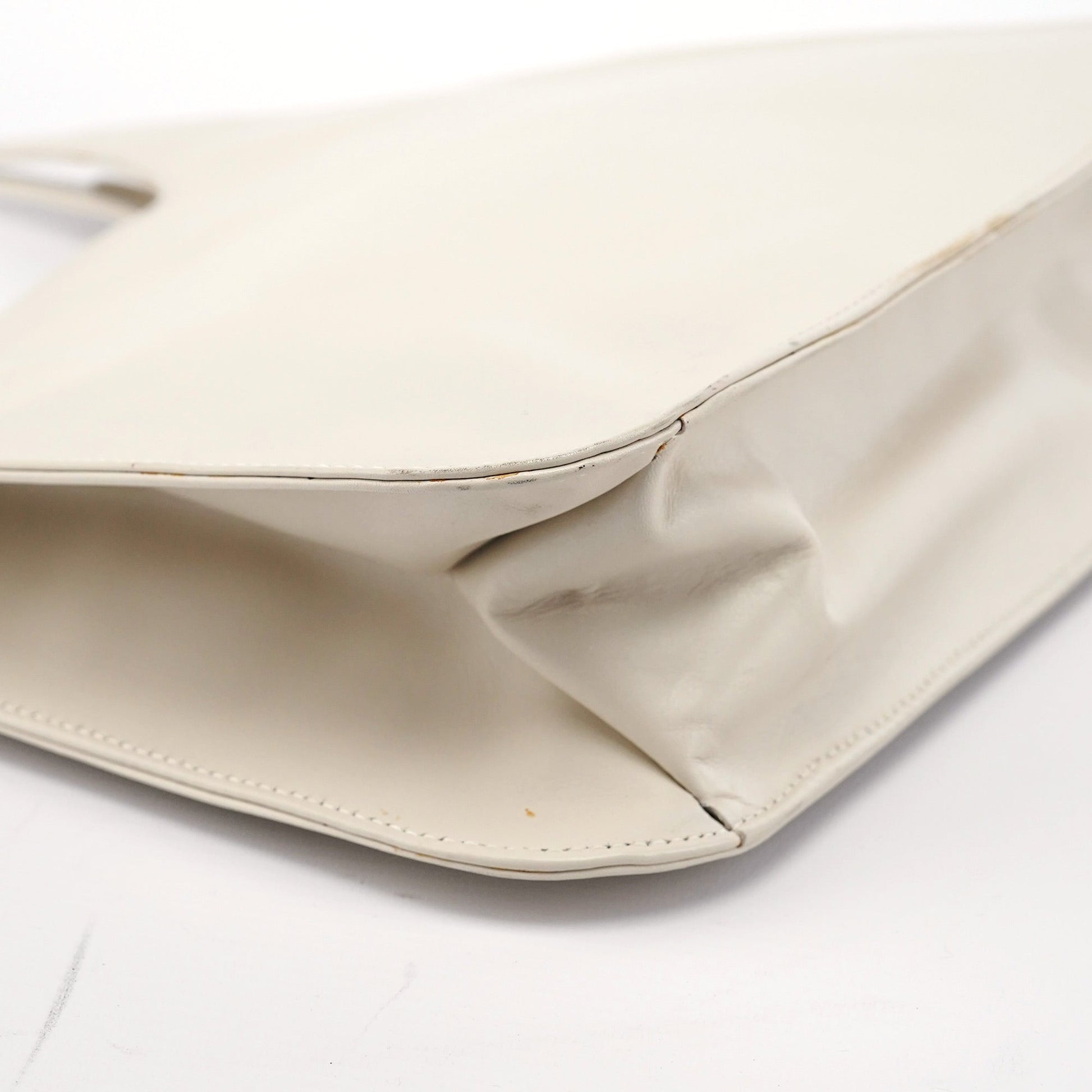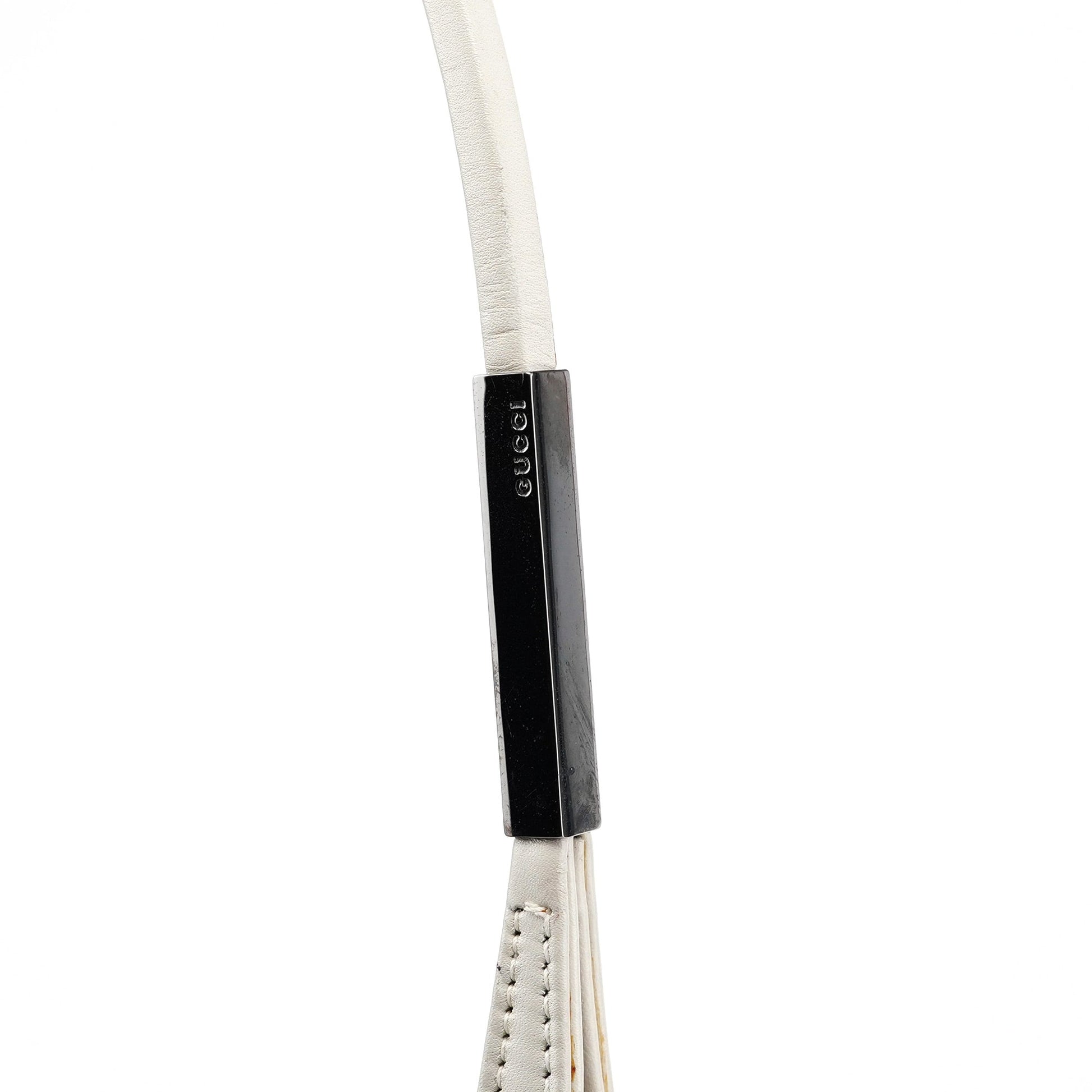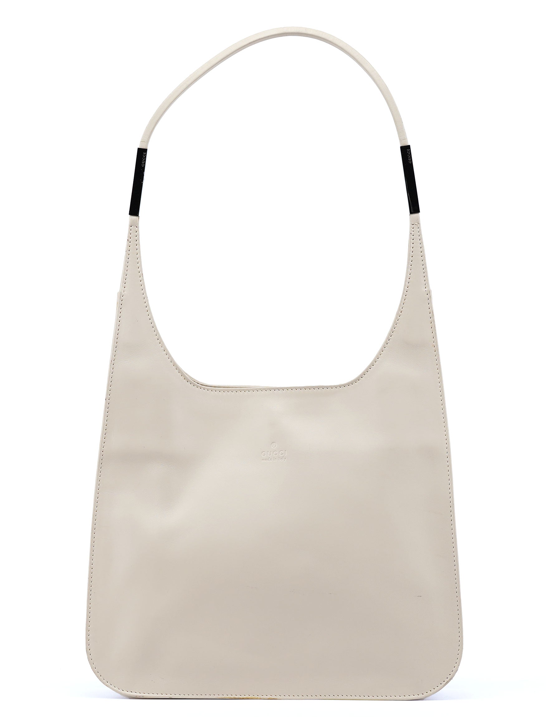Designed by Tom Ford in the late 1990's, this Gucci Vitello shoulder bag exudes elegance. Handcrafted in off-white calfskin leather, it boasts silver-tone hardware engraved with the Gucci logo. The magnetic closure opens to a calfskin-lined interior featuring a zipper pocket. The Gucci logo is subtly embossed on the front.