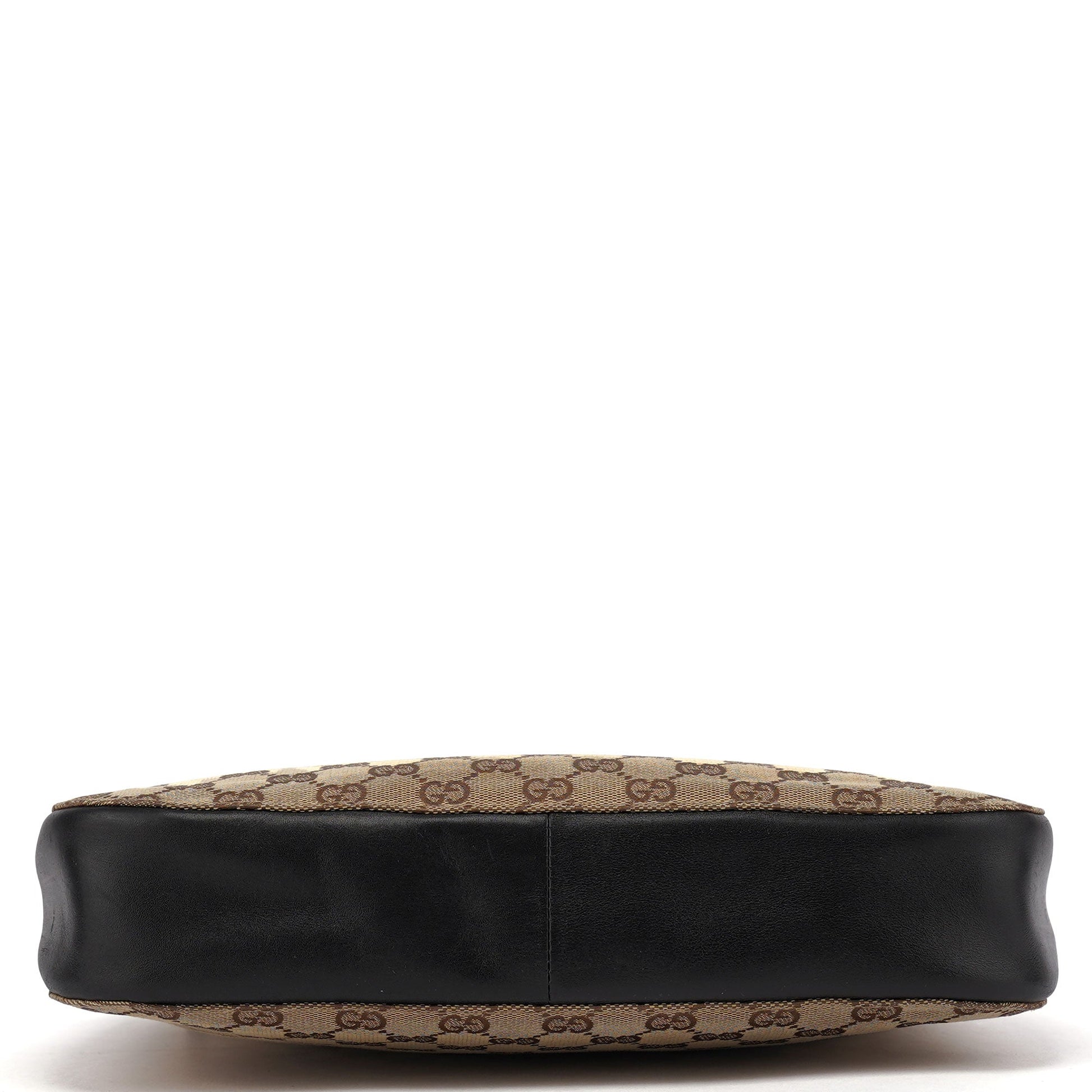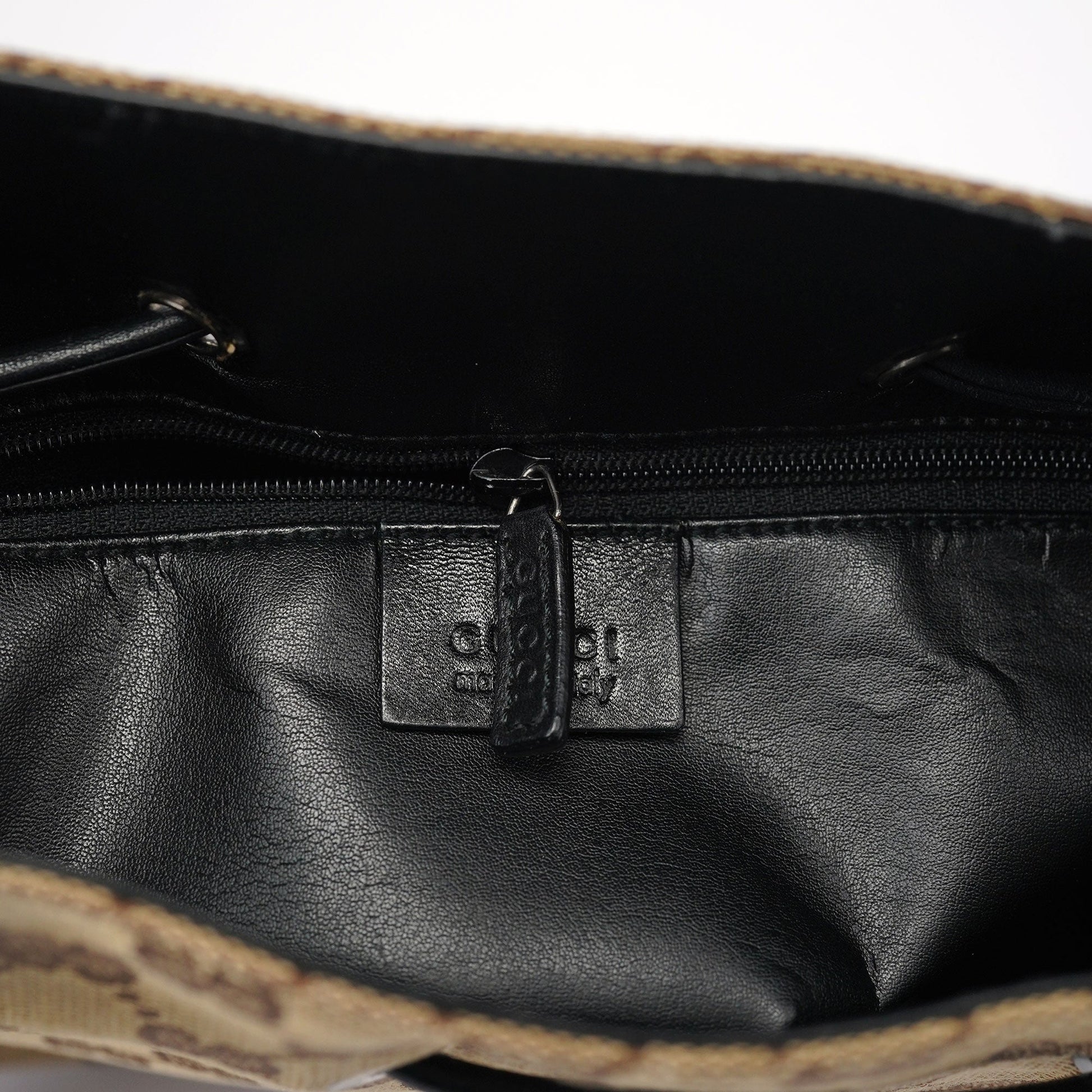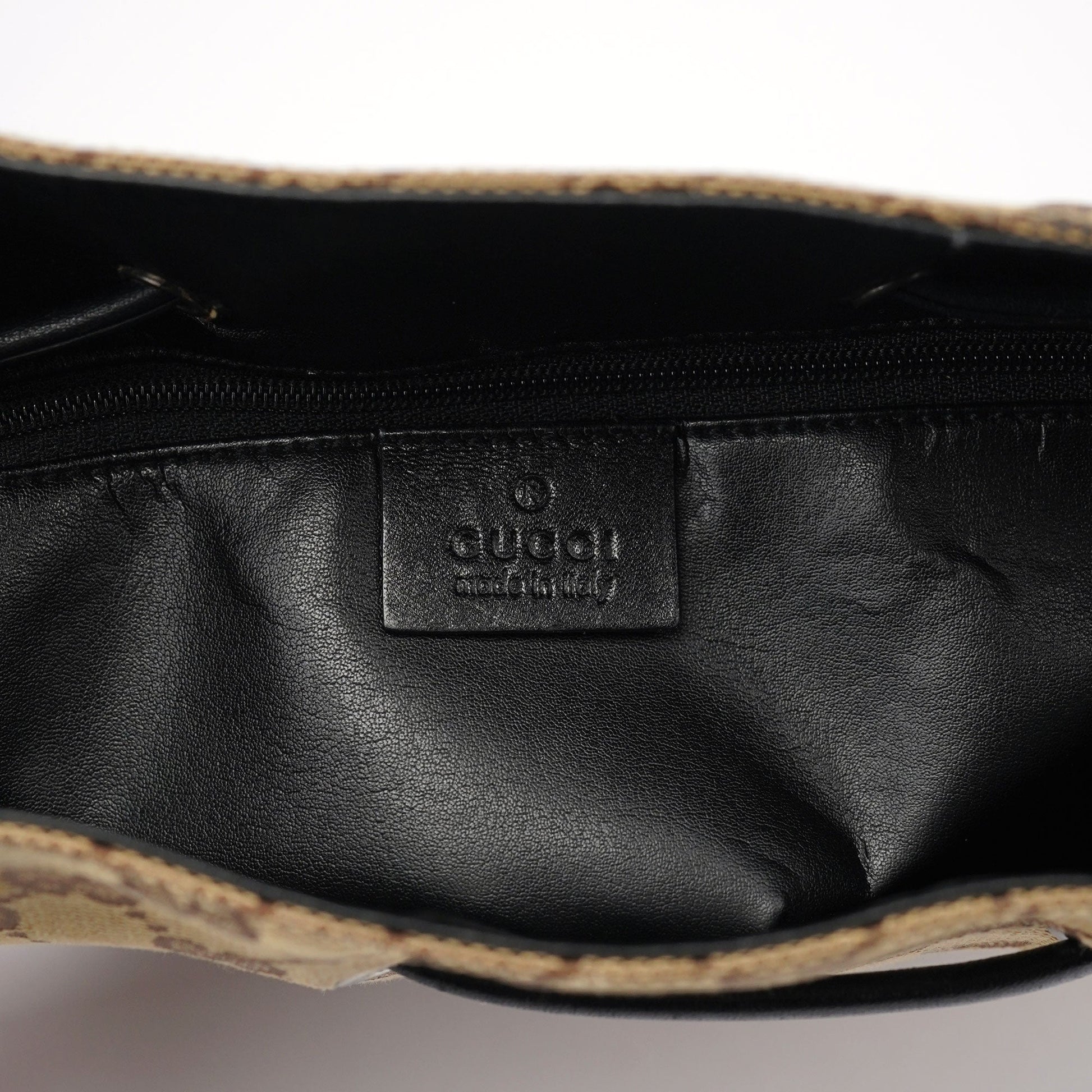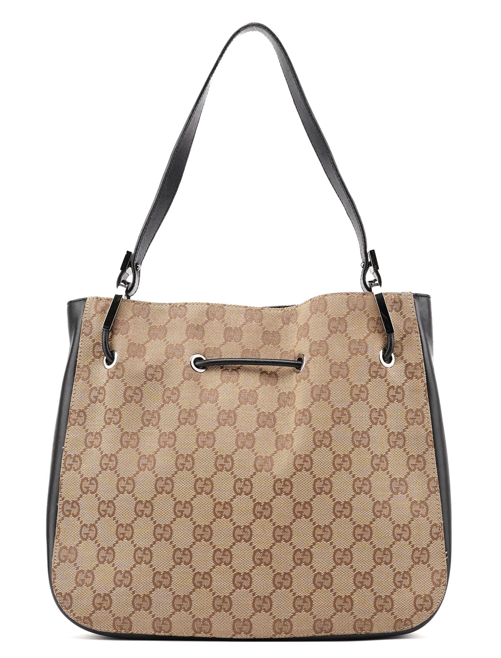 Designed by Tom Ford in the late 1990s, this Gucci GG shoulder bag is handcrafted from beige GG monogram canvas with black calfskin leather trim. Silver-tone hardware engraved with the Gucci logo accents the drawstring-style closure, offering easy access. The interior is lined in smooth black calfskin and features a zip pocket for added functionality.