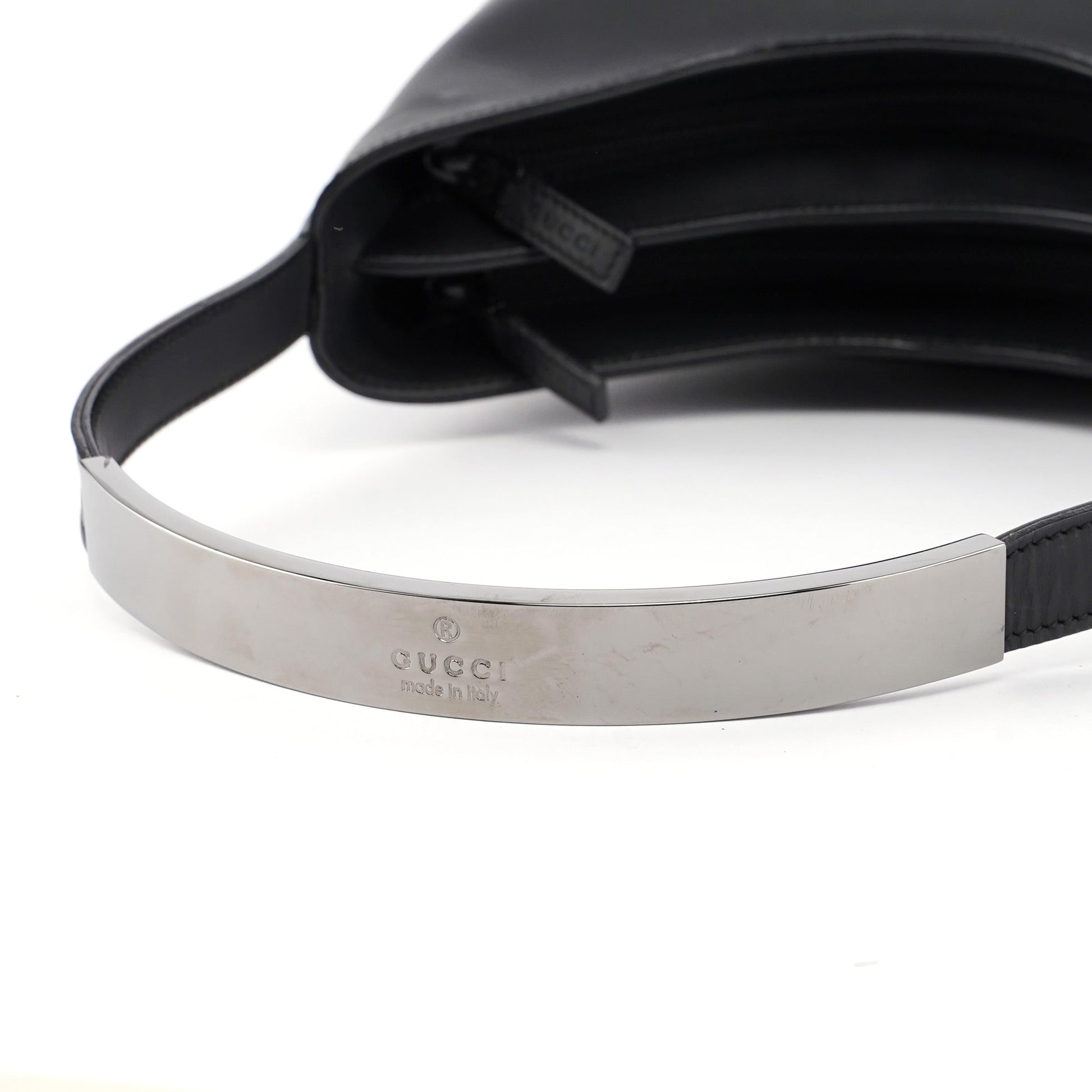Introducing the vintage Gucci hobo shoulder bag designed by Tom Ford from the late 1990s. Crafted from matte black leather, it boasts silver tone hardware engraved with the Gucci logo. Inside, you'll find two compartments with zipper closures, lined in luxurious satin and featuring a handy interior pocket. The iconic Gucci logo is elegantly embossed at the front.