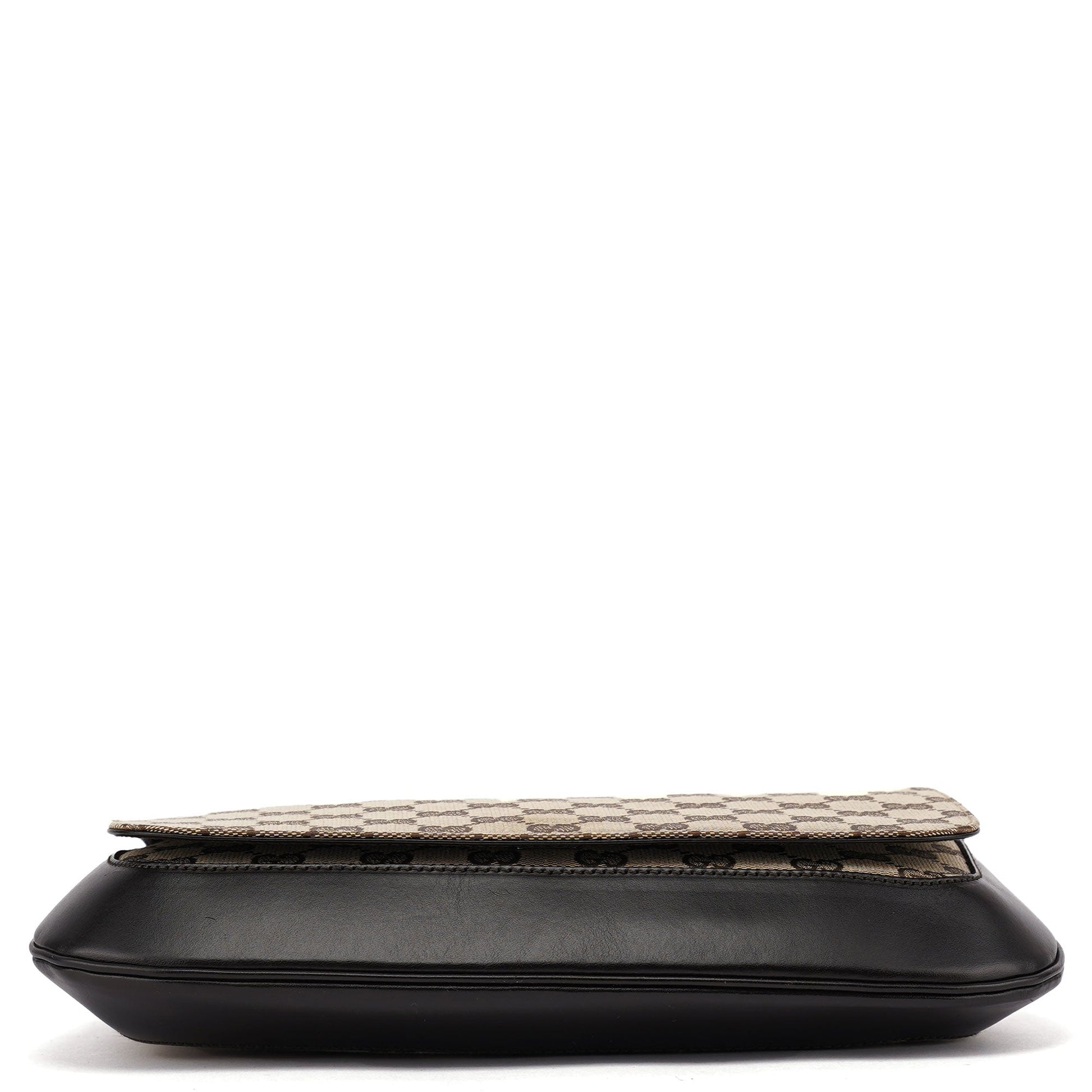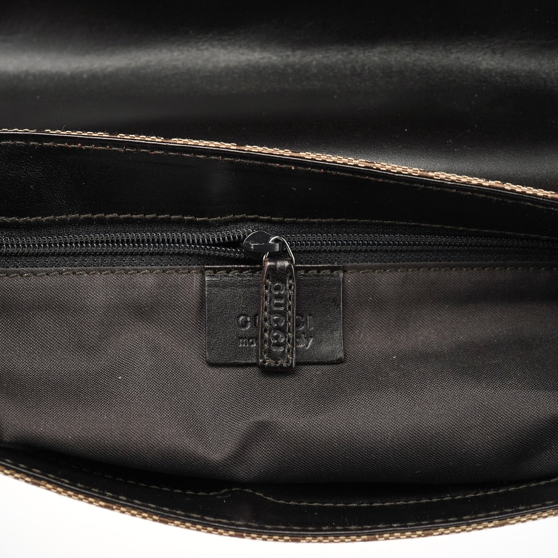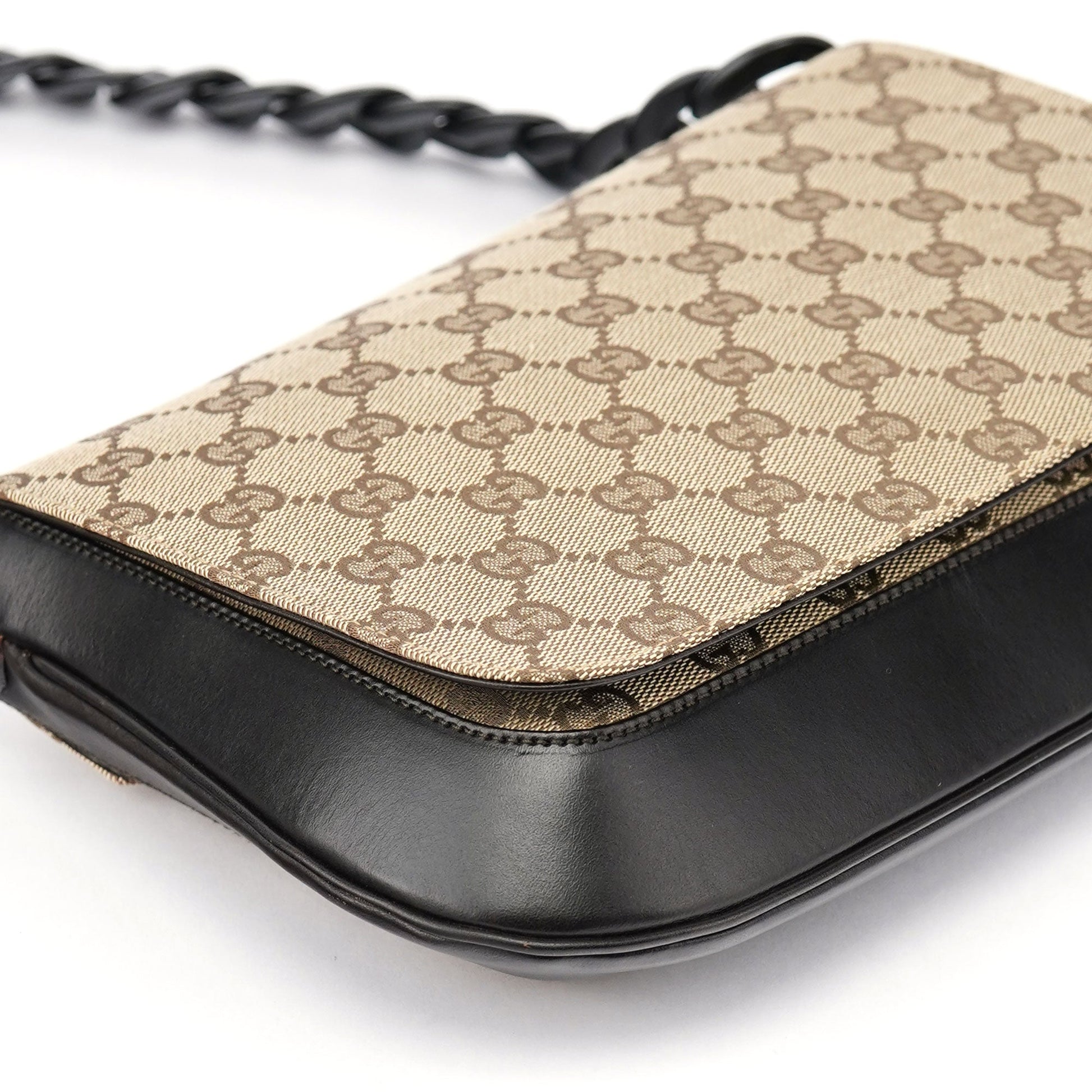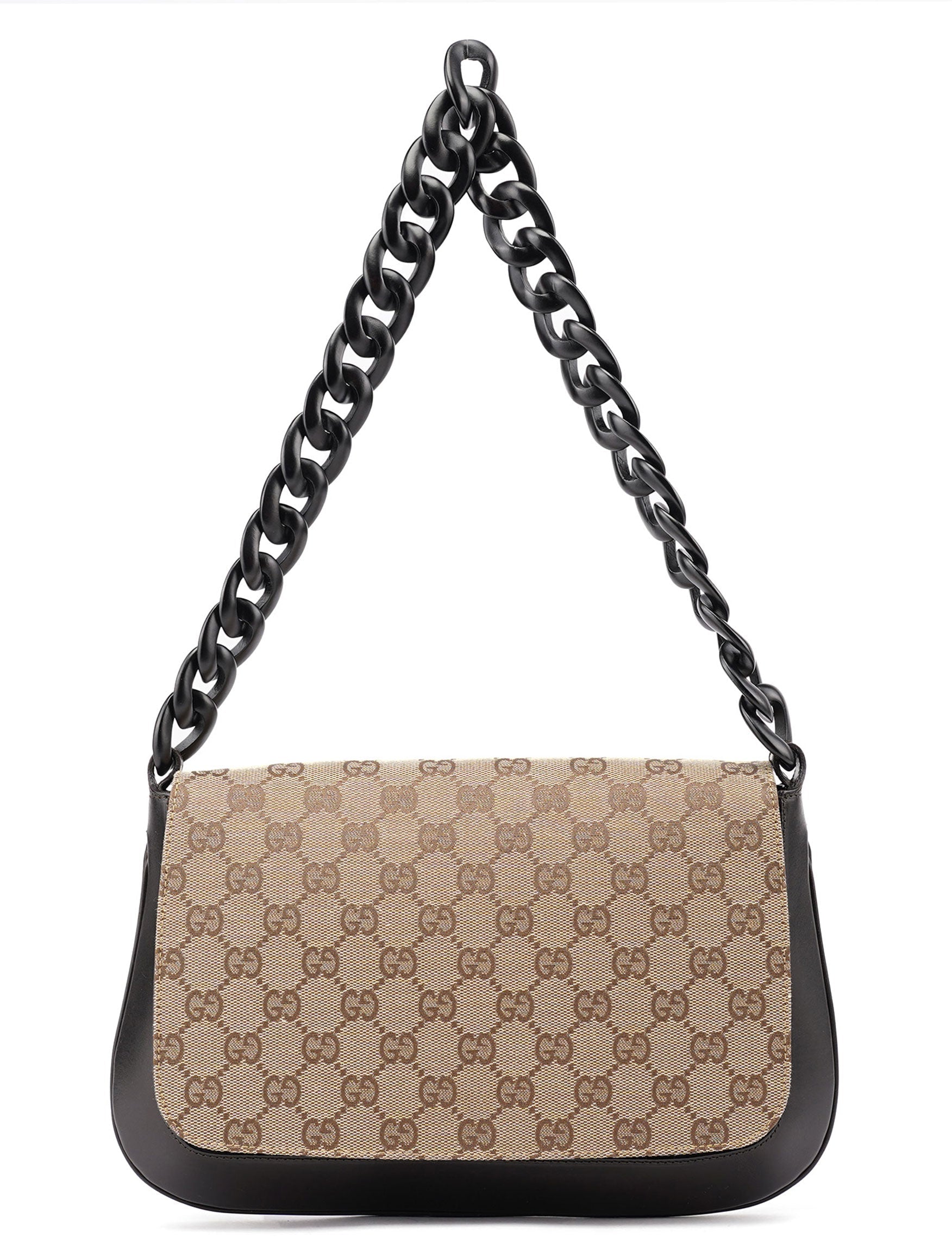 Designed by Tom Ford in the early 2000s, this rare Gucci GG Chain bag is handcrafted from beige GG monogram canvas with smooth brown leather trim. Its standout feature is the sculptural wood chain handle—a bold detail unique to this limited design. The flap opens to a satin-lined interior with a slip pocket, blending iconic branding with striking craftsmanship.