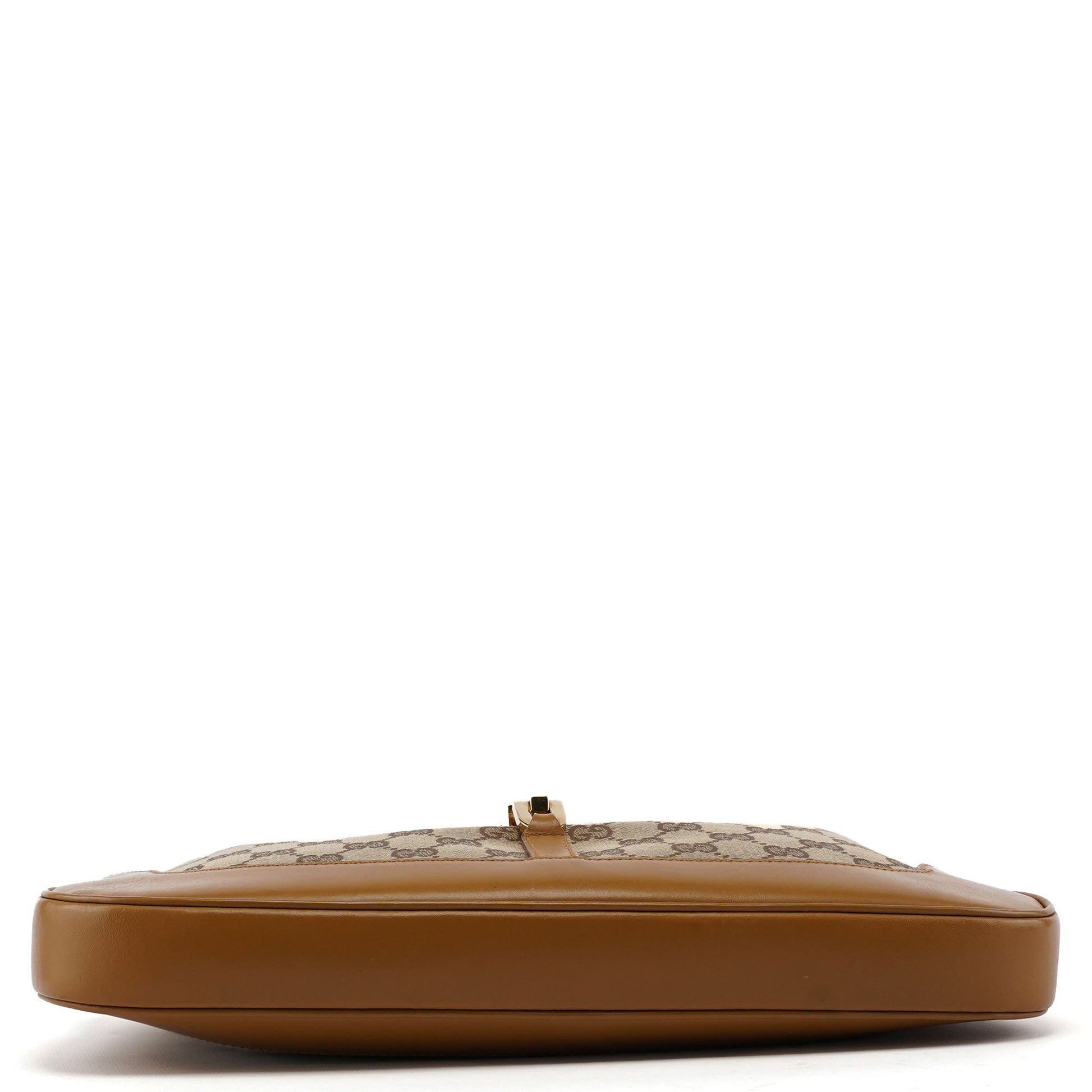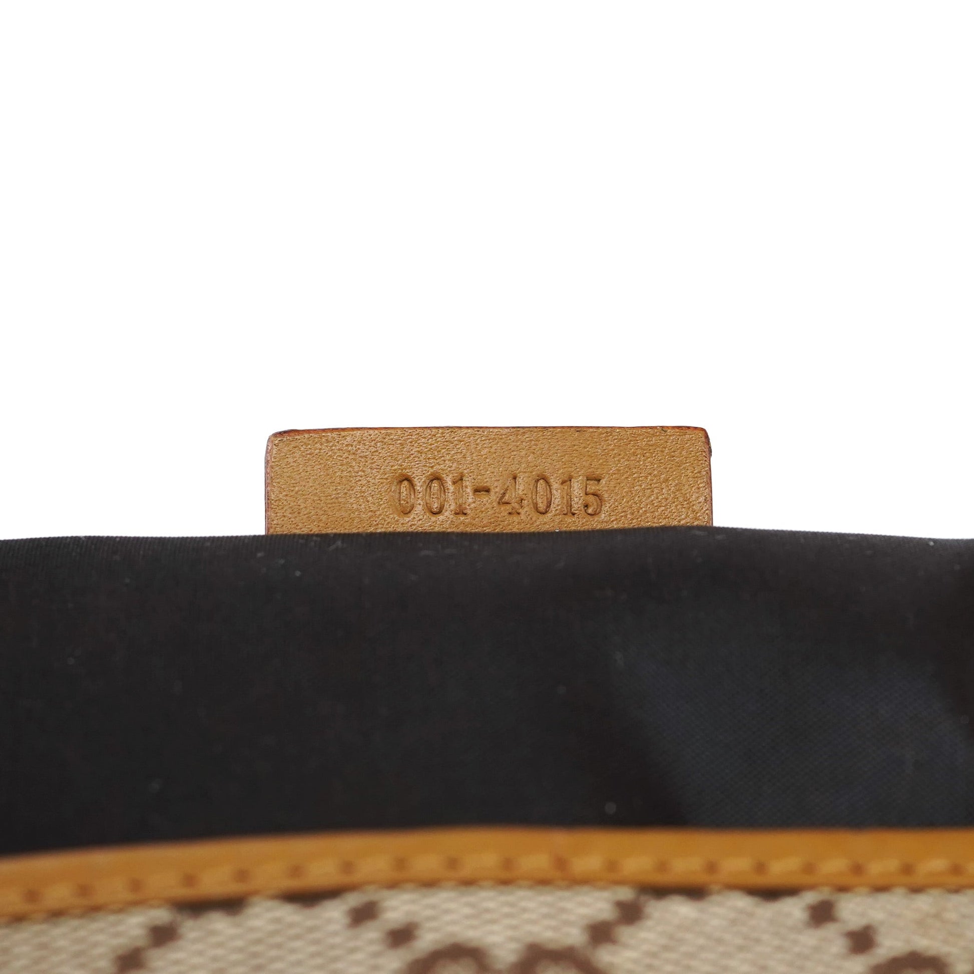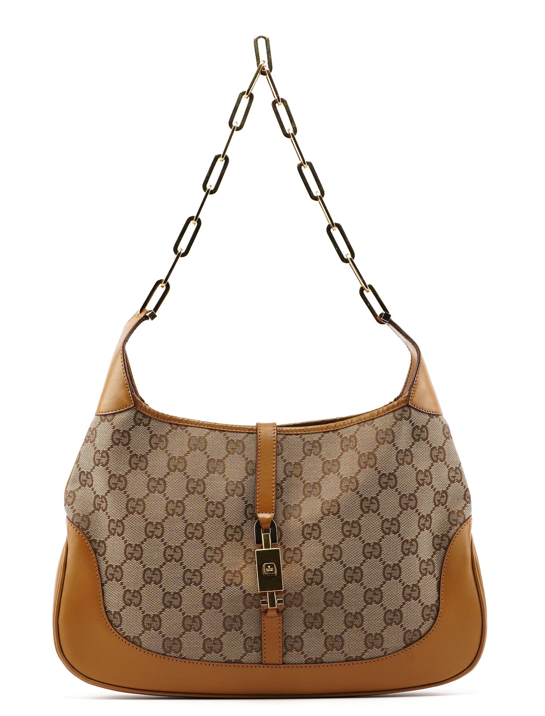 Designed by Tom Ford in the late 1990s, this Gucci GG Jackie chain shoulder bag showcases a perfect blend of beige GG monogram canvas and tonal leather trim. The gold-tone chain handle, engraved with the Gucci logo, complements the iconic Jackie clasp closure. Inside, the satin-lined interior offers a touch of luxury, making this piece a timeless representation of Gucci’s classic elegance under Ford’s visionary direction.