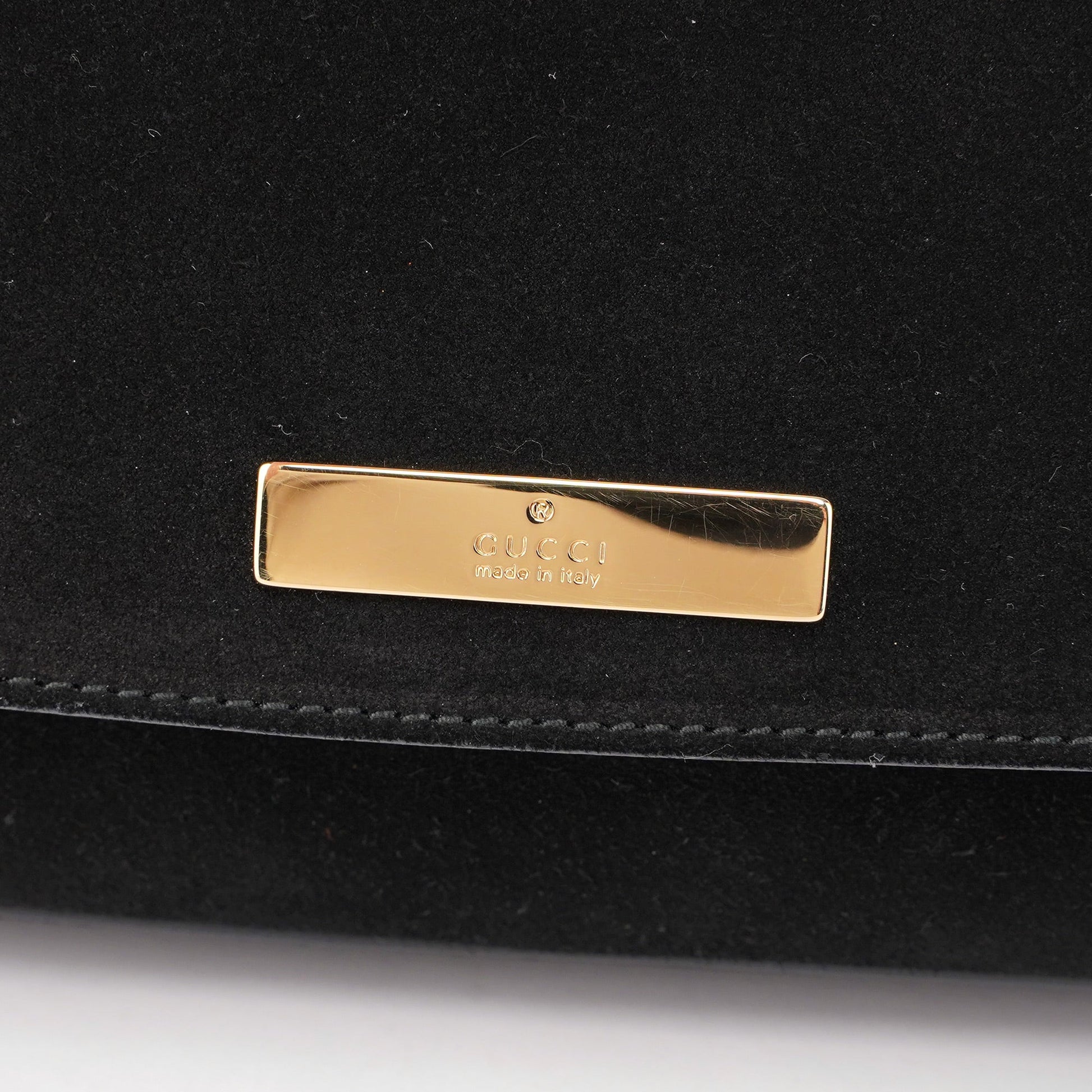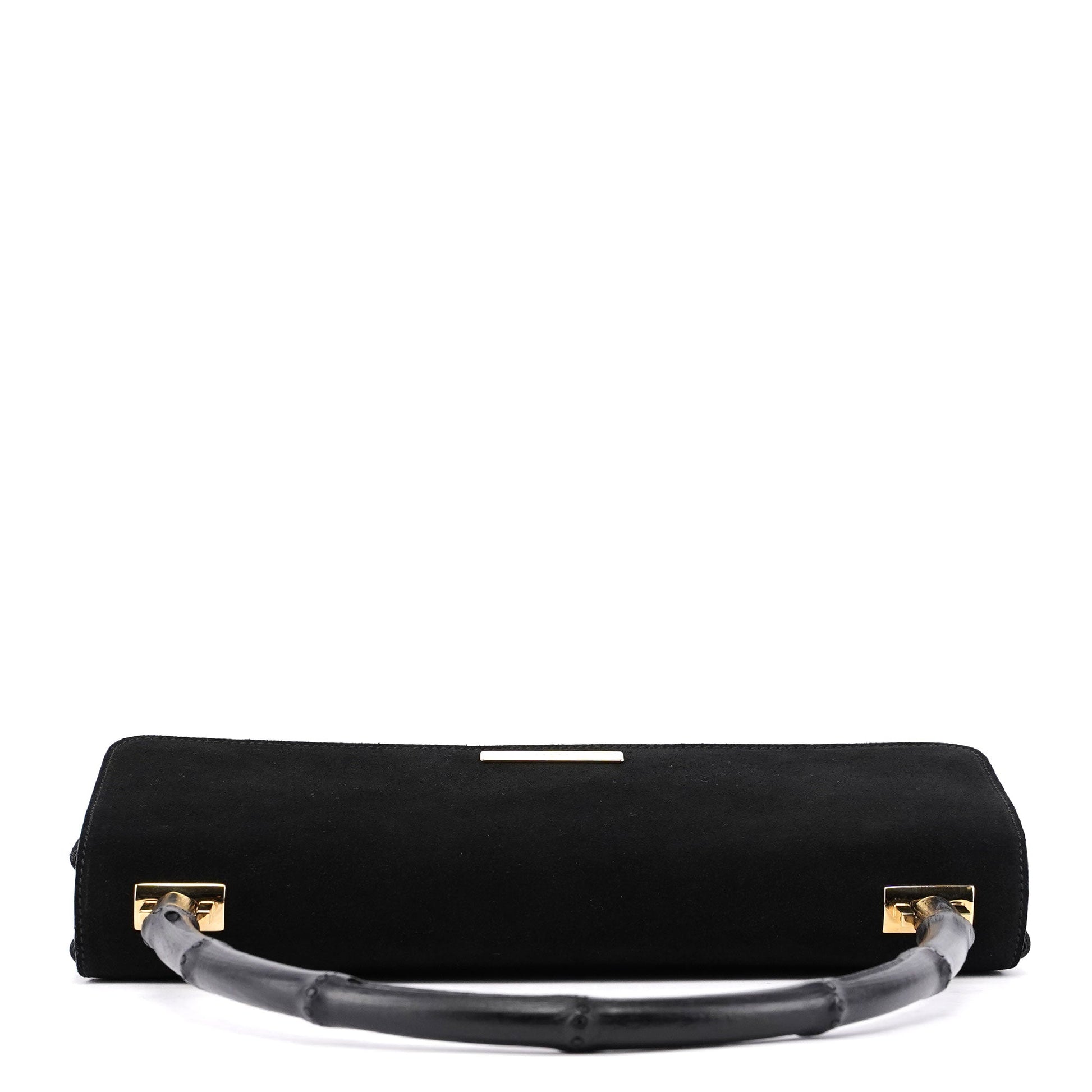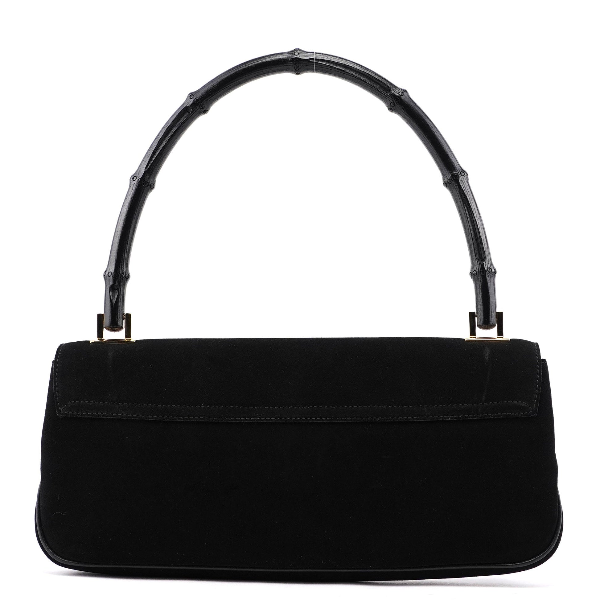Designed by Tom Ford in the late 1990s, the Gucci Bamboo handbag is handcrafted from luxurious black suede and features gold-tone hardware with a bamboo handle including Gucci logo engraving. The magnetic closure opens to a satin-lined interior with an interior zipper pocket. The Gucci logo plate adorns the front, showcasing timeless elegance.