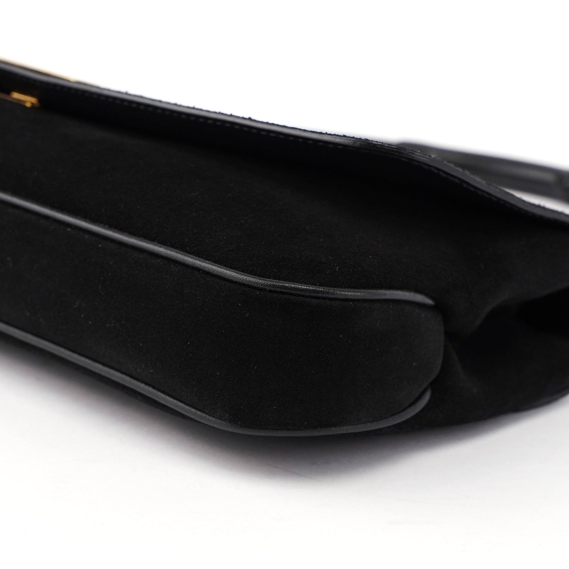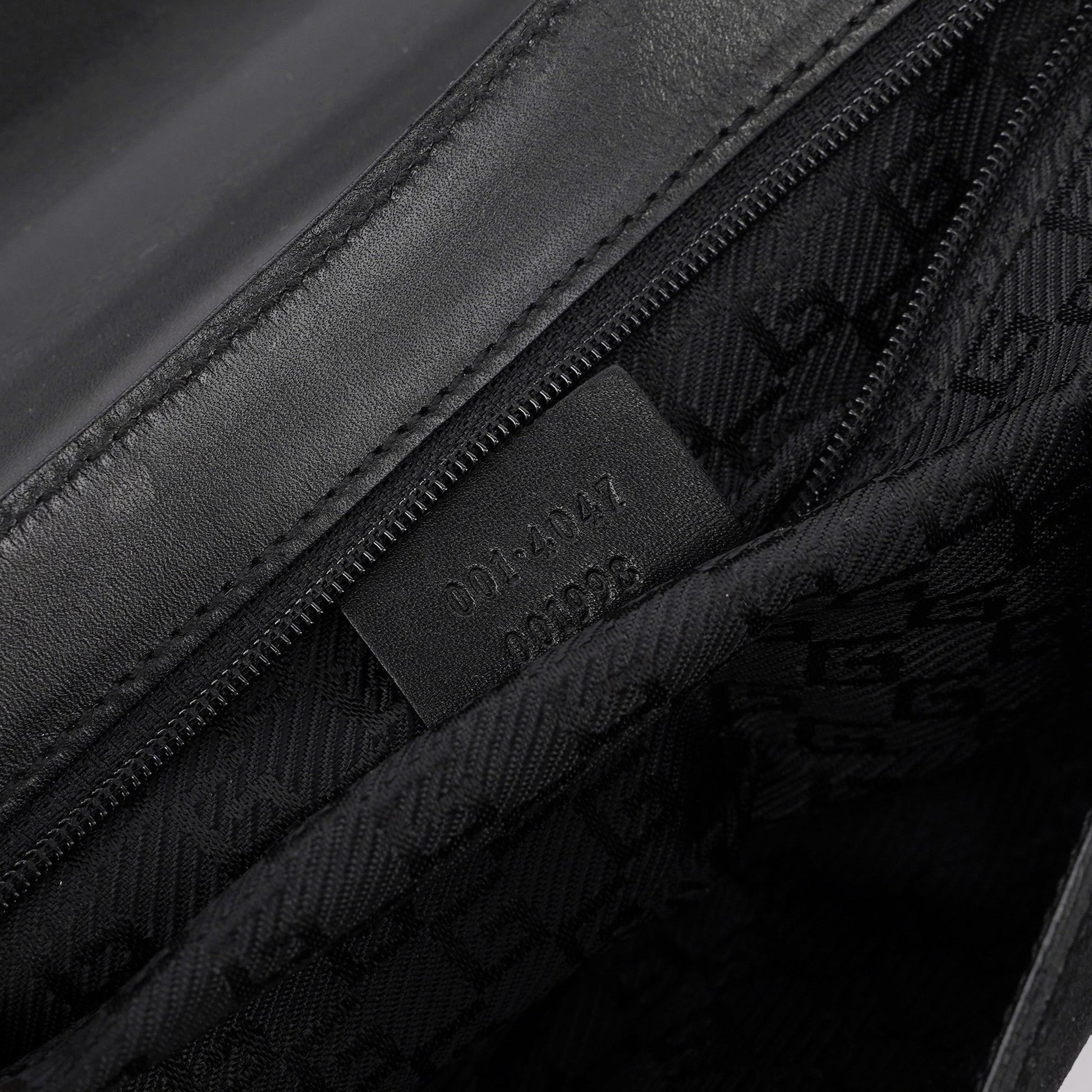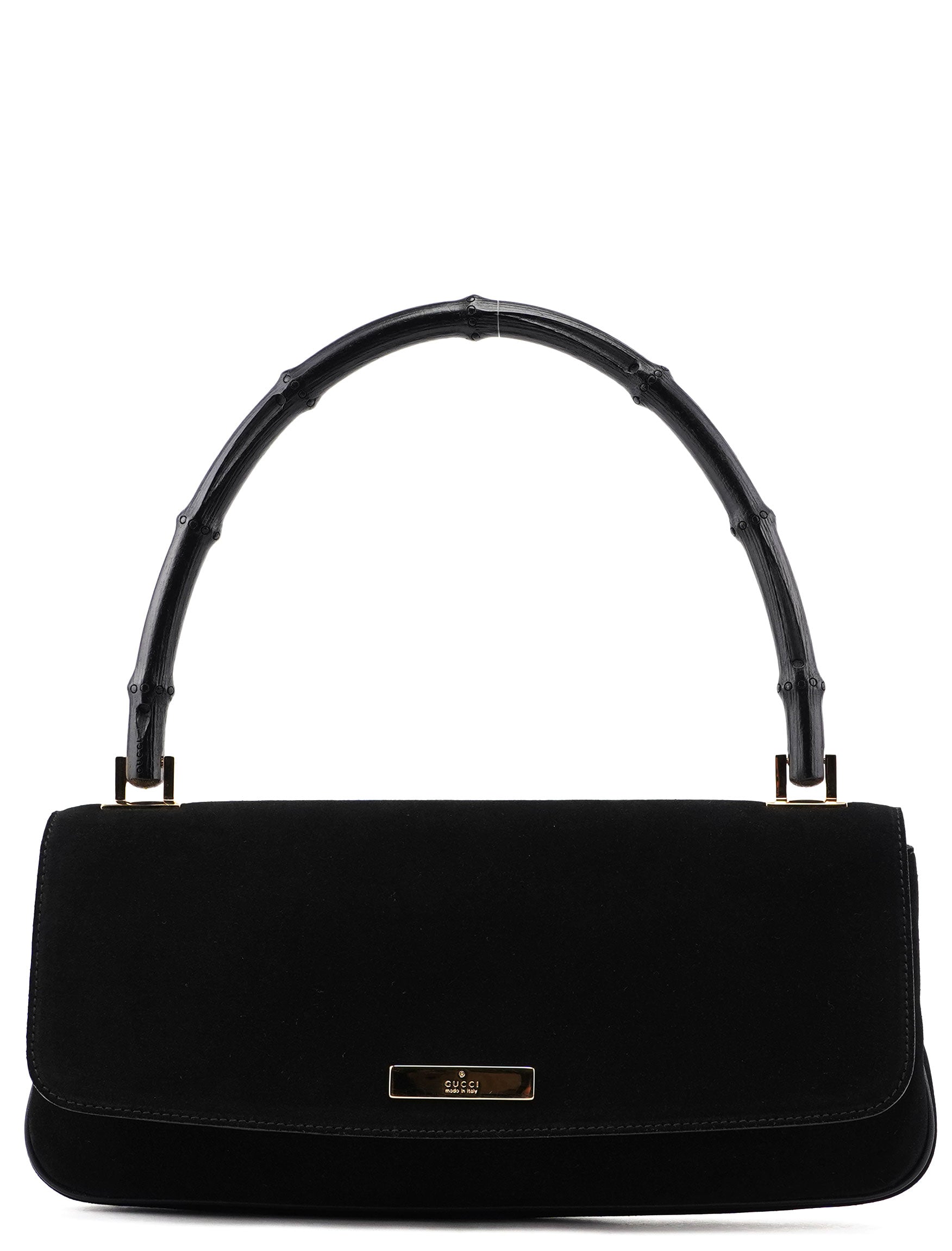 Designed by Tom Ford in the late 1990s, the Gucci Bamboo handbag is handcrafted from luxurious black suede and features gold-tone hardware with a bamboo handle including Gucci logo engraving. The magnetic closure opens to a satin-lined interior with an interior zipper pocket. The Gucci logo plate adorns the front, showcasing timeless elegance.
